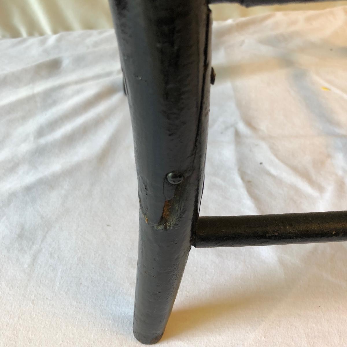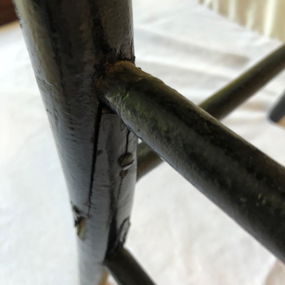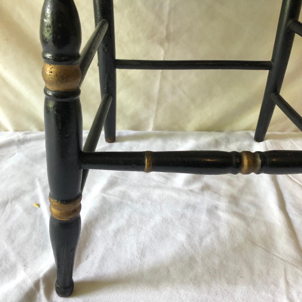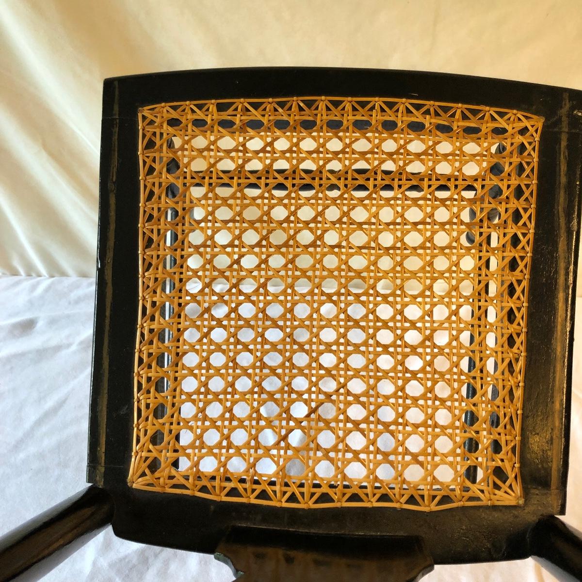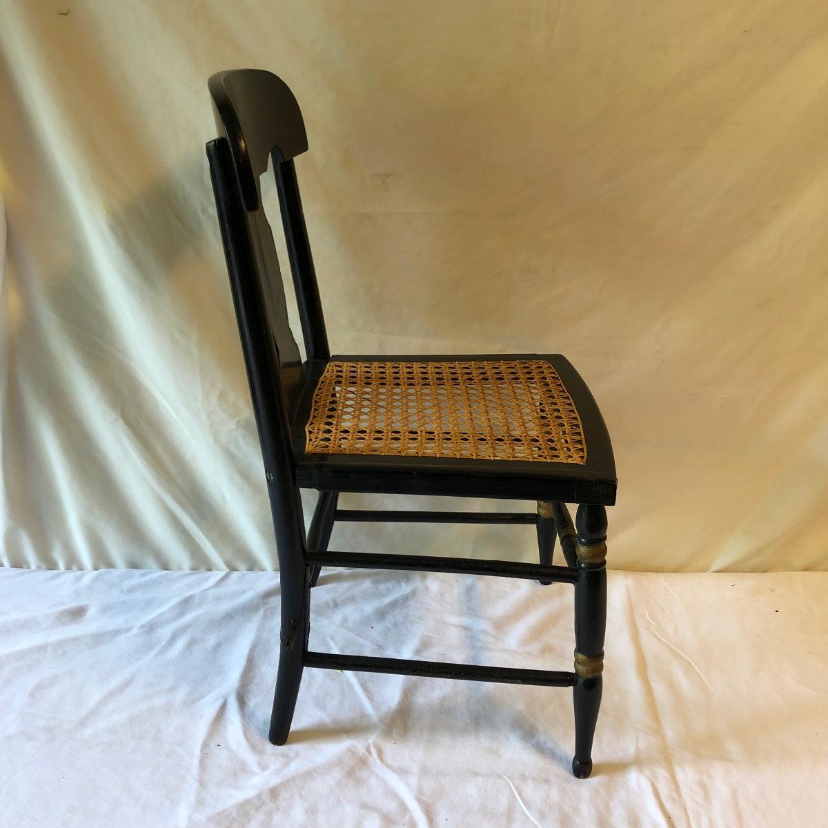Lot includes a black wooden cane bottom chair with gold colored accent paint. Chair has been repaired on one leg, but is still sturdy, see pictures. Chair measures 15.5” x 16” x 28” with a seat height of 14.5”.