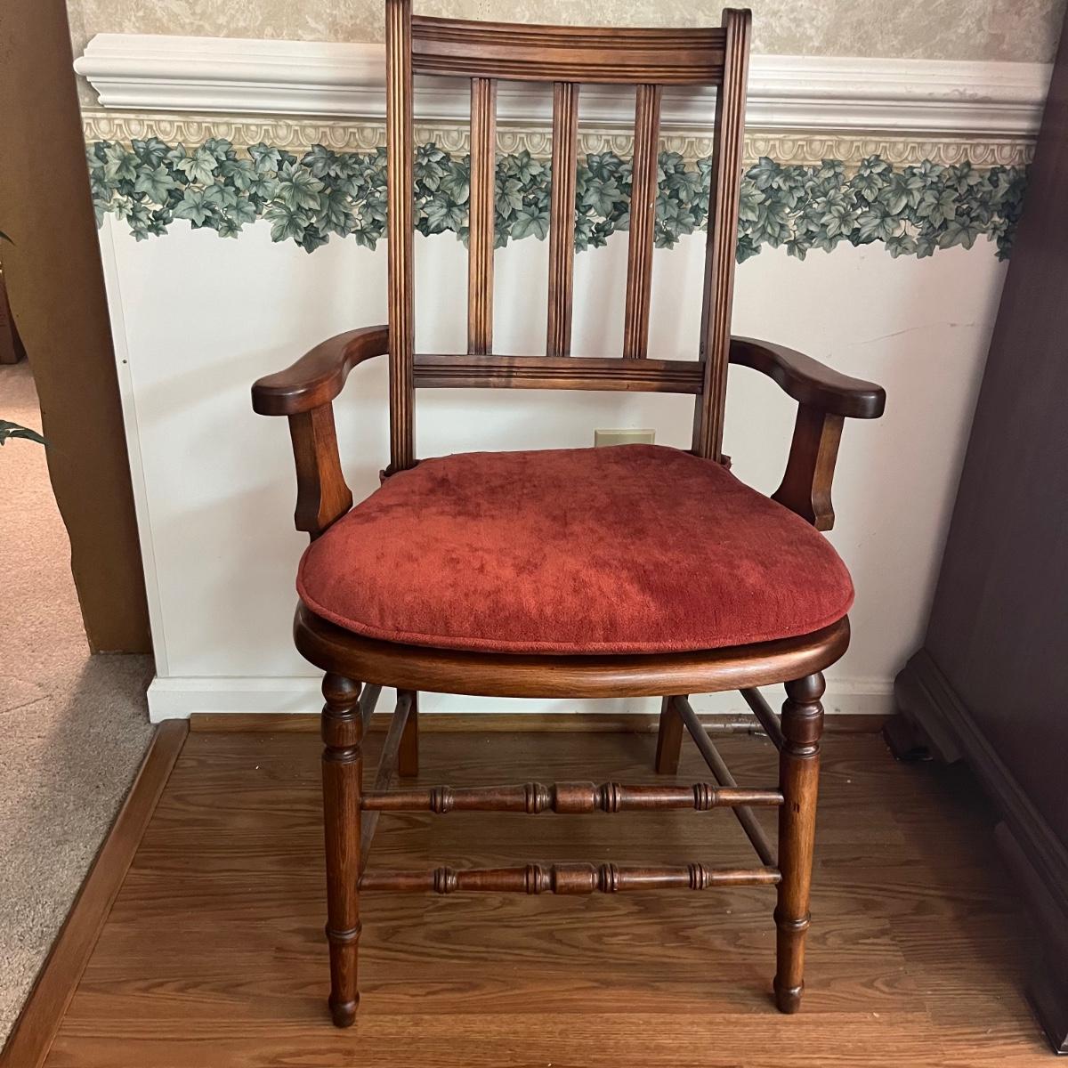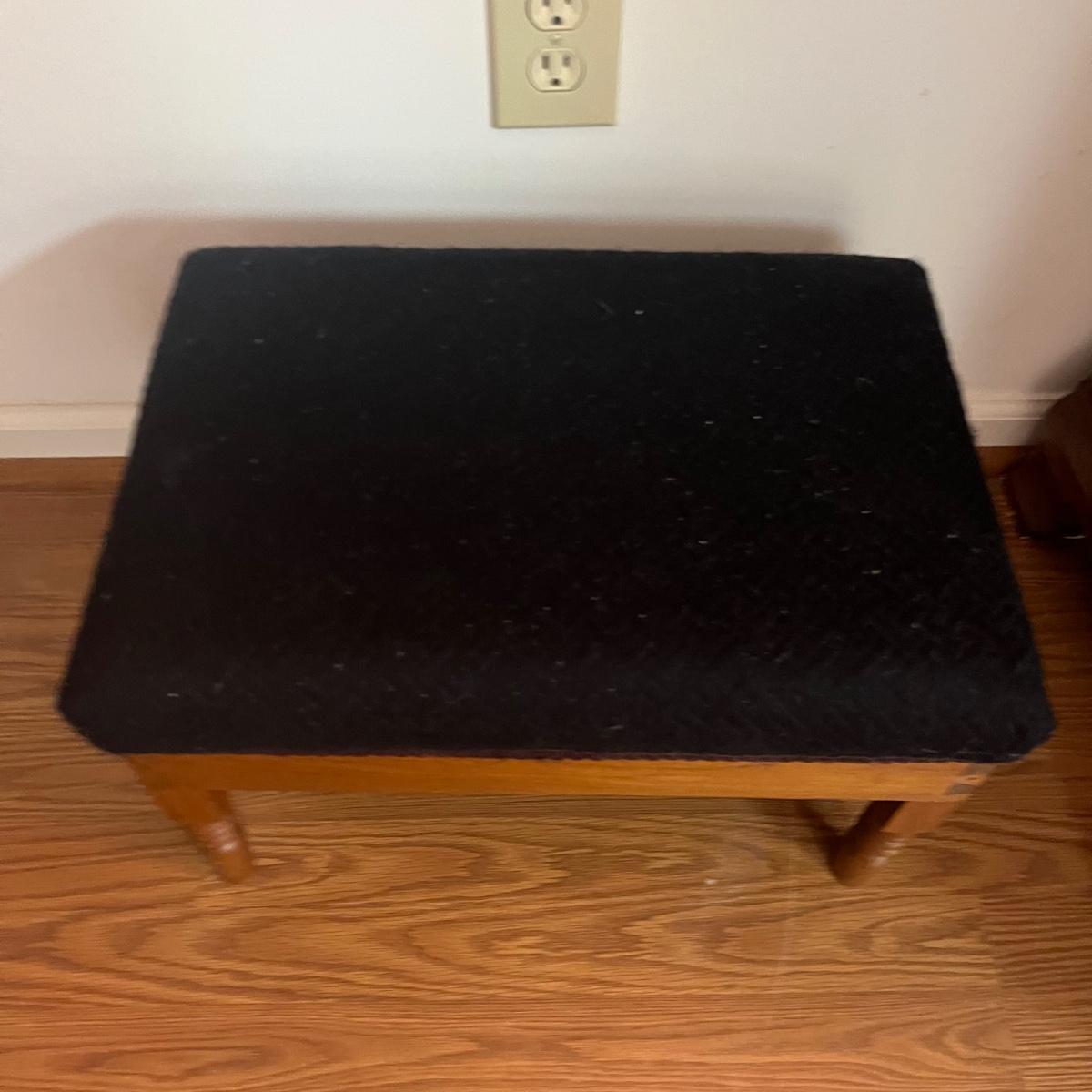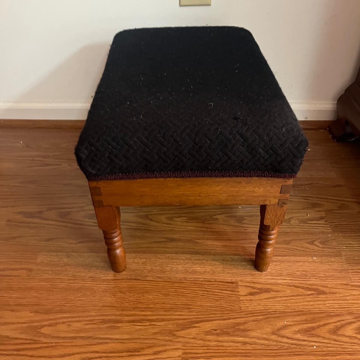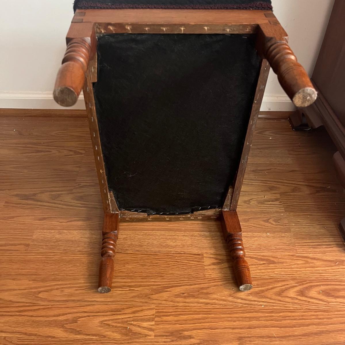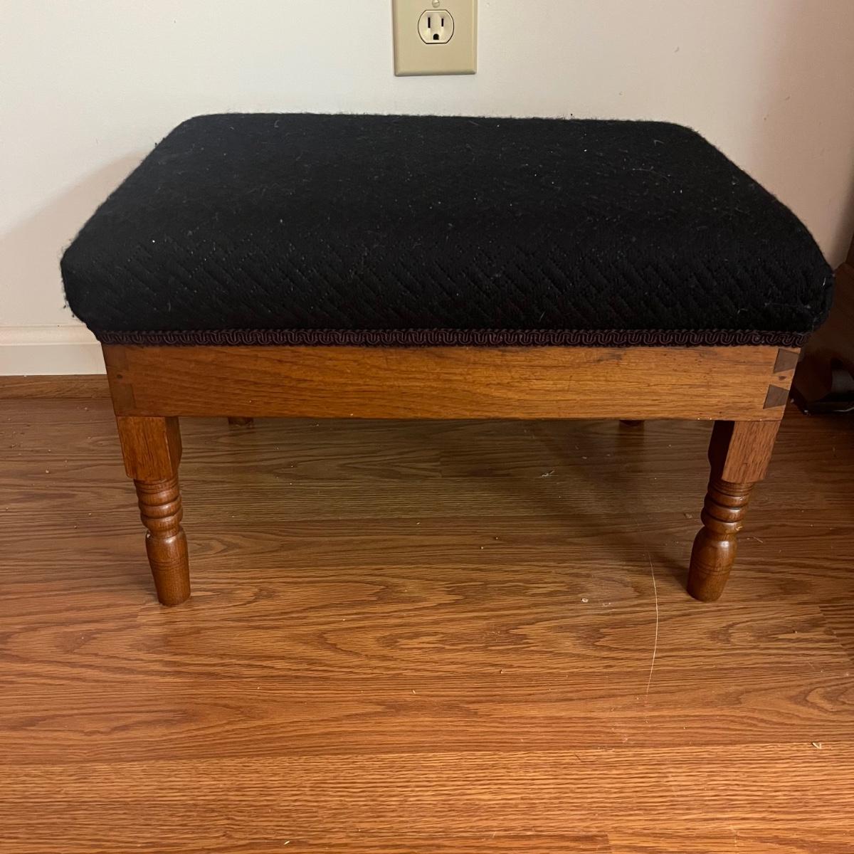 Lot includes a wooden chair with a cane seat and removable cushion. Also includes padded footstool. Chair measures 23.5” x 21” x 37.5” with a 19” seat height.