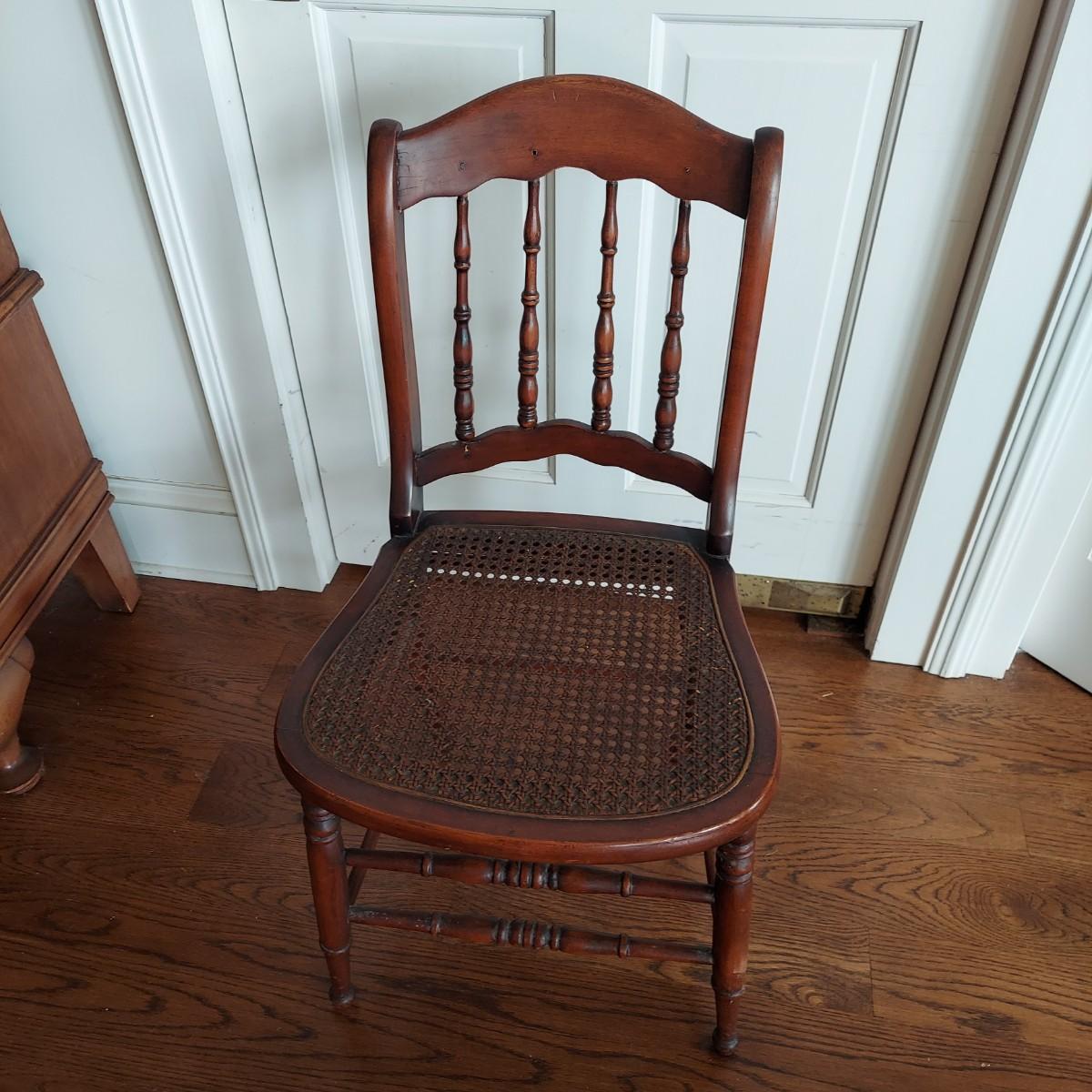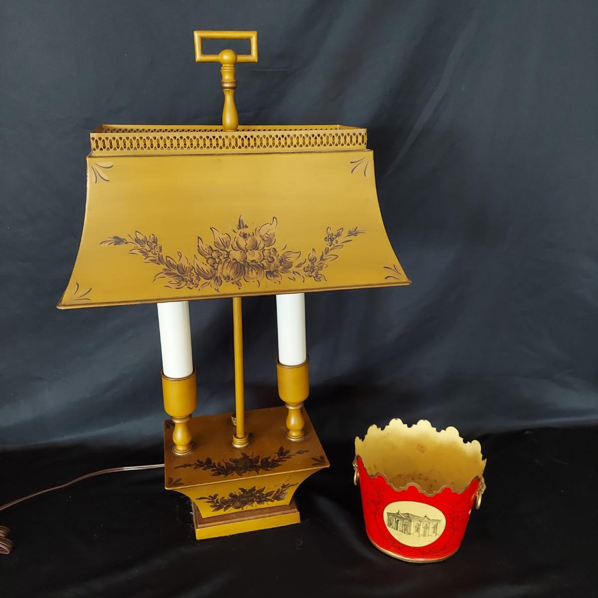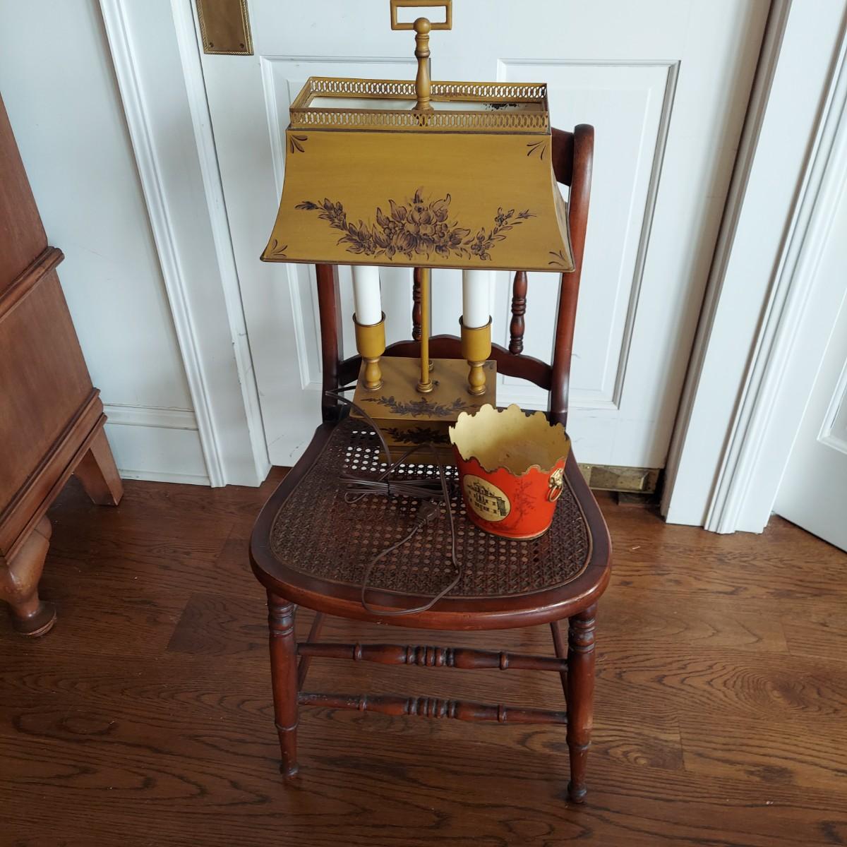 Lot includes a wooden chair with a cane seat as well as a metal lamp and a metal bucket. The chair measures 17” x 17” x 33"H w/ a 17.5"H seat height. The lamp has a knob on the base that turns it on and off. It measures 13” x 7” x 23"H. Please see photos for details. Local Pickup Only