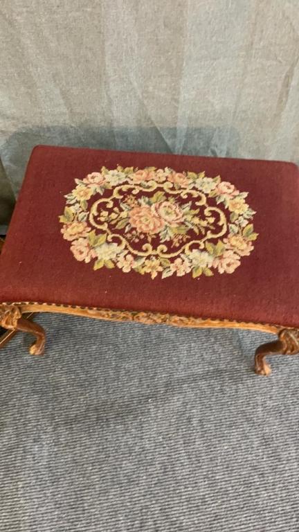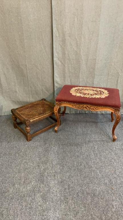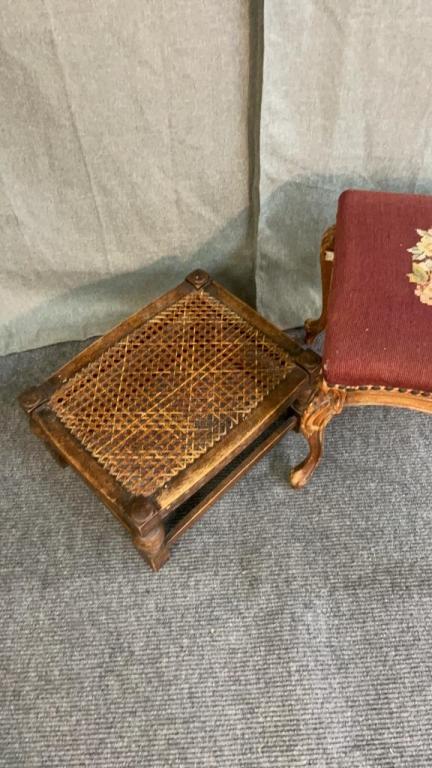 Cane seat stool & Needlepoint Ottoman