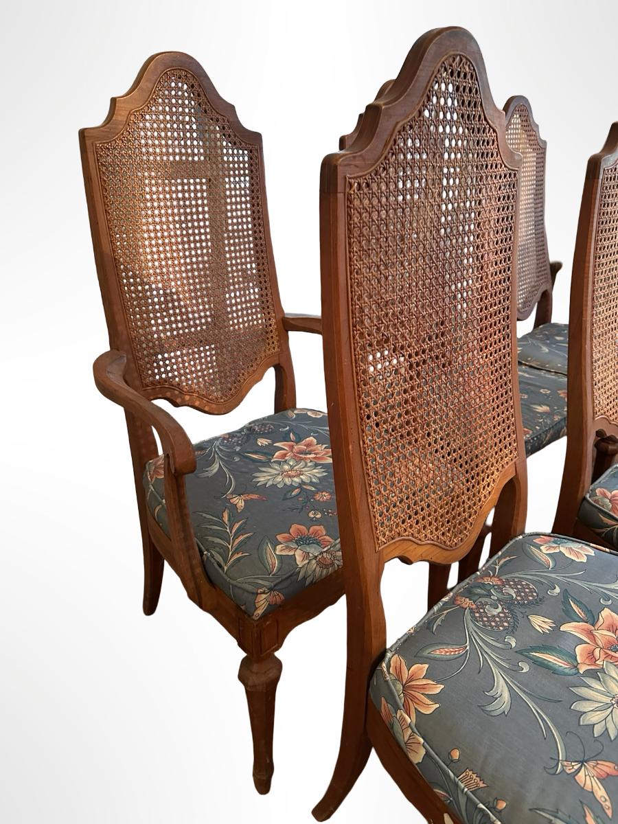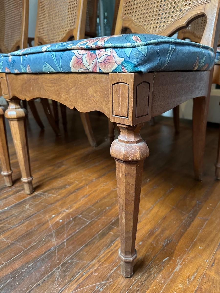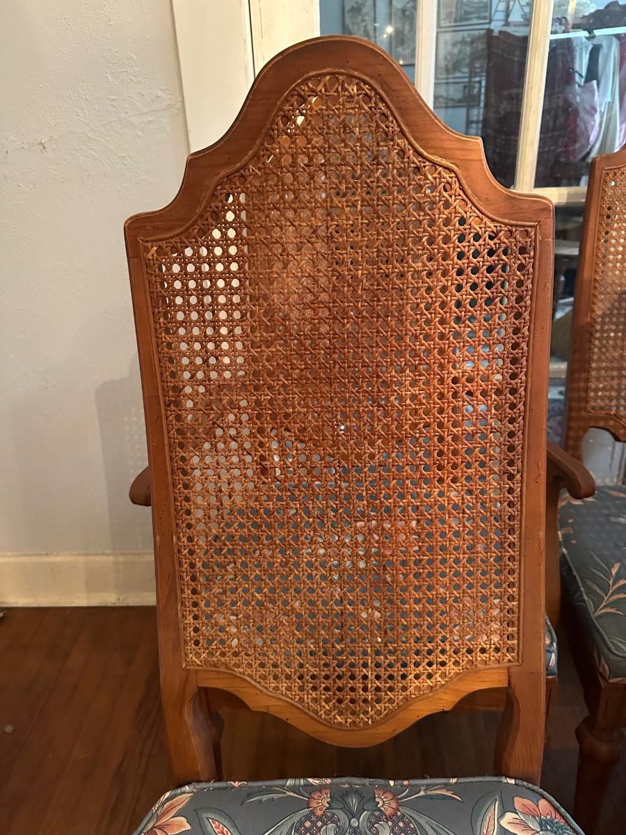 One arm chair. One chair has damage to the cane (see photos). A few other chairs are starting to show damage to the top of the cane. Solid and well-crafted, ideal for restoration or use as-is.
