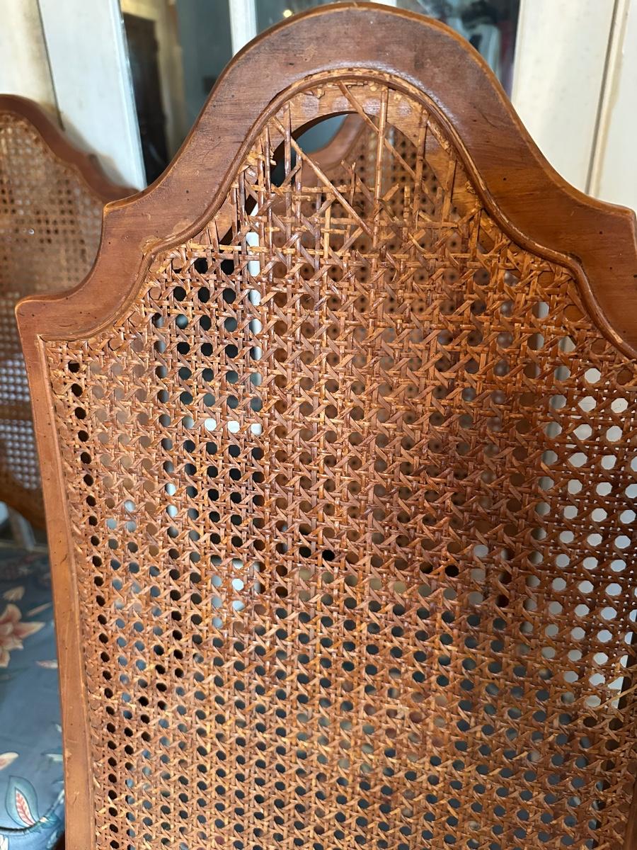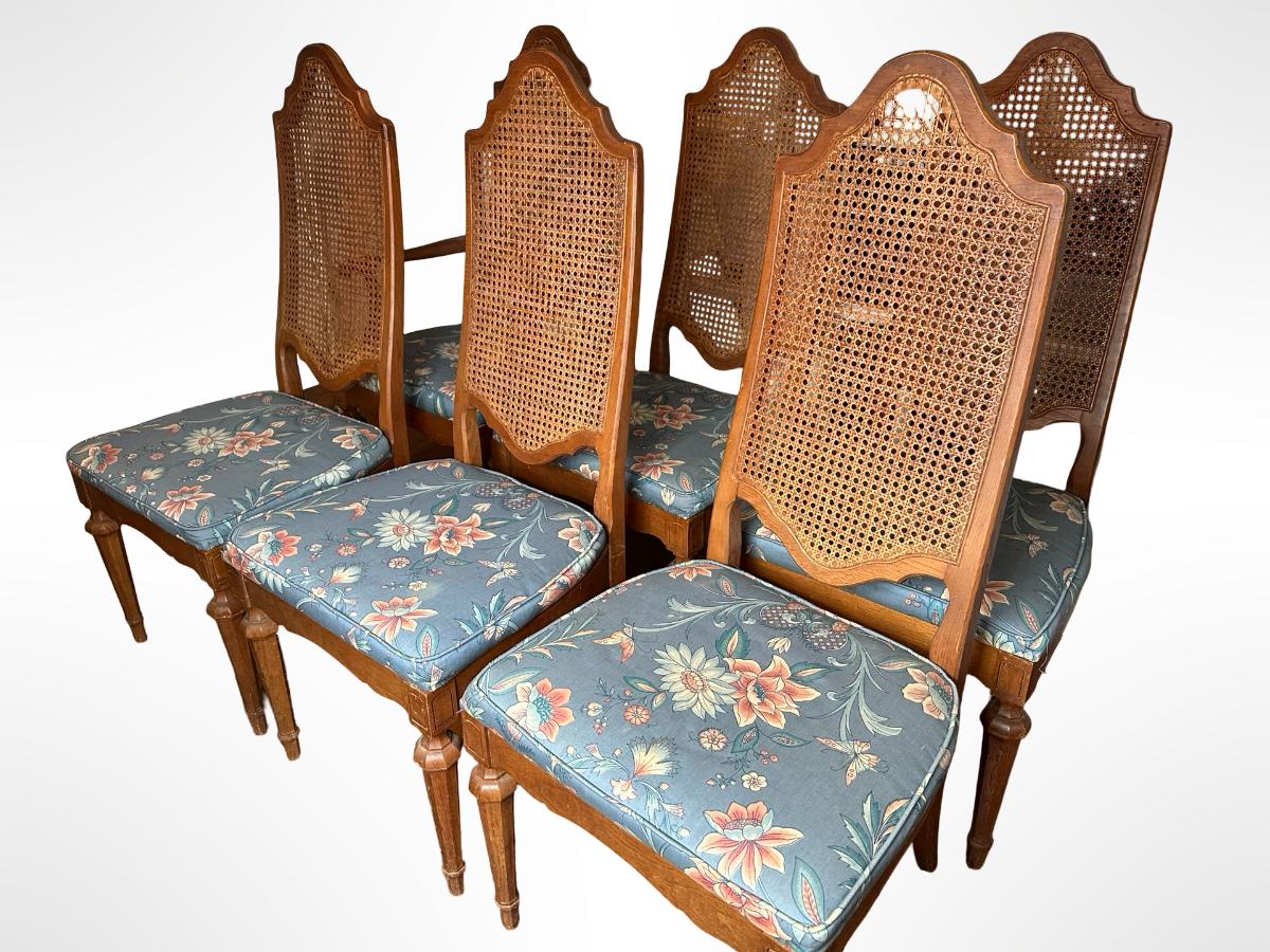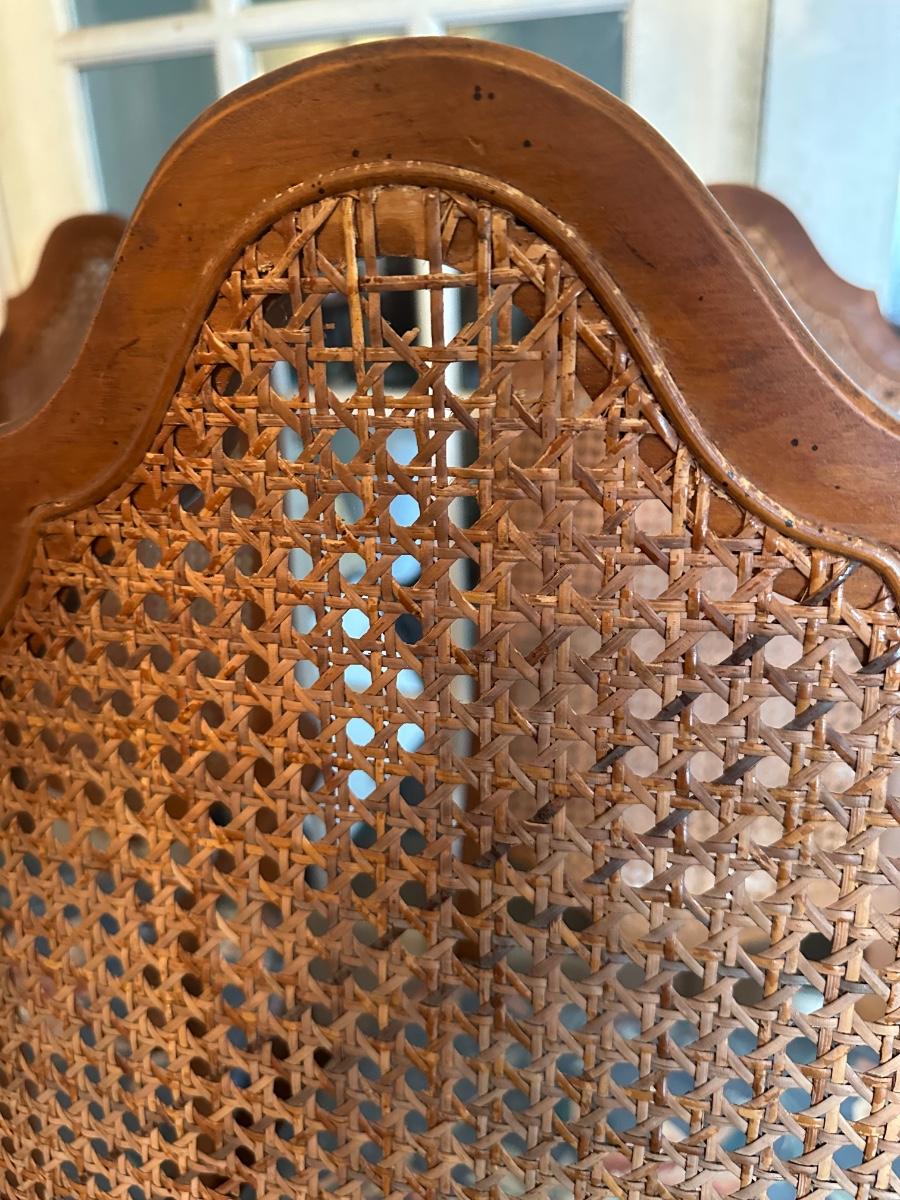 One arm chair. One chair has damage to the cane (see photos). A few other chairs are starting to show damage to the top of the cane. Solid and well-crafted, ideal for restoration or use as-is.