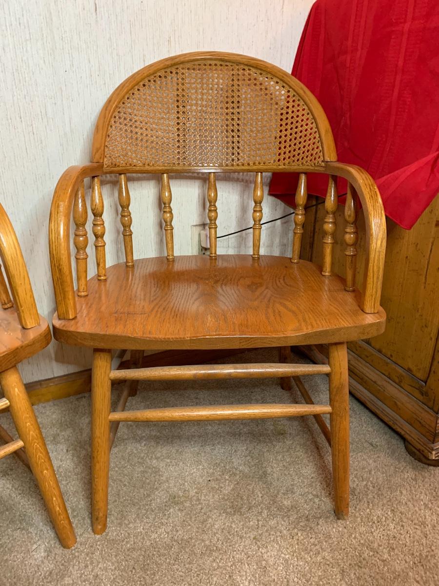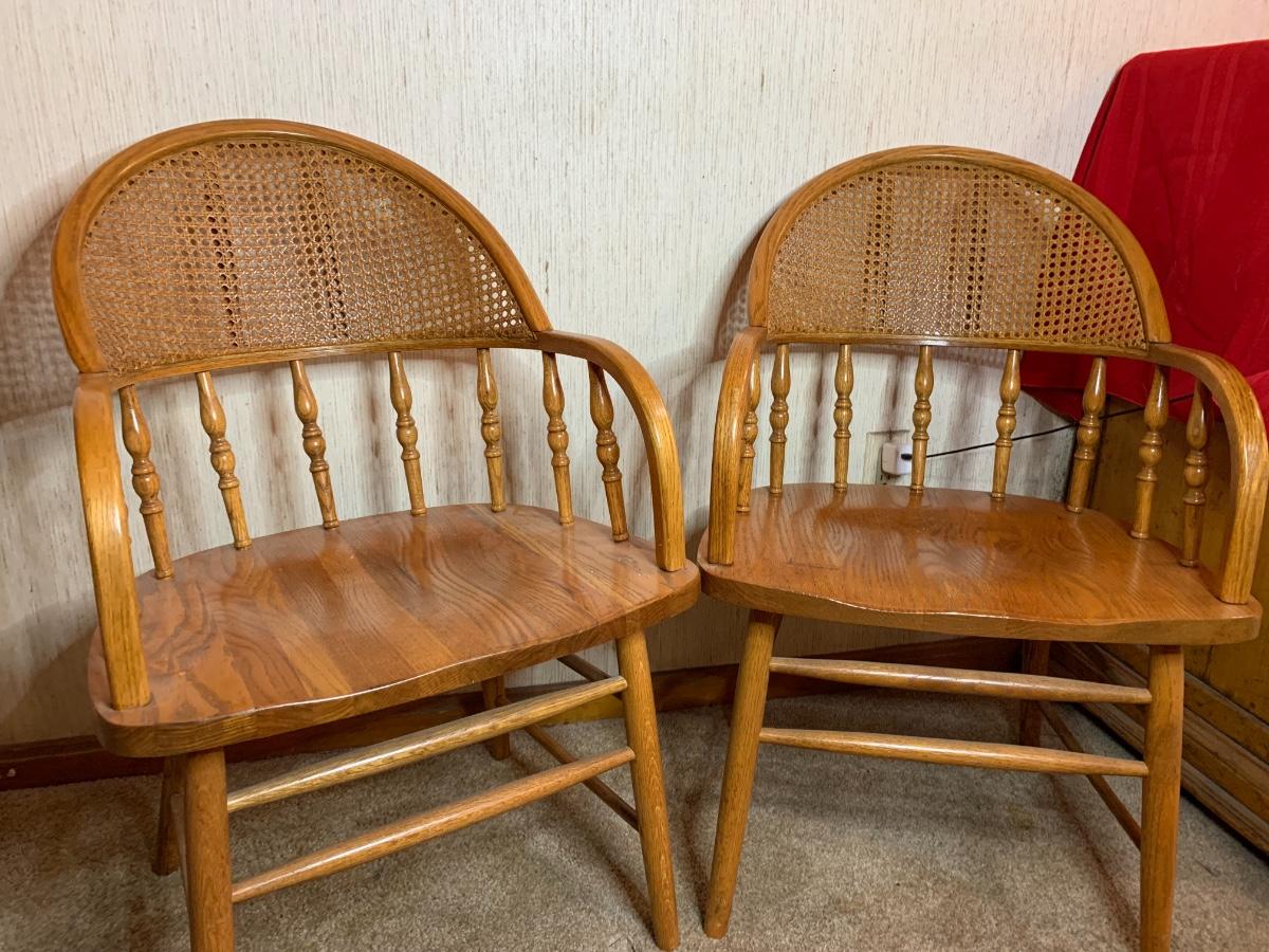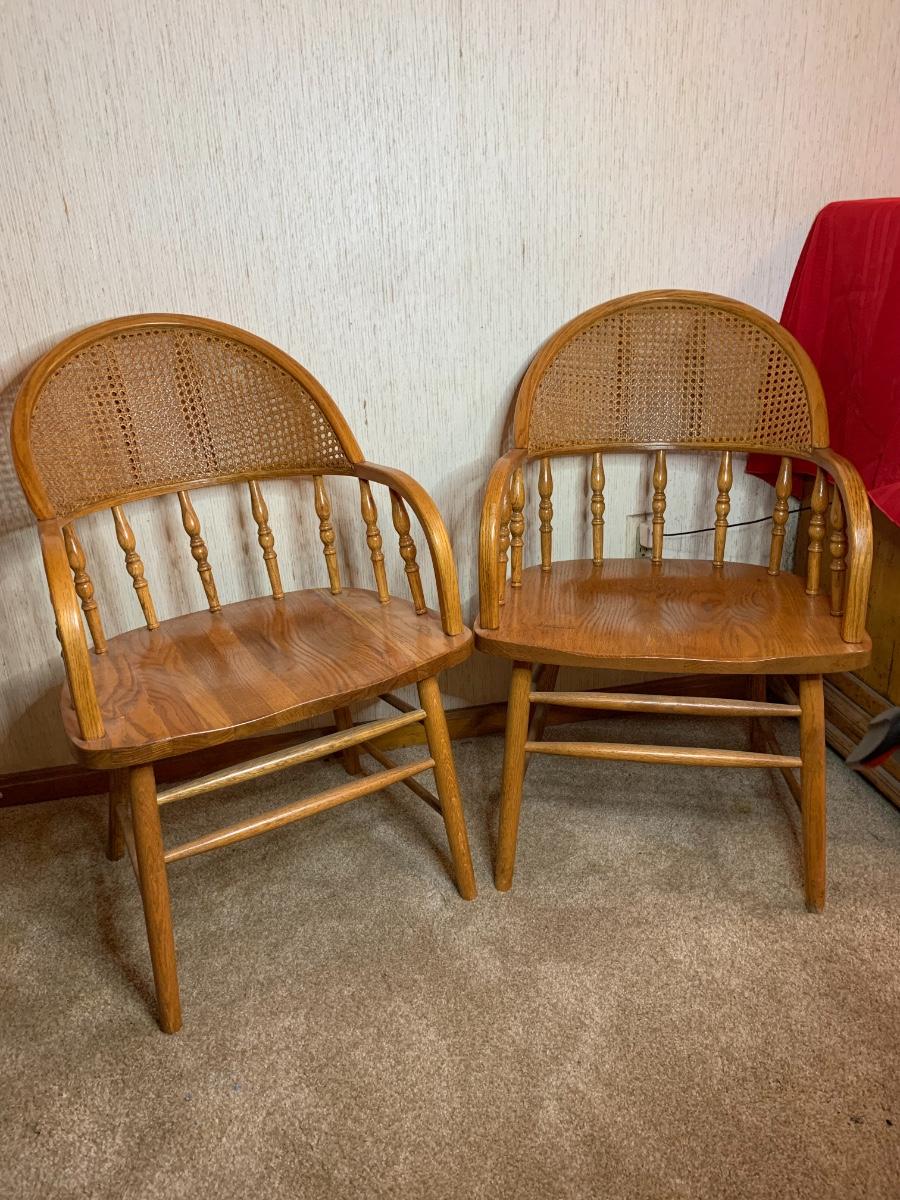 Two oak chairs, 33 inches in height and 17 inch seat height and 16.5 inch seat depth