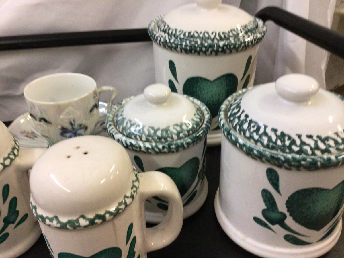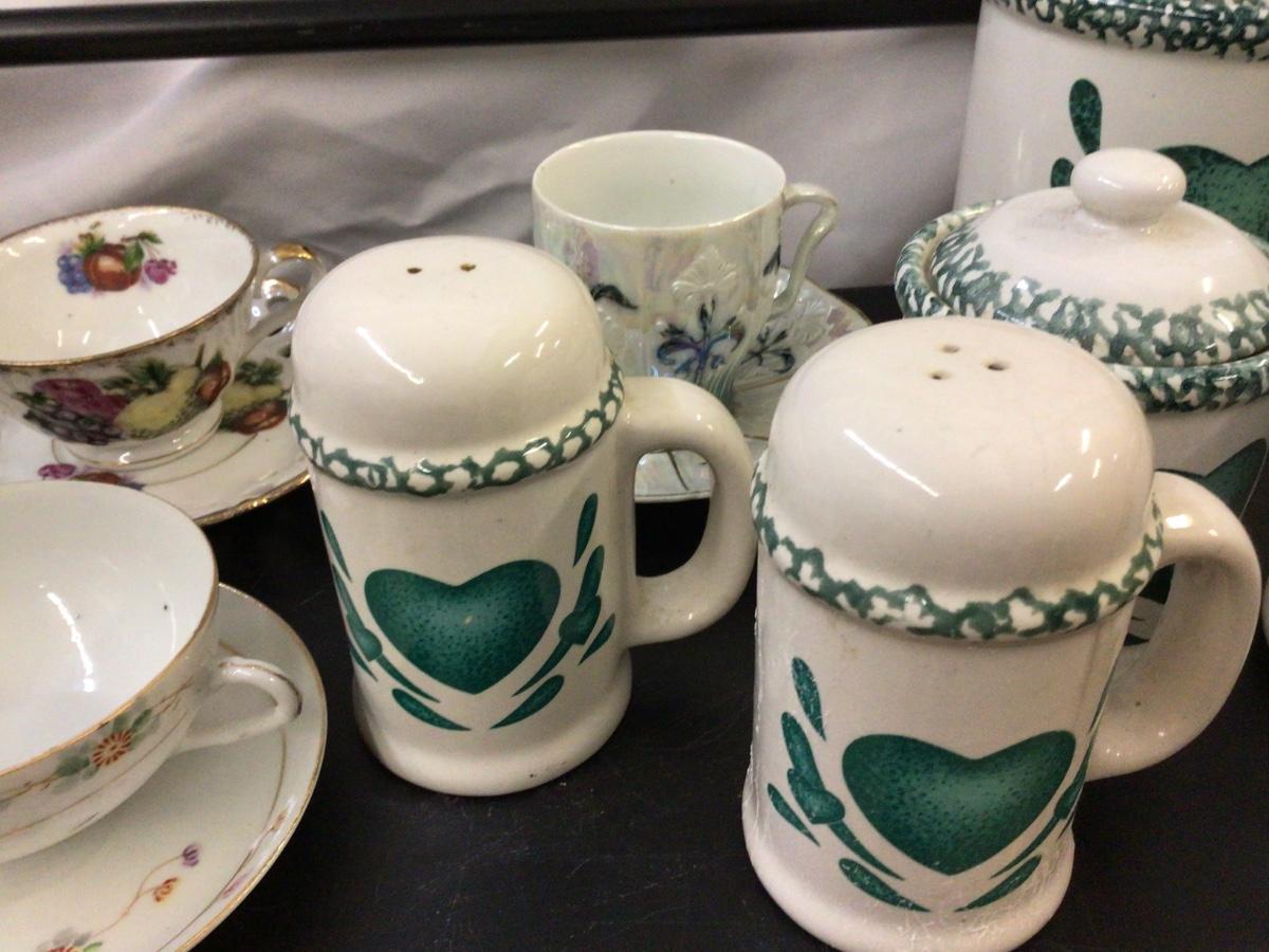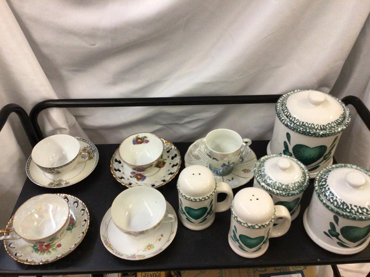 You get a great set of three canister with green hearts and matching large salt and pepper. You also get 5 cups and saucer. Three are name brand,one Sonscon, Enesco, and Meita