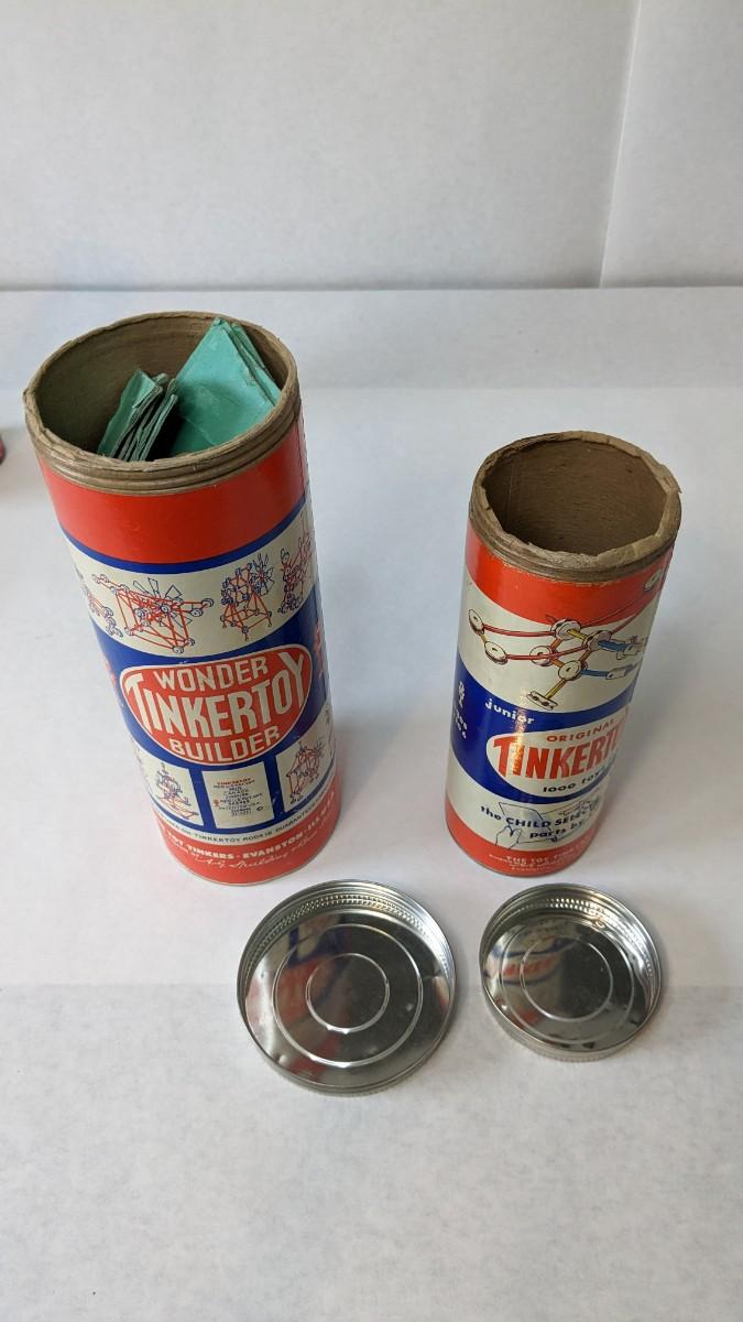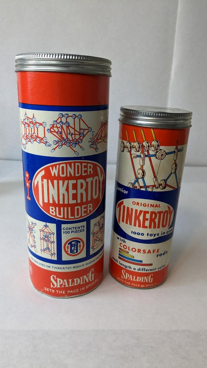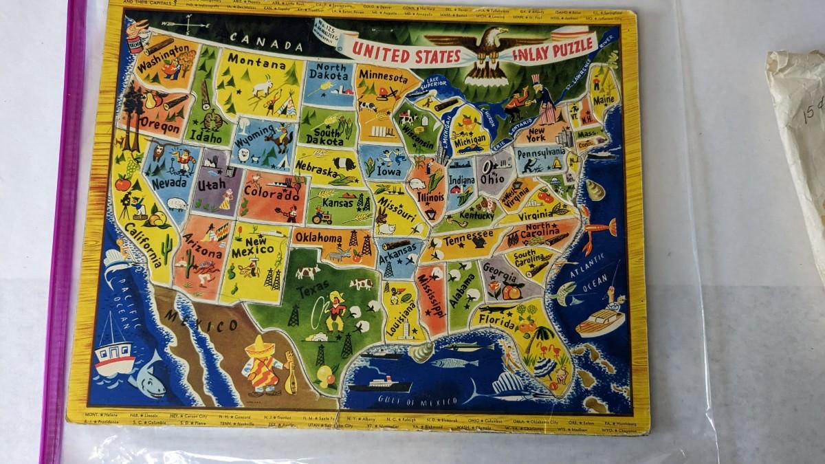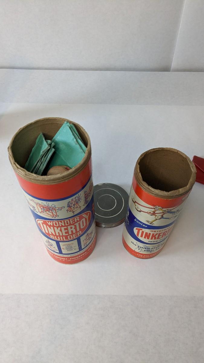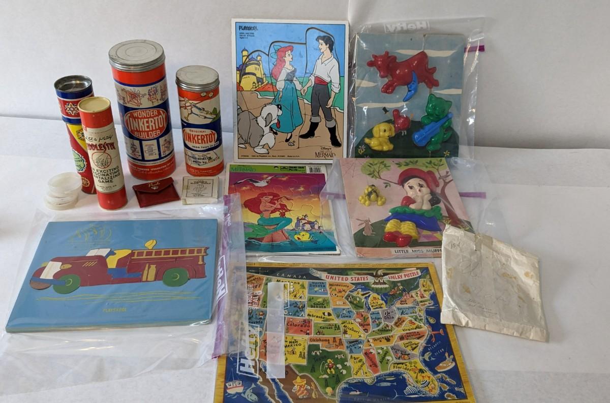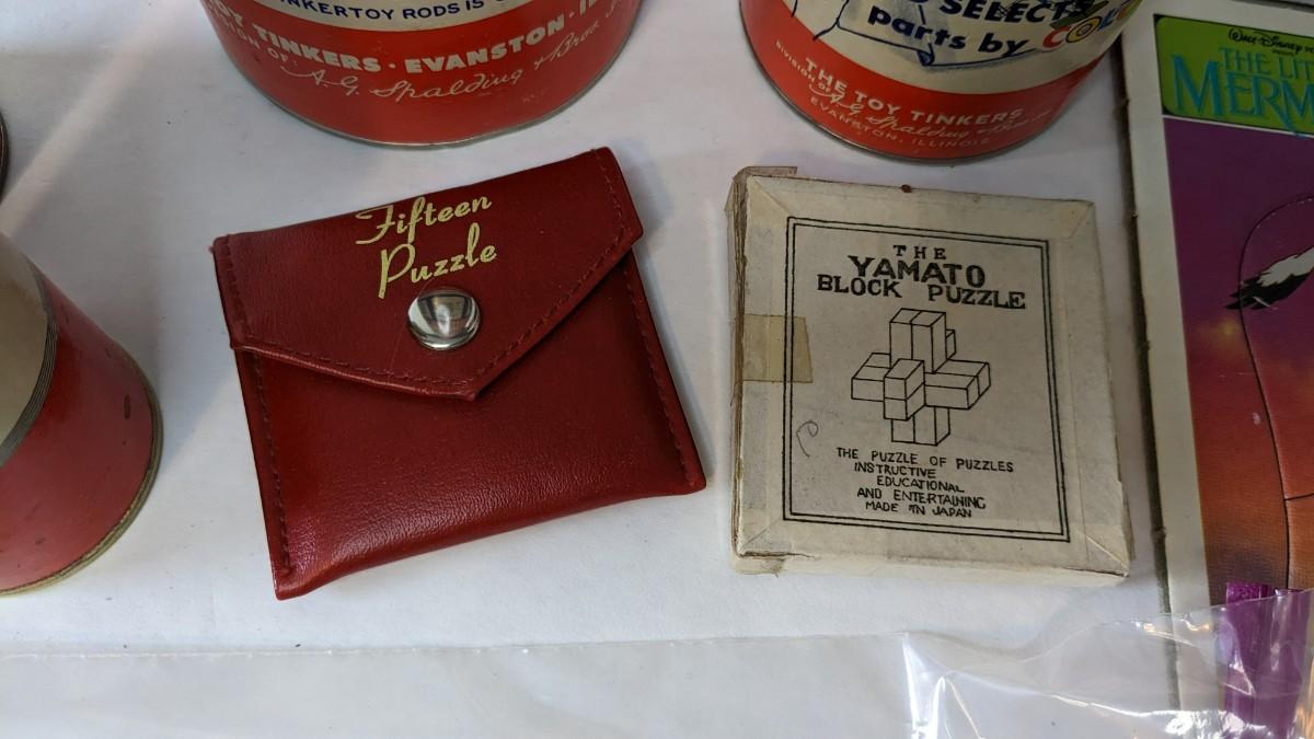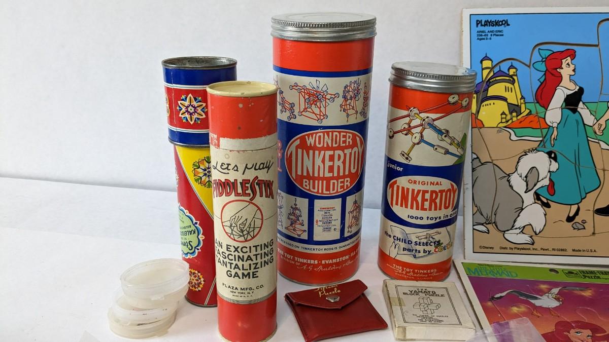 2 Tinker Toy canisters, kaleidoscope with interchangeable inserts and extra confetti, and fiddlestix with stix intact. Also includes some really incredible 3D puzzles from the 50's, cardboard US map puzzles that are pre Alaska and Hawaii, with some 90's puzzles and other wood puzzles. A great display and decorator assortment!