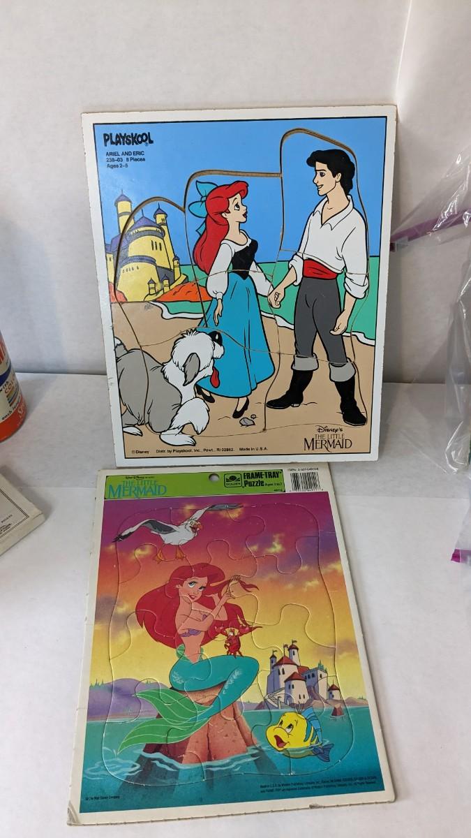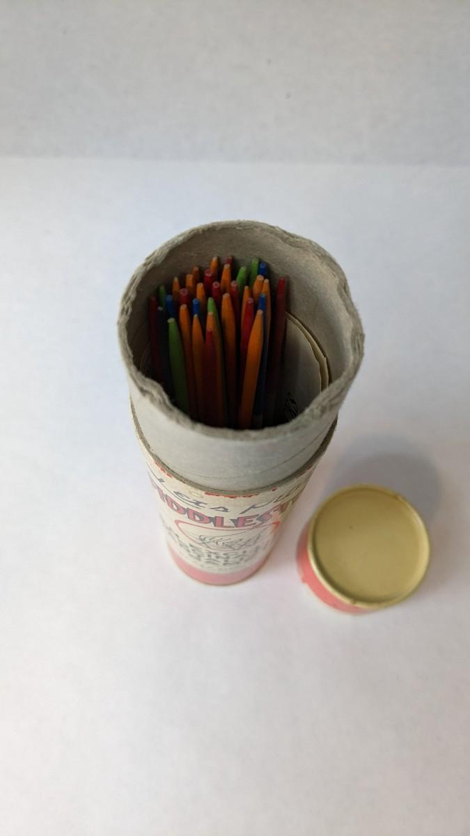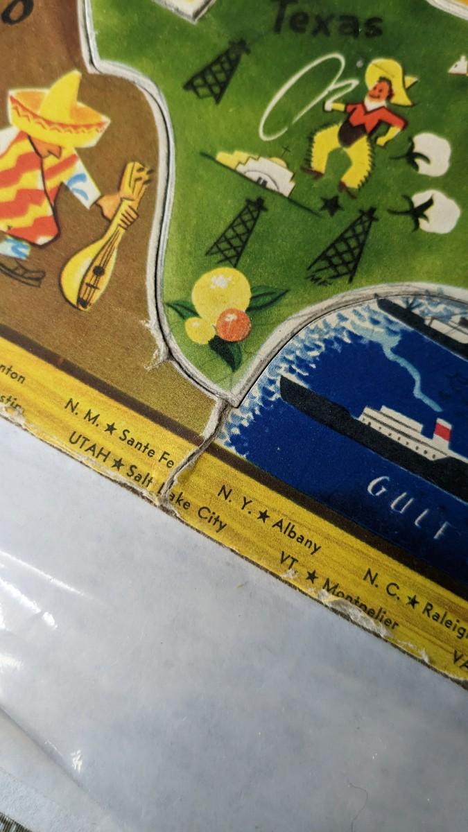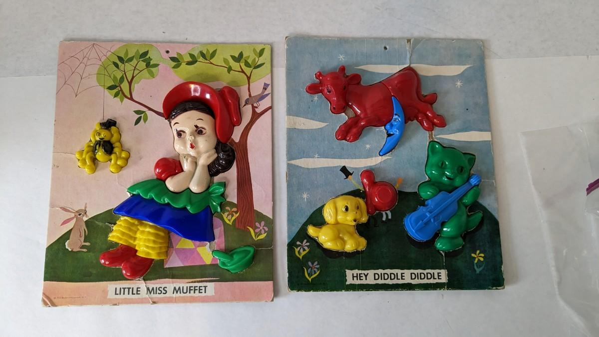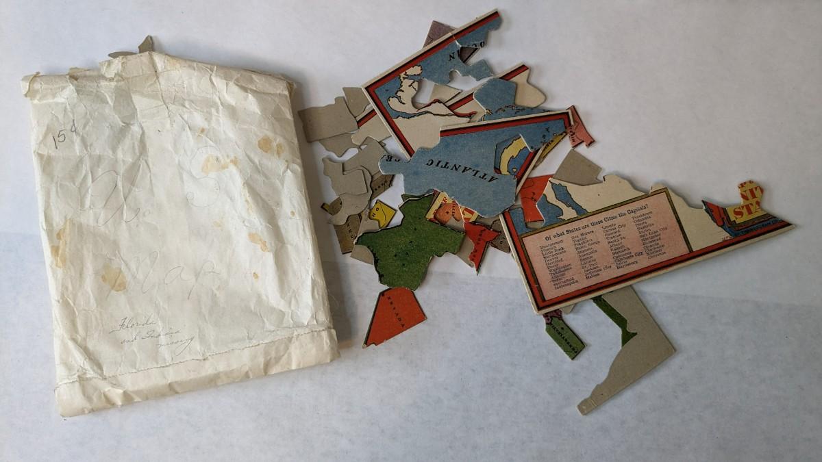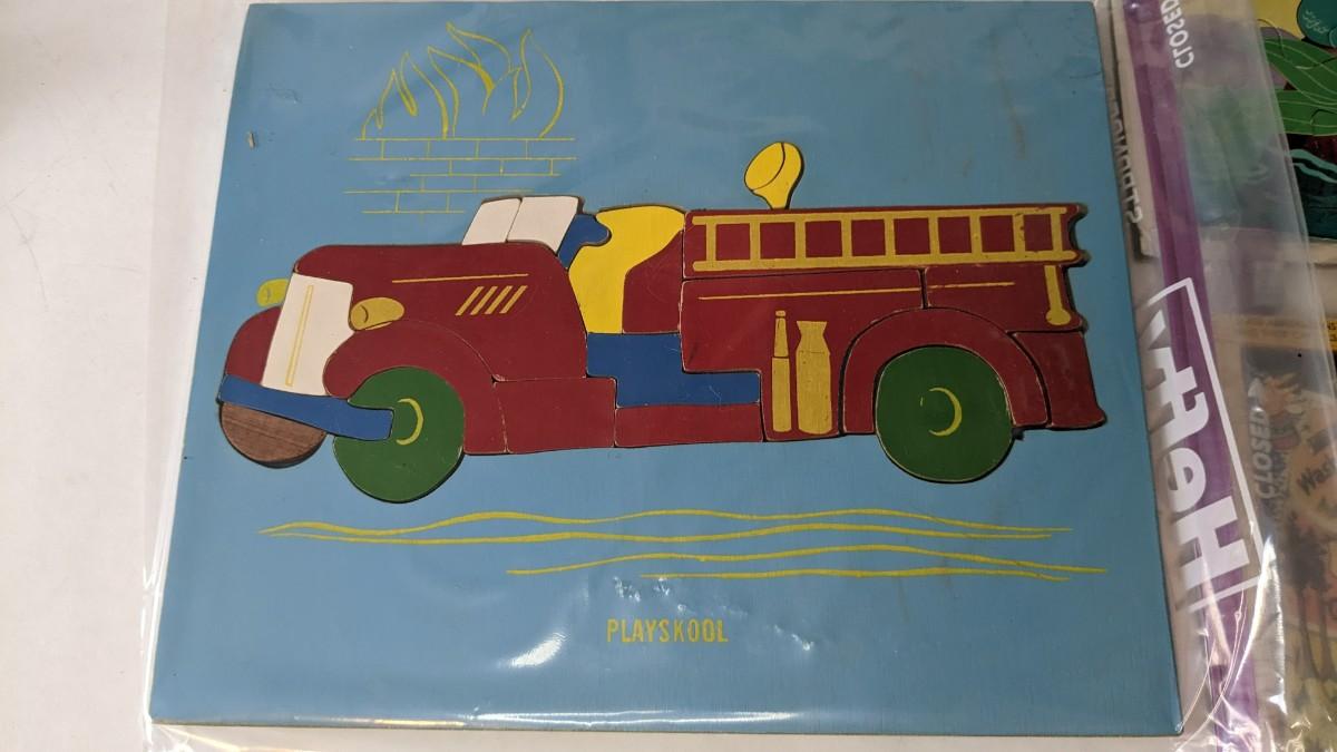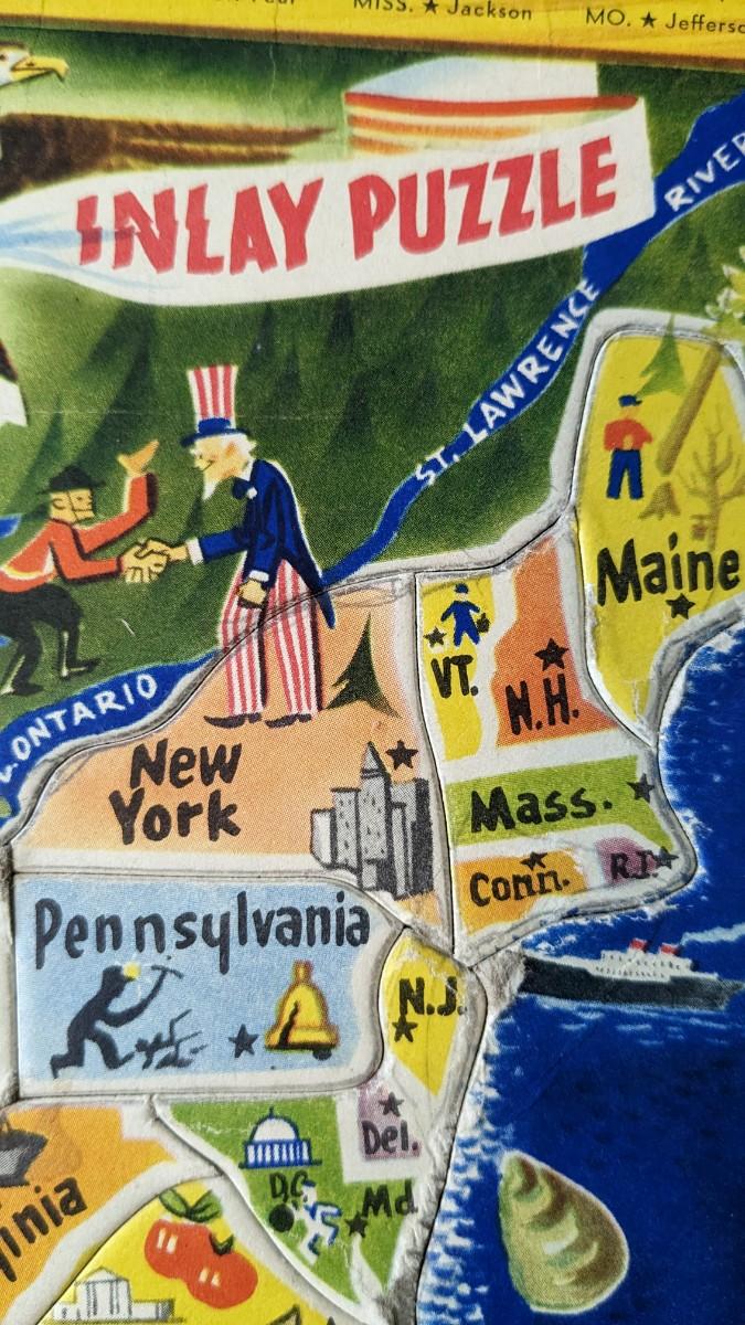 2 Tinker Toy canisters, kaleidoscope with interchangeable inserts and extra confetti, and fiddlestix with stix intact. Also includes some really incredible 3D puzzles from the 50's, cardboard US map puzzles that are pre Alaska and Hawaii, with some 90's puzzles and other wood puzzles. A great display and decorator assortment!