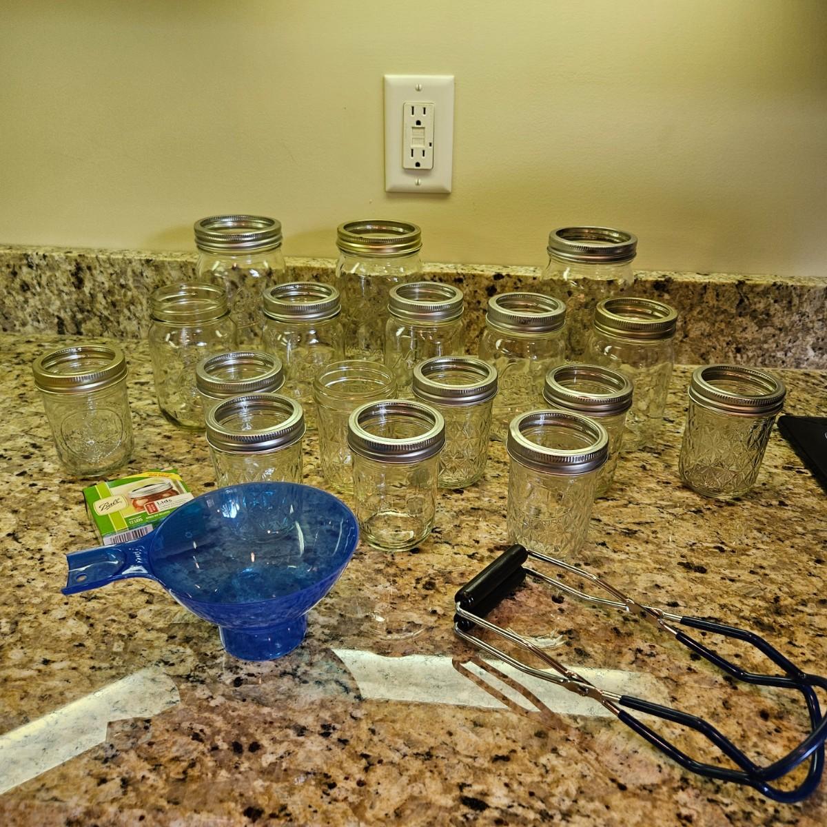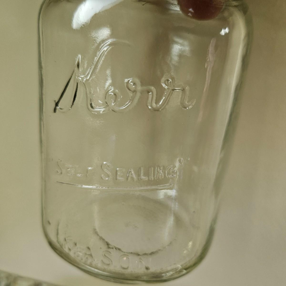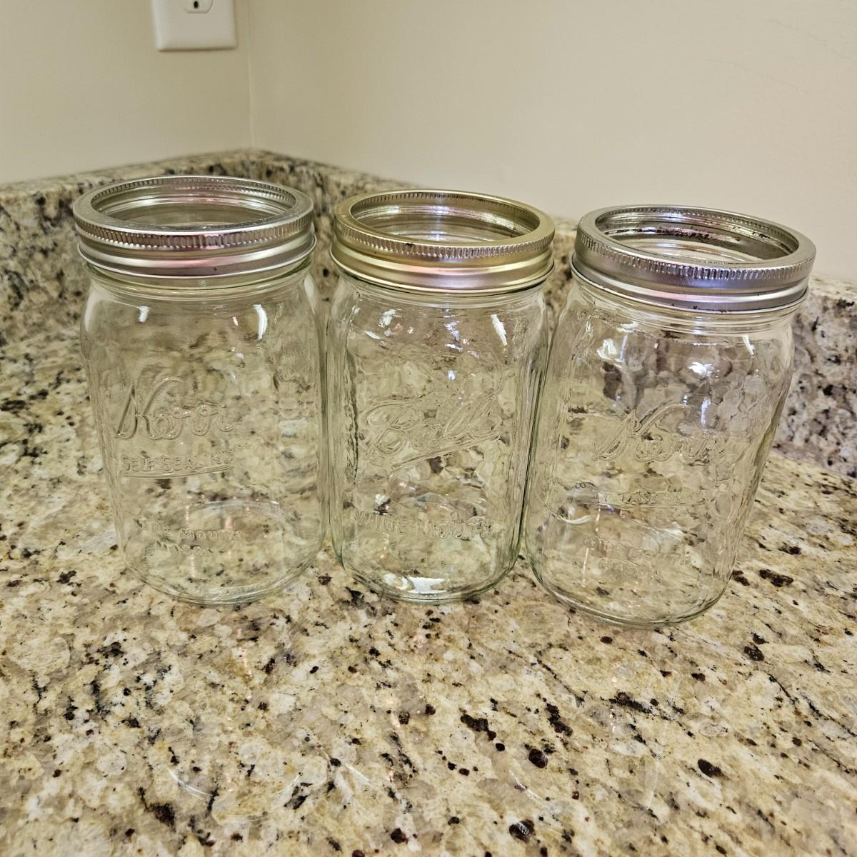 An assortment of 17 canning jars that are a mix of Ball and Kerr in three different sizes. The largest being widemouth and measuring approximately 4"D x 7"H. Also included is a canning funnel, jar grip and five lids. Shipping available