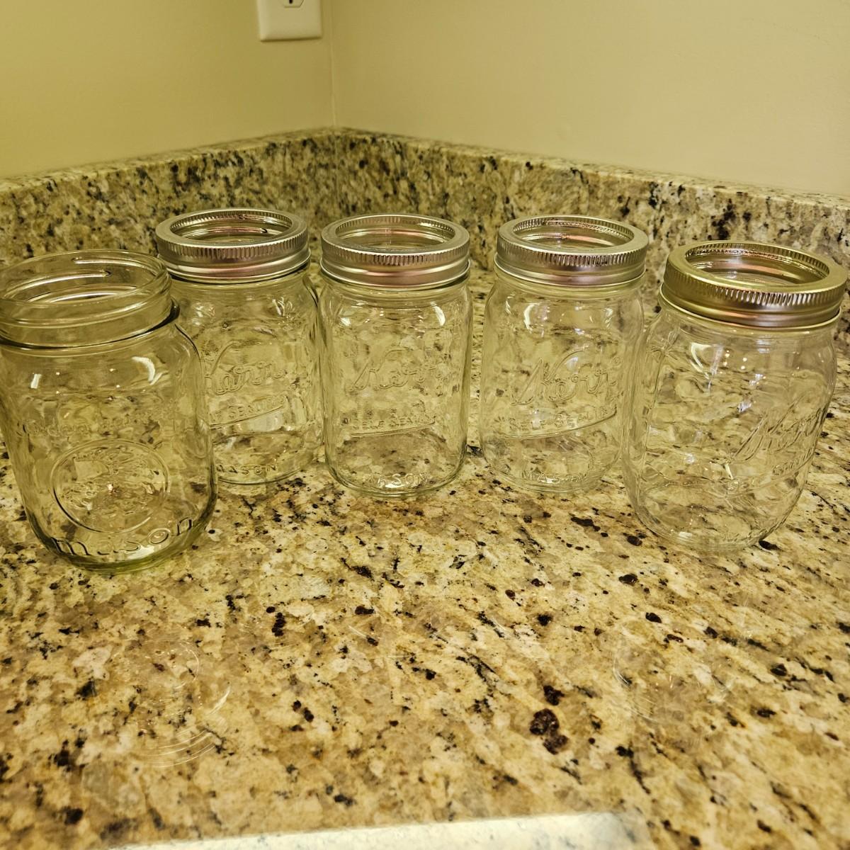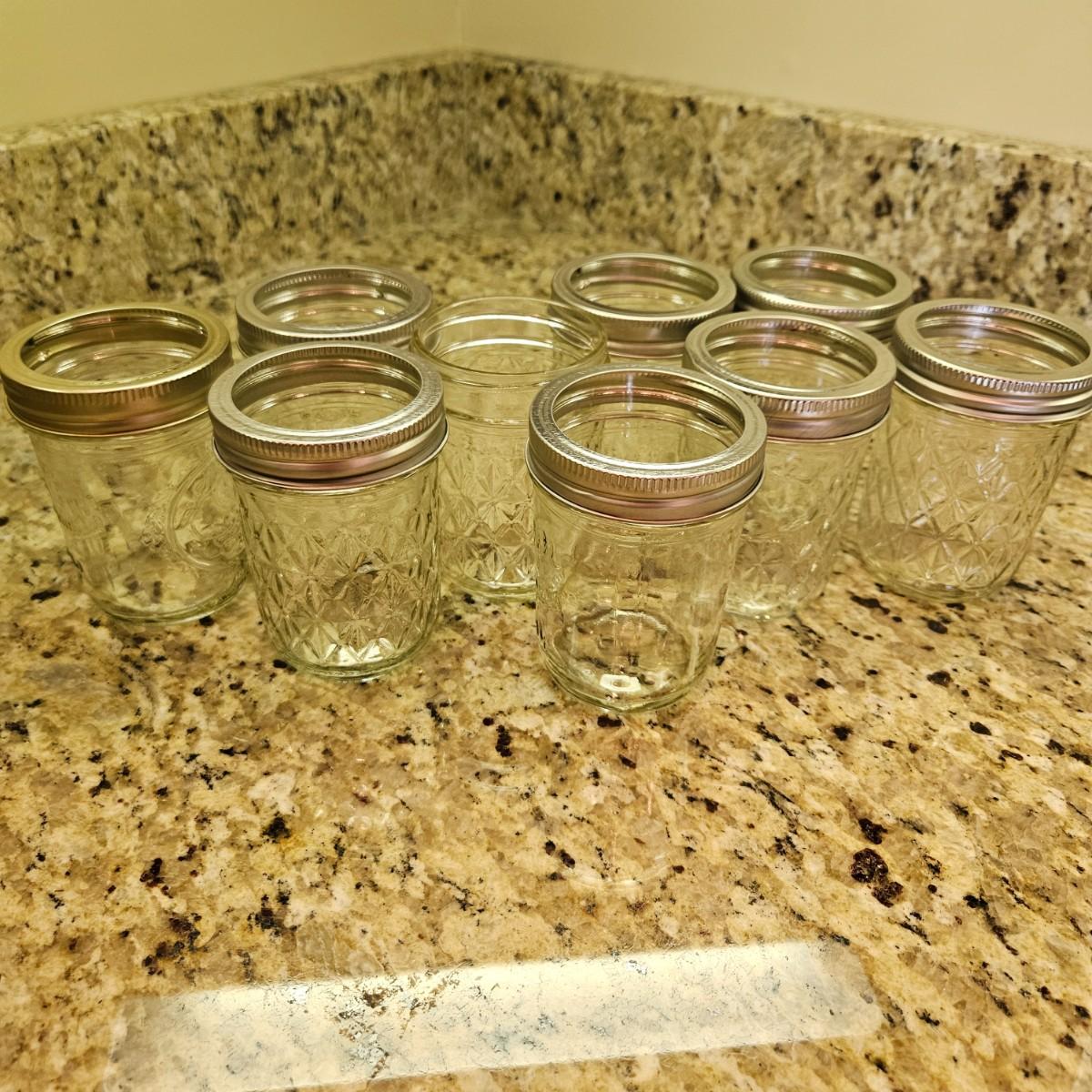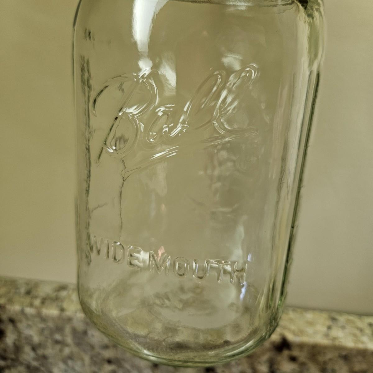 An assortment of 17 canning jars that are a mix of Ball and Kerr in three different sizes. The largest being widemouth and measuring approximately 4"D x 7"H. Also included is a canning funnel, jar grip and five lids. Shipping available