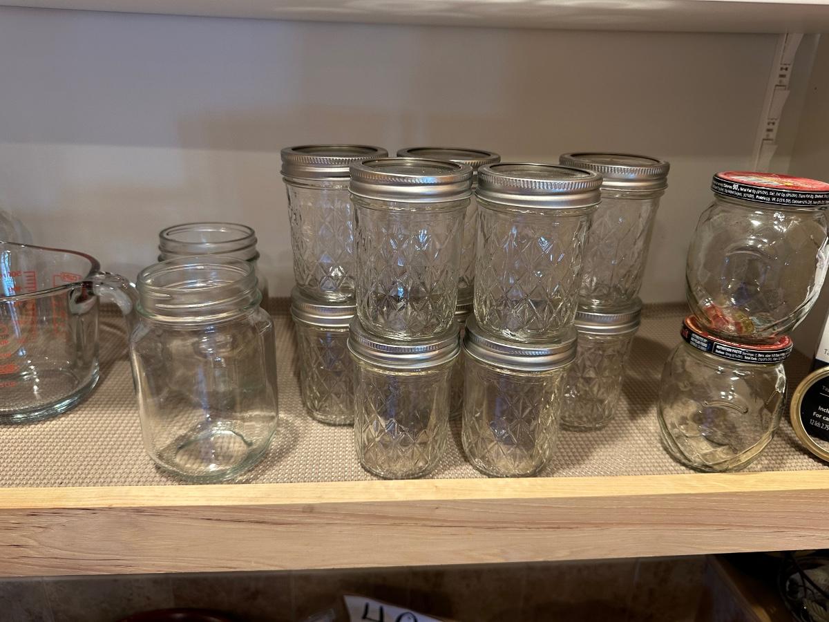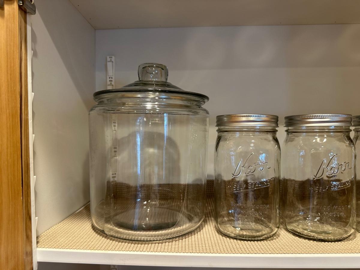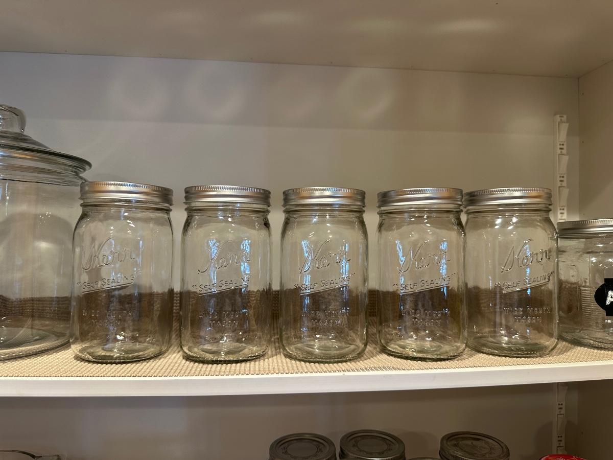 CANNING JARS, MEASURING CUPS AND AN APOTHECARY JAR