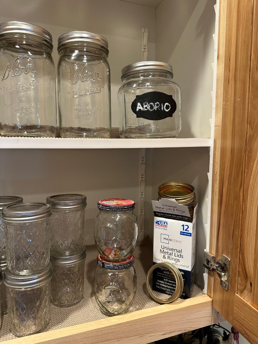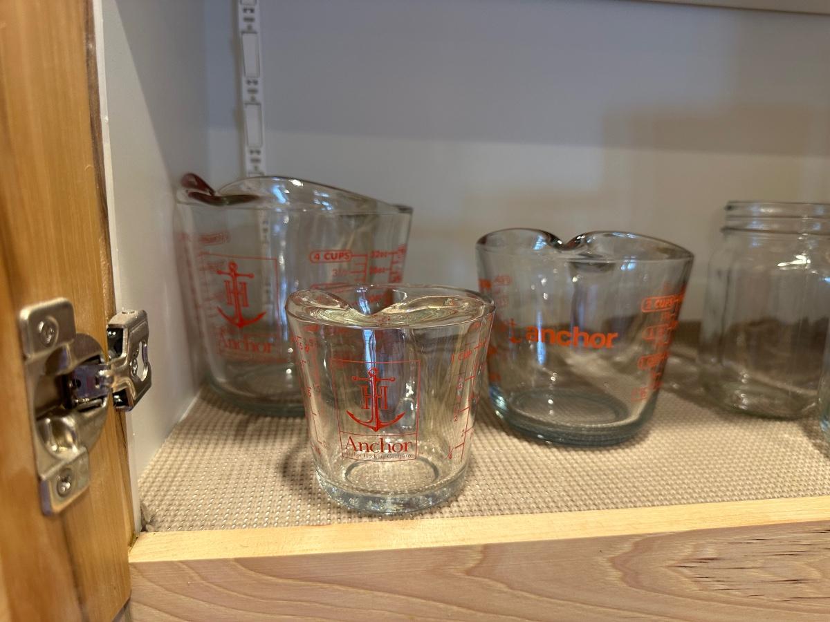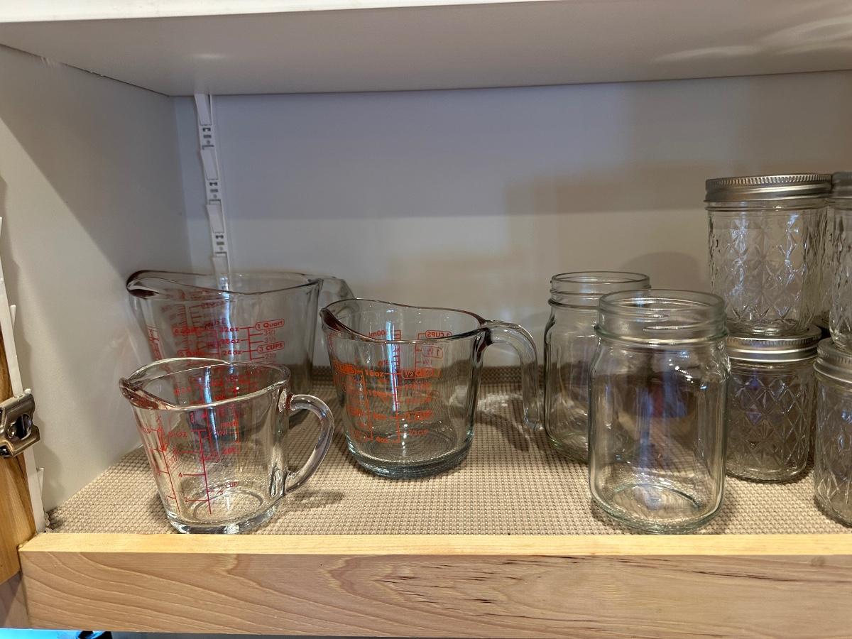 CANNING JARS, MEASURING CUPS AND AN APOTHECARY JAR