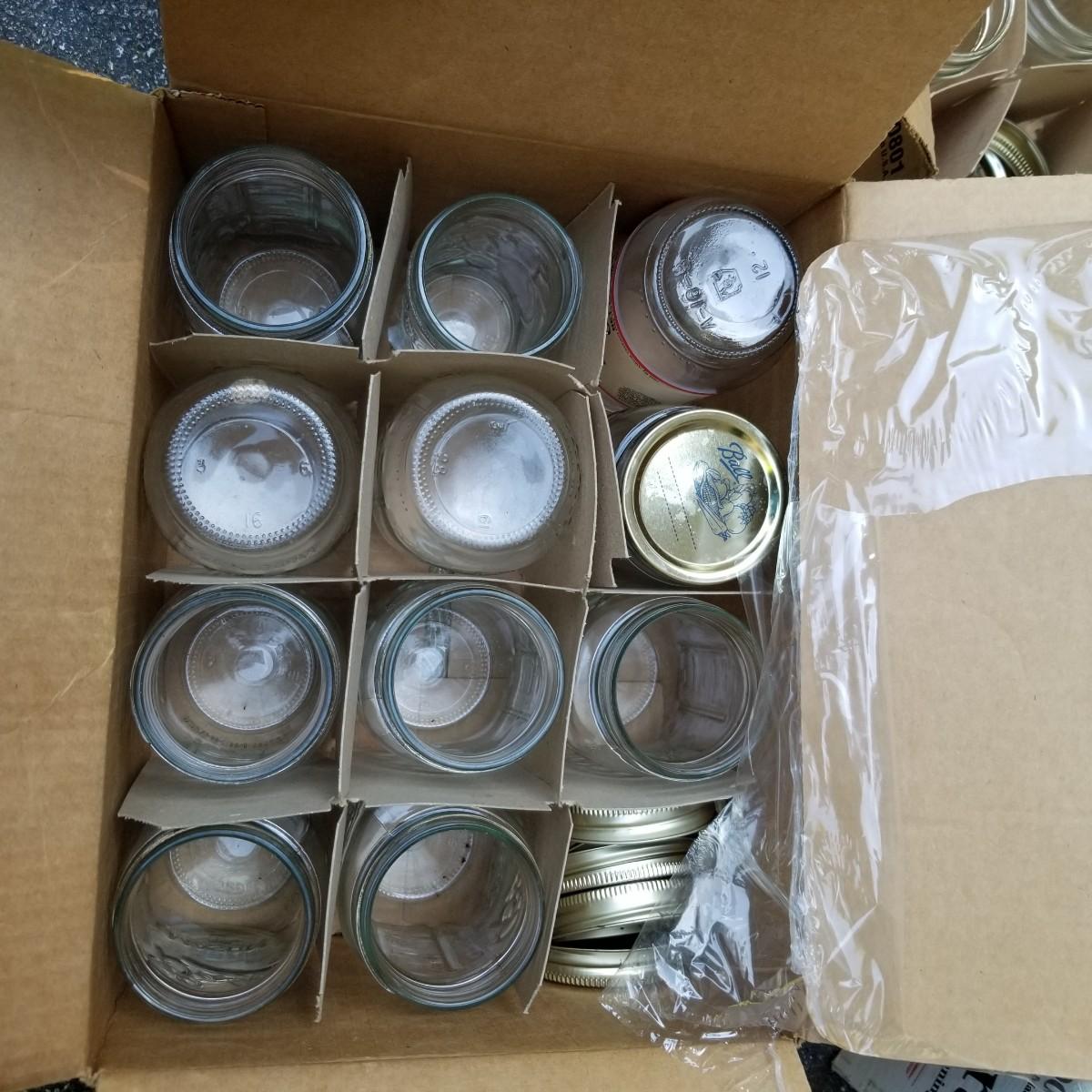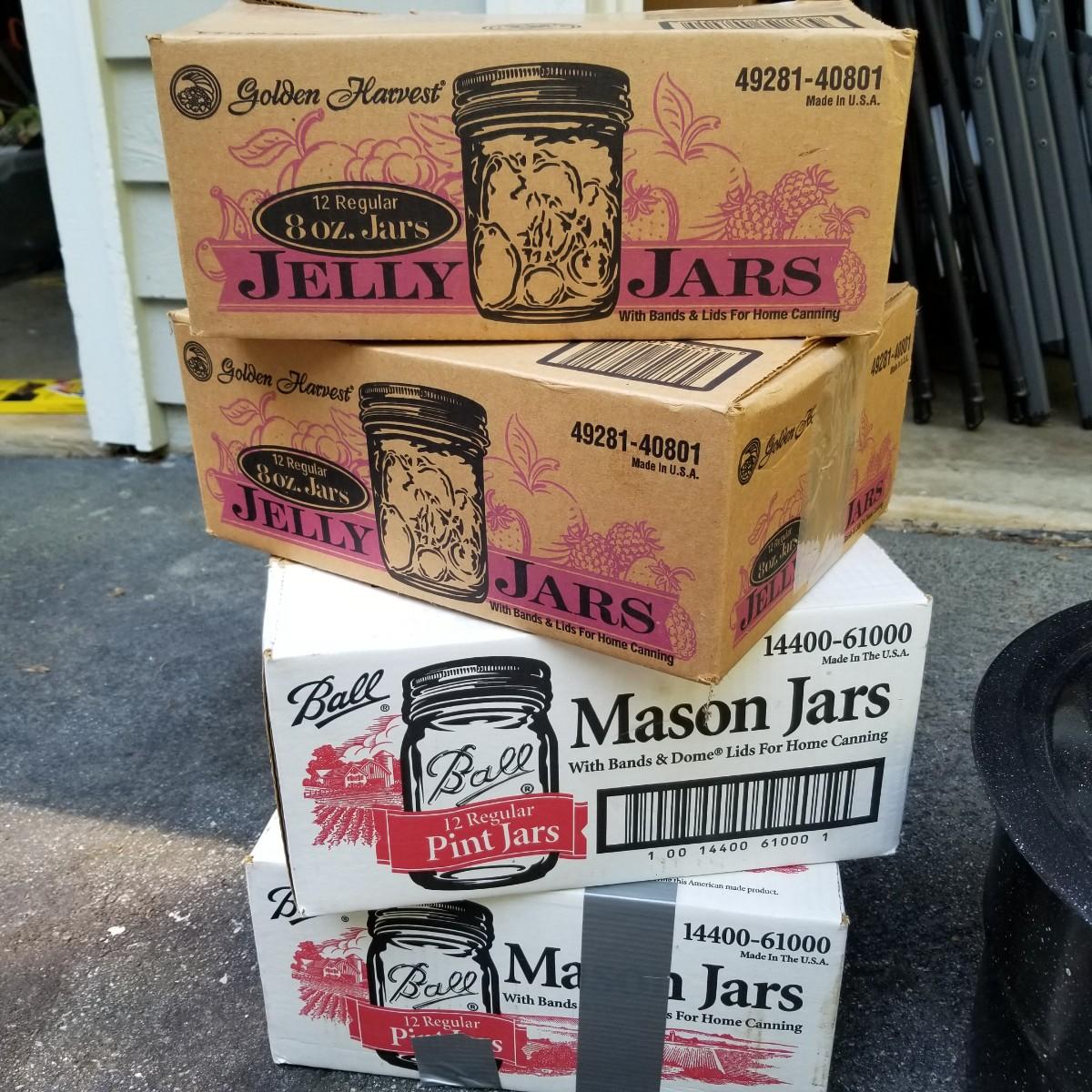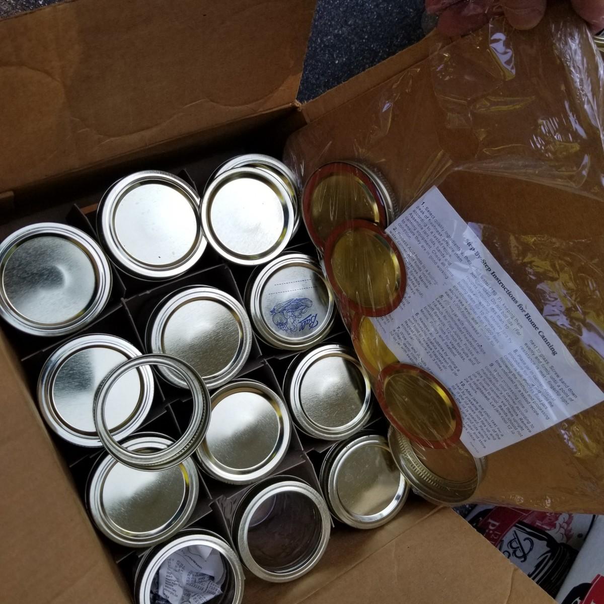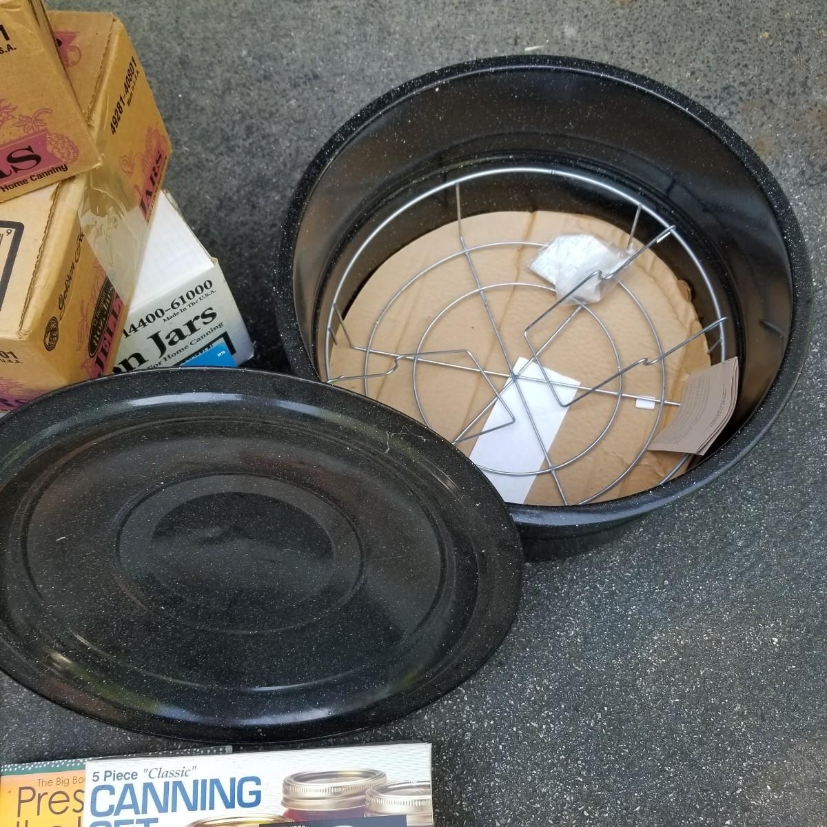 Complete canning set up with jars, lids, thermometer, book and canning pot with jar lifter. Not all jar cases full. Total twenty three pint Mason jars with lids, and total nineteen eight oz Golden Harvest jelly jars. All items appear to be new. Local pickup only.