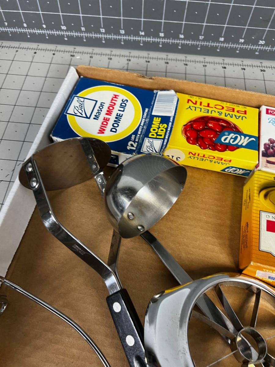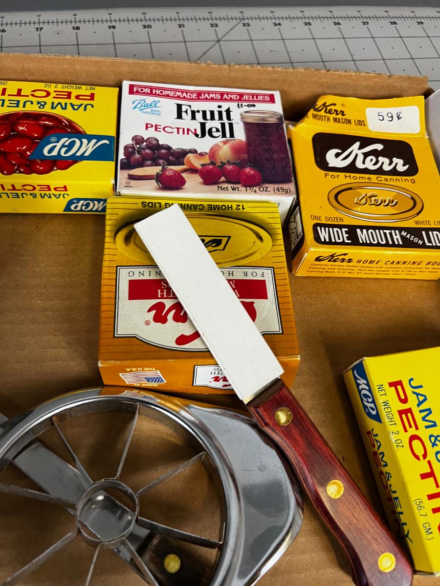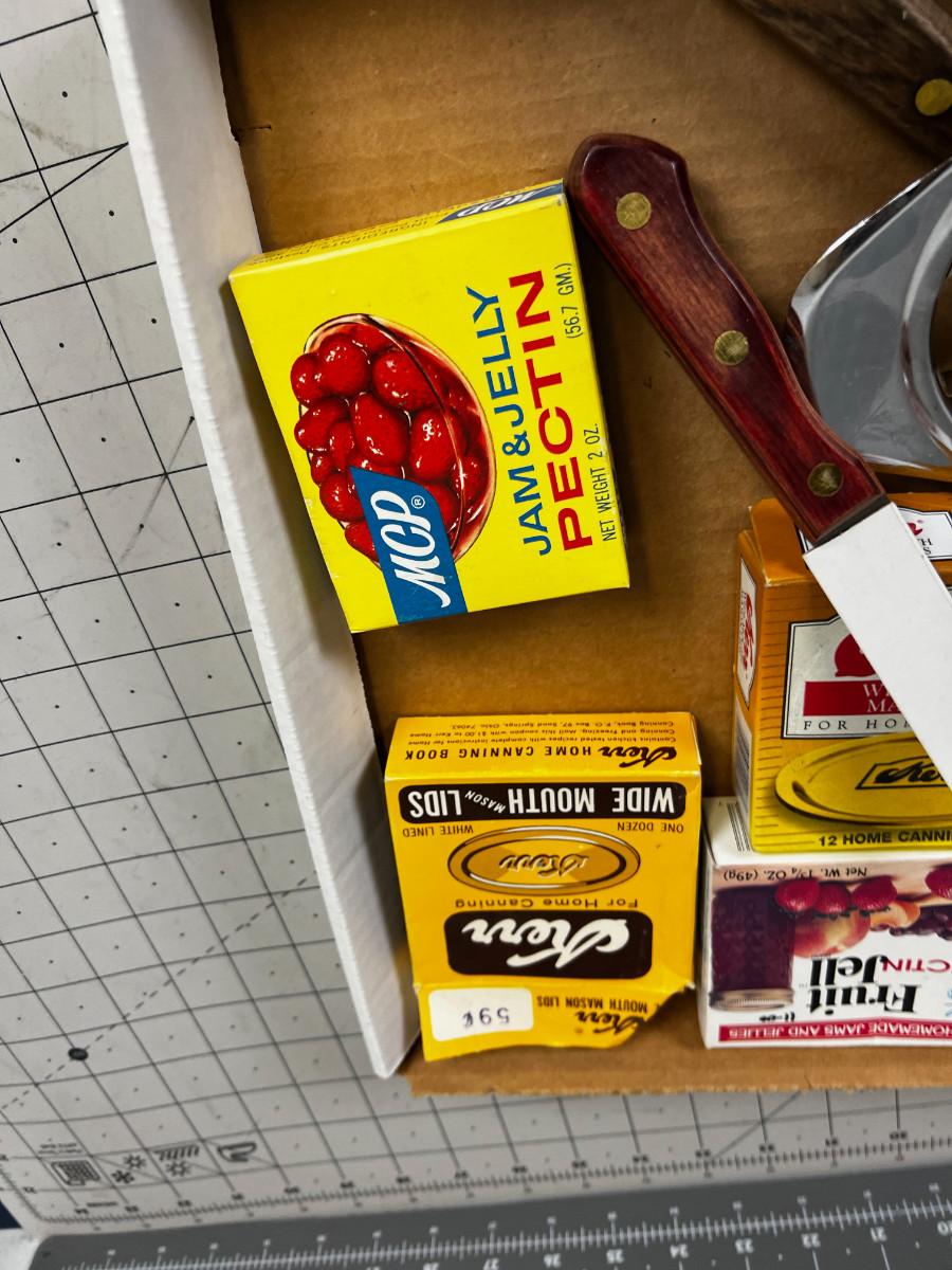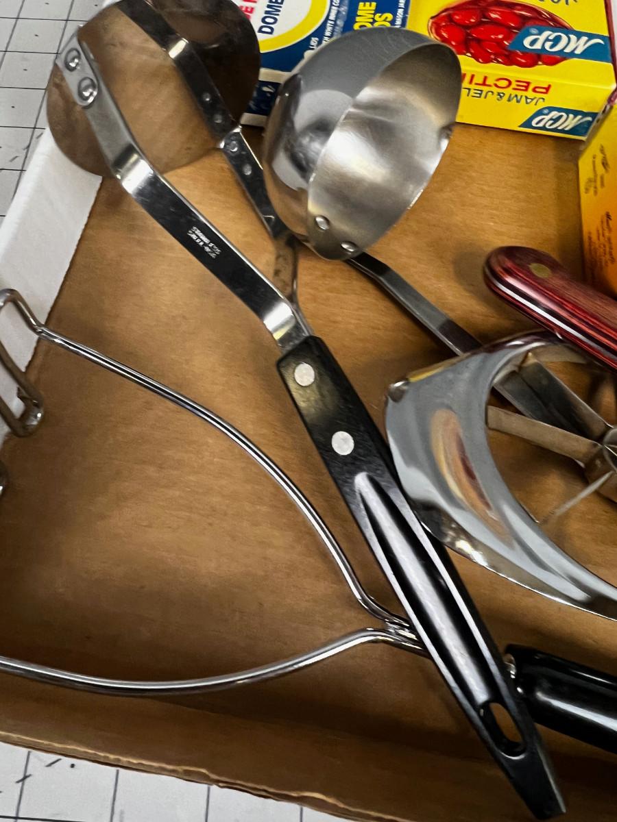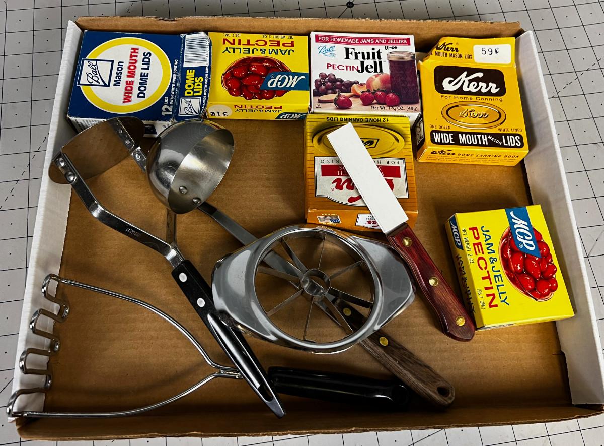 Canning supplies: Ladles, Masher, Paring Knife, Pectin and lids