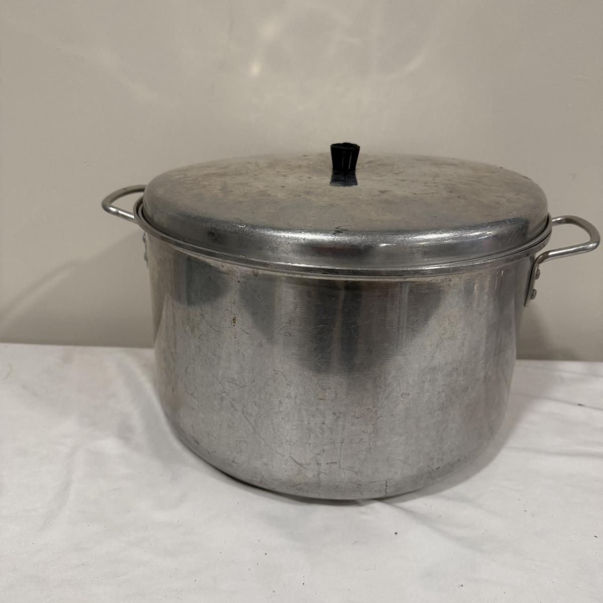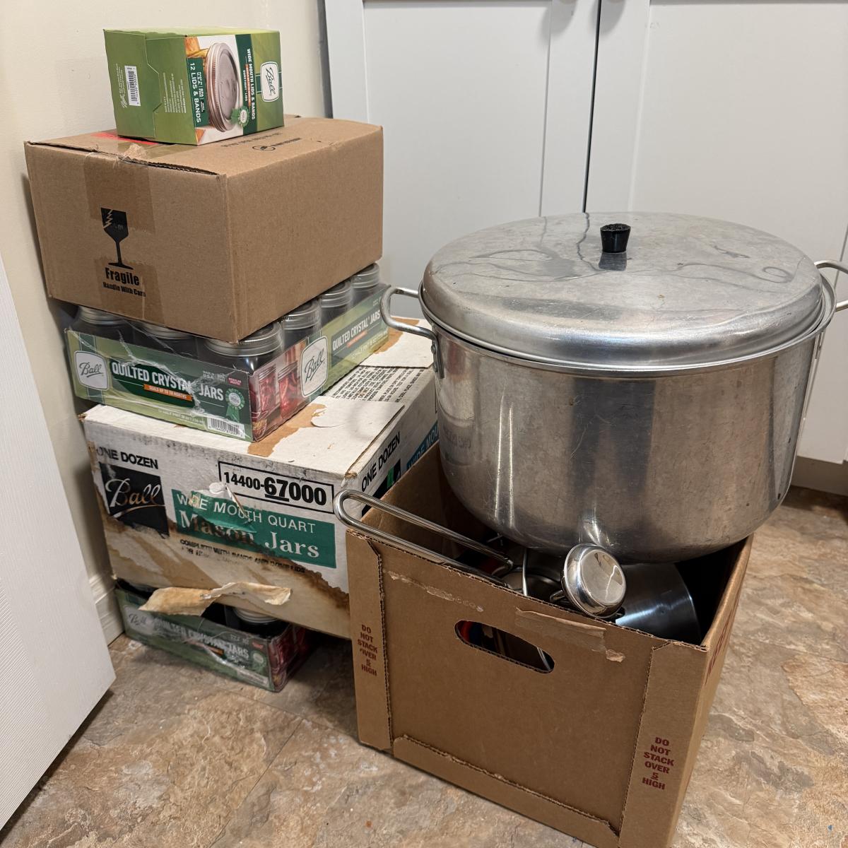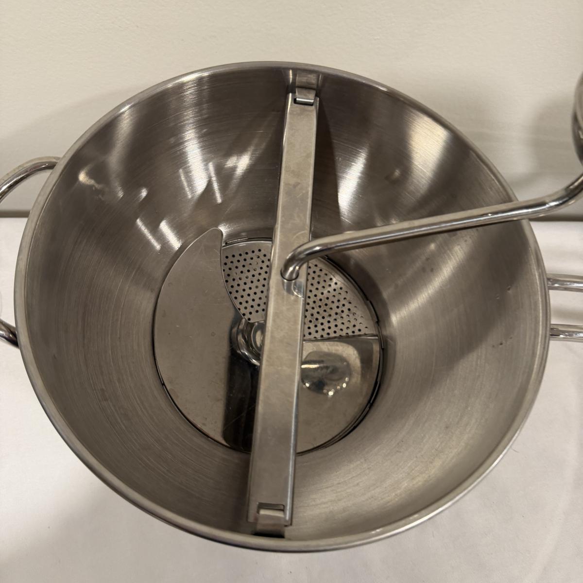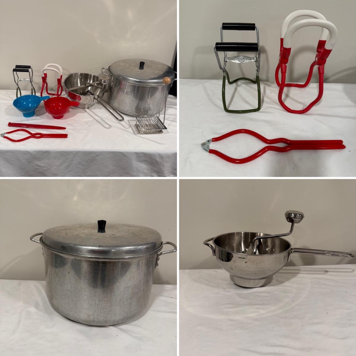 Lot includes Enterprise pot with lid, food mill, plastic funnels, jar lifters, fruit preserves and over 30 Ball jars. Pot measures 13.5”D x 10”H.