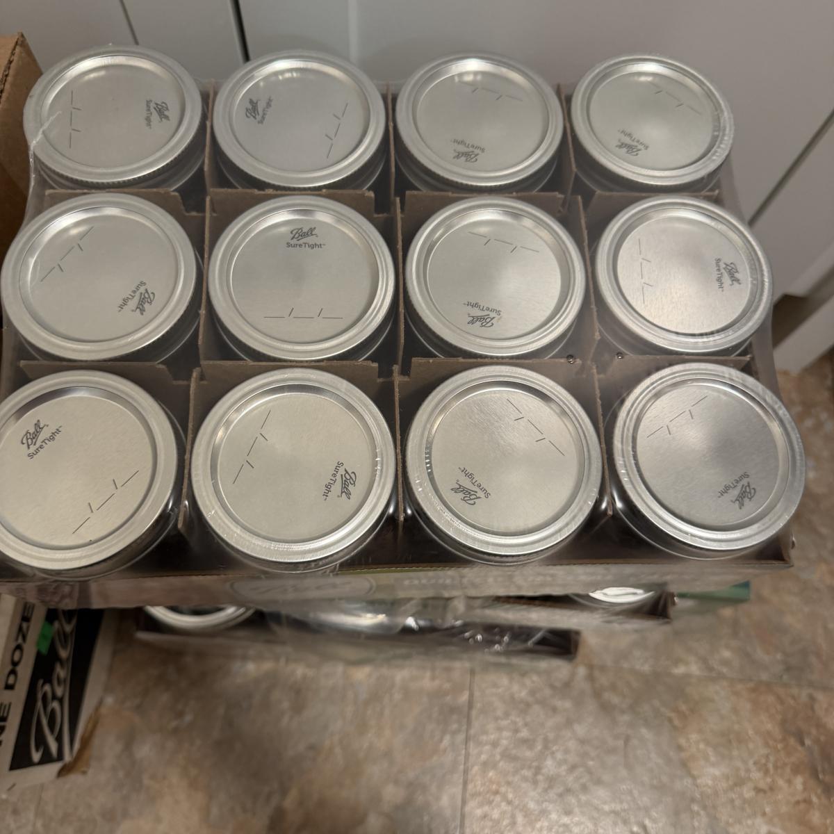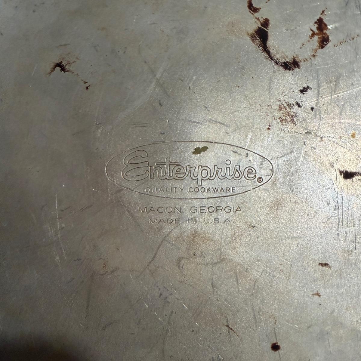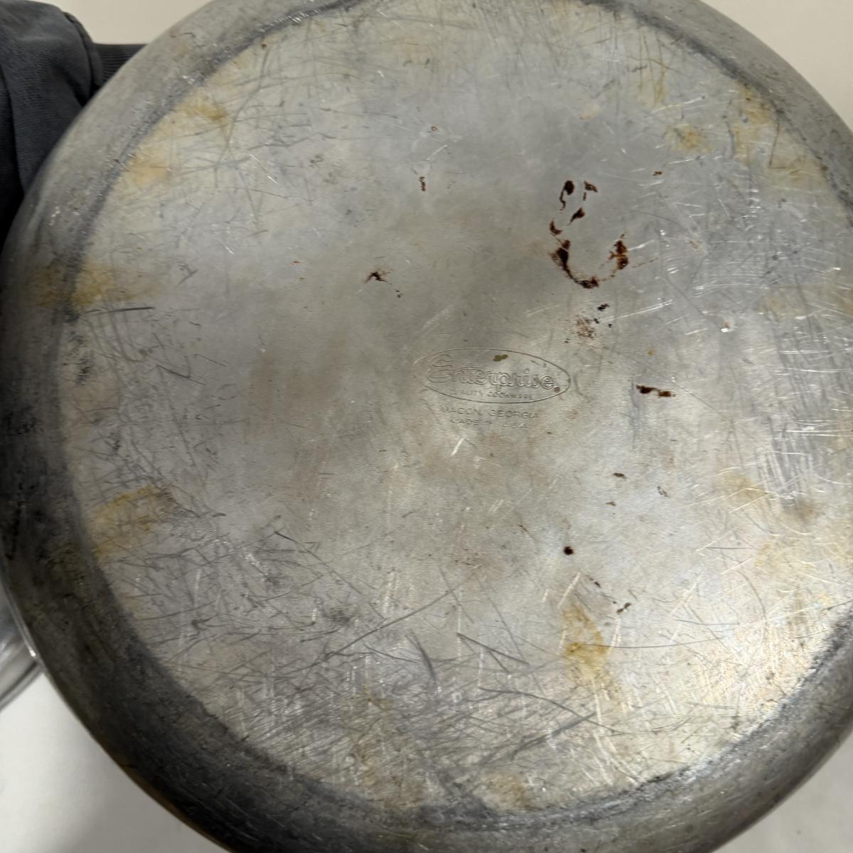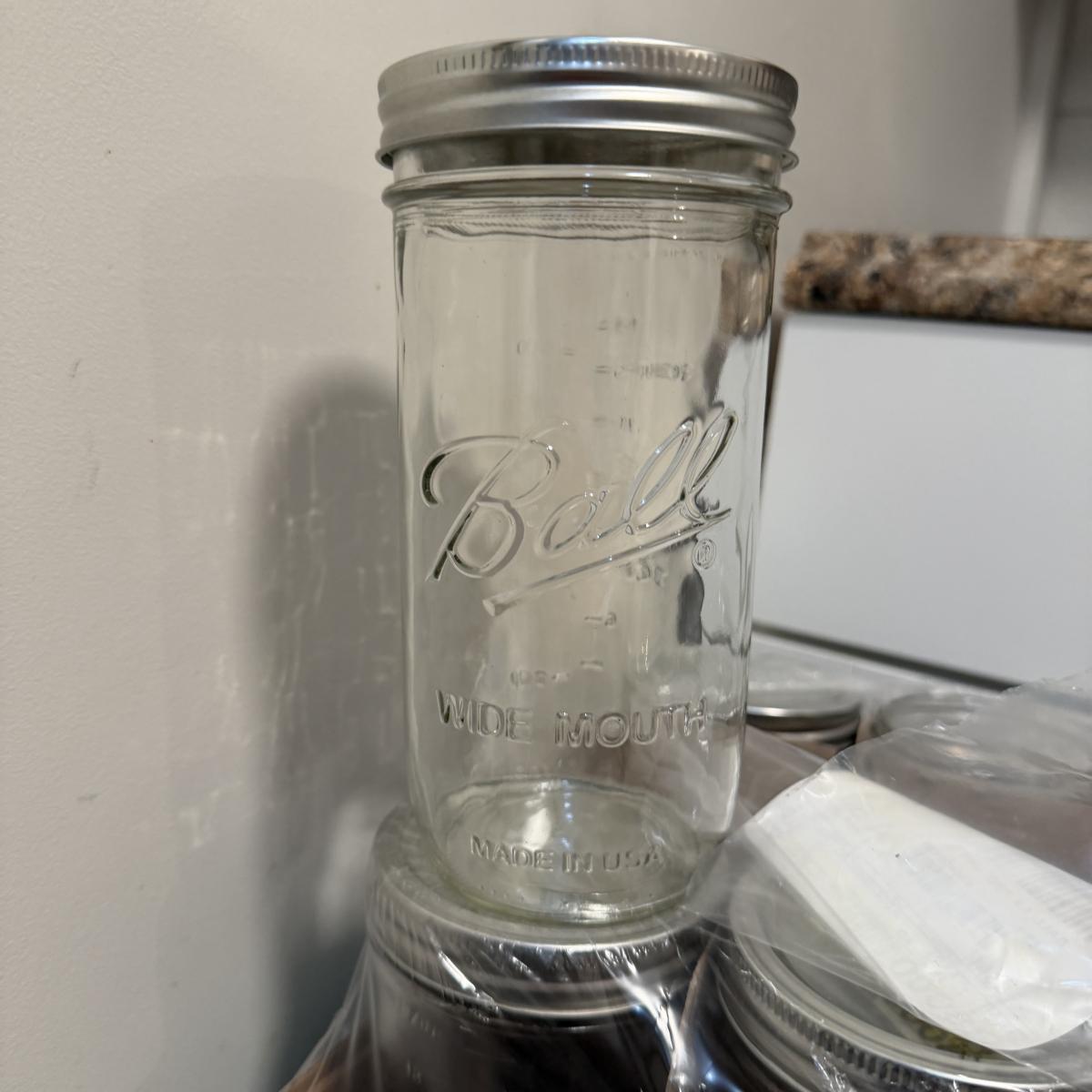 Lot includes Enterprise pot with lid, food mill, plastic funnels, jar lifters, fruit preserves and over 30 Ball jars. Pot measures 13.5”D x 10”H.