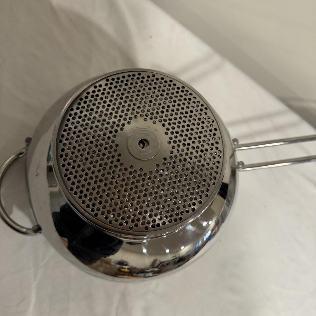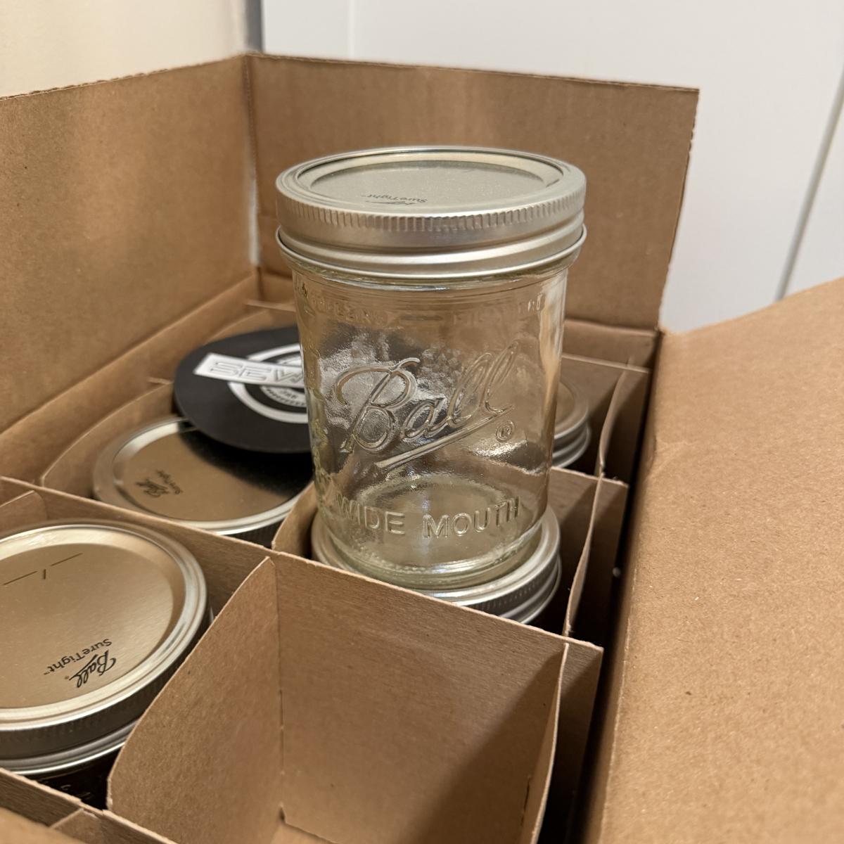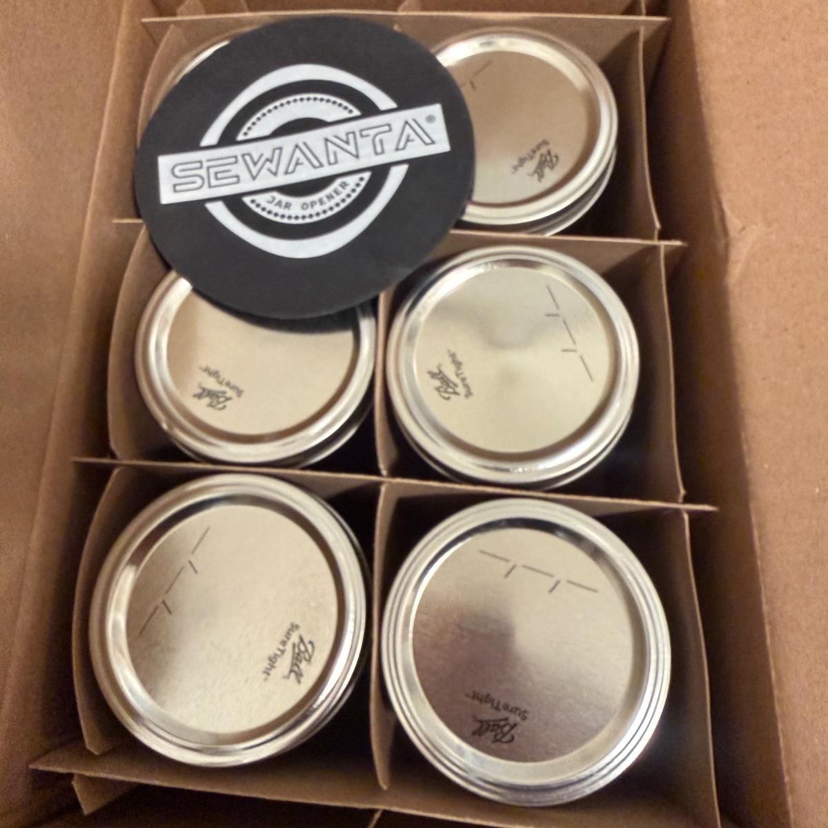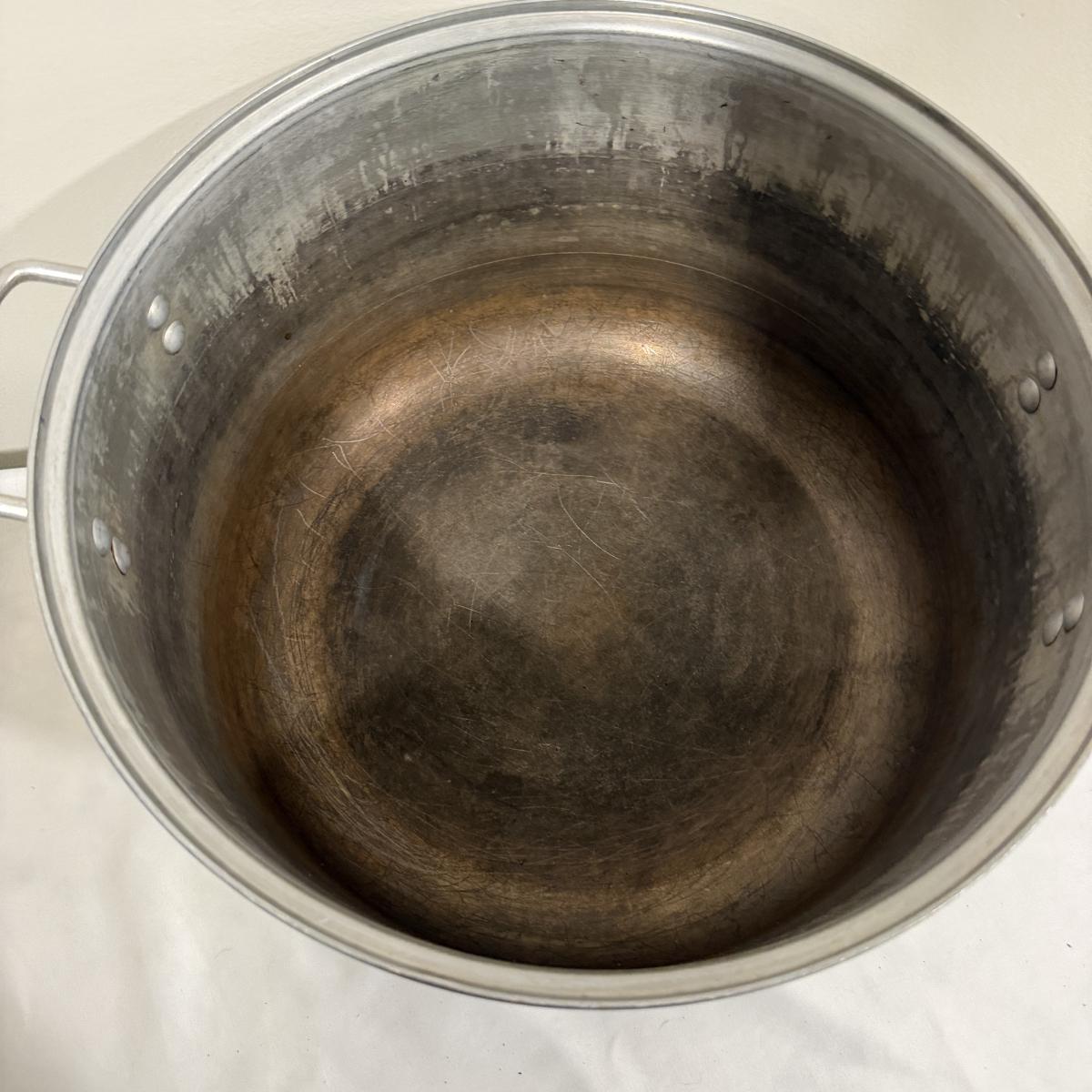 Lot includes Enterprise pot with lid, food mill, plastic funnels, jar lifters, fruit preserves and over 30 Ball jars. Pot measures 13.5”D x 10”H.