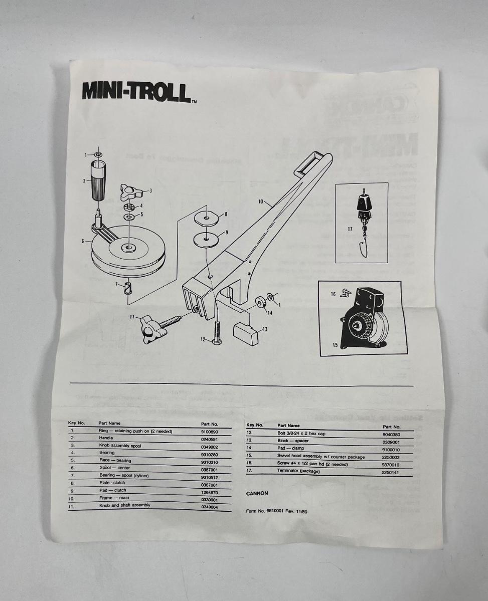 Cannon Mini troll downrigger. Complete set includes everything shown, including Tru Trac Industries 6lb flashweight and 2 extra downrigger releases.
