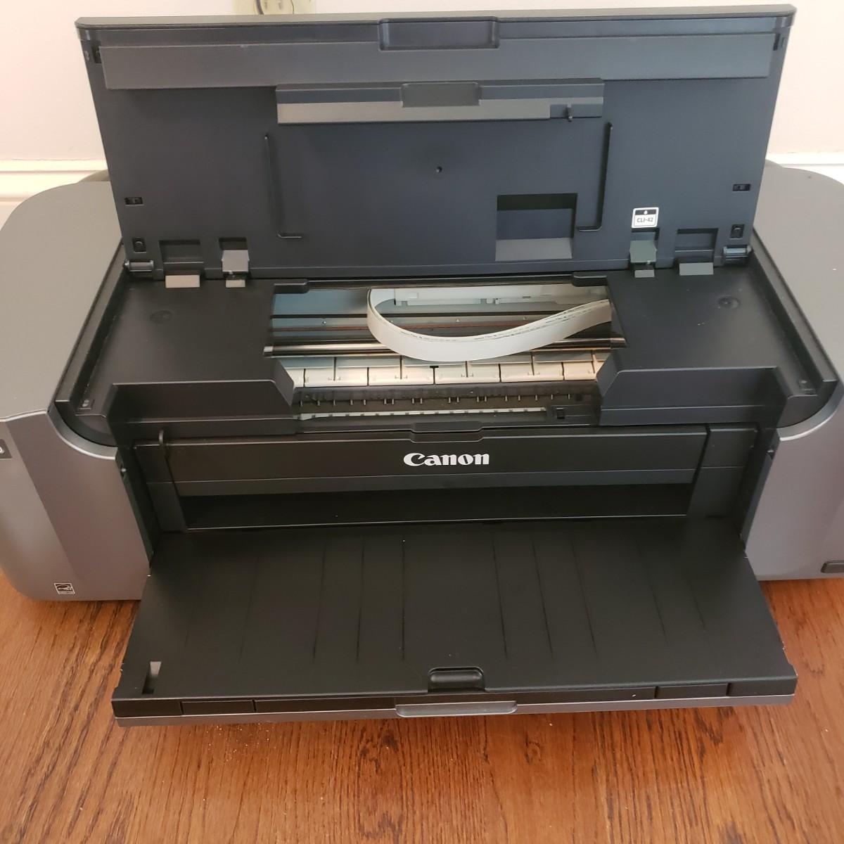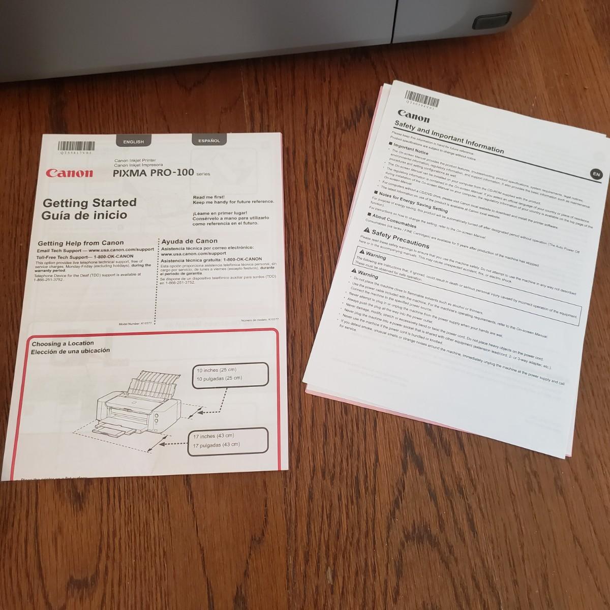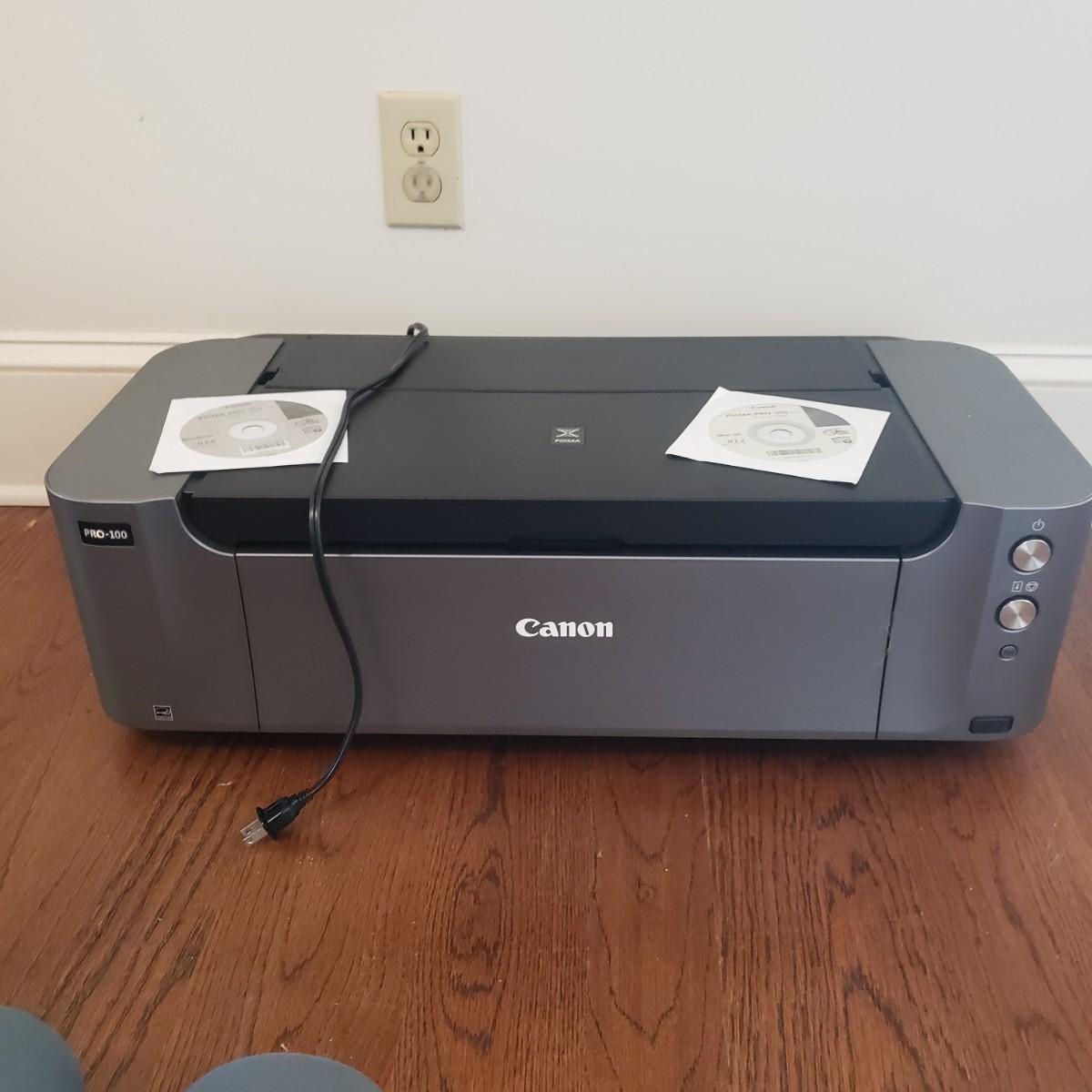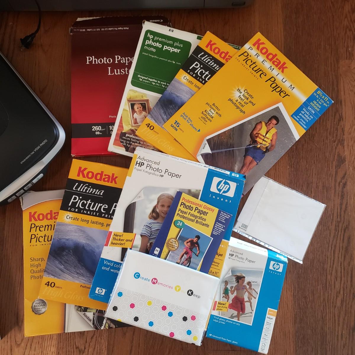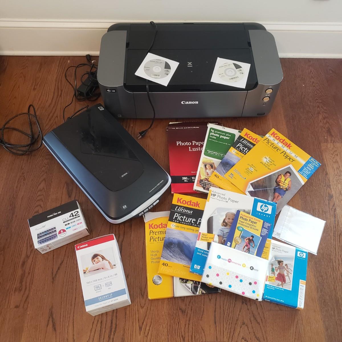 This lot features a Canon Prixma Europa printer (27" x 15" x 7"H), which powers on when plugged in. This printer comes with two installation disks and instruction manual. The Epson Perfection V500 photo printer (18" x 11" x 5"H) also powers on when plugged in. This lot has multiple photo paper packs. Two of the boxes are NIB as seen in pictures.