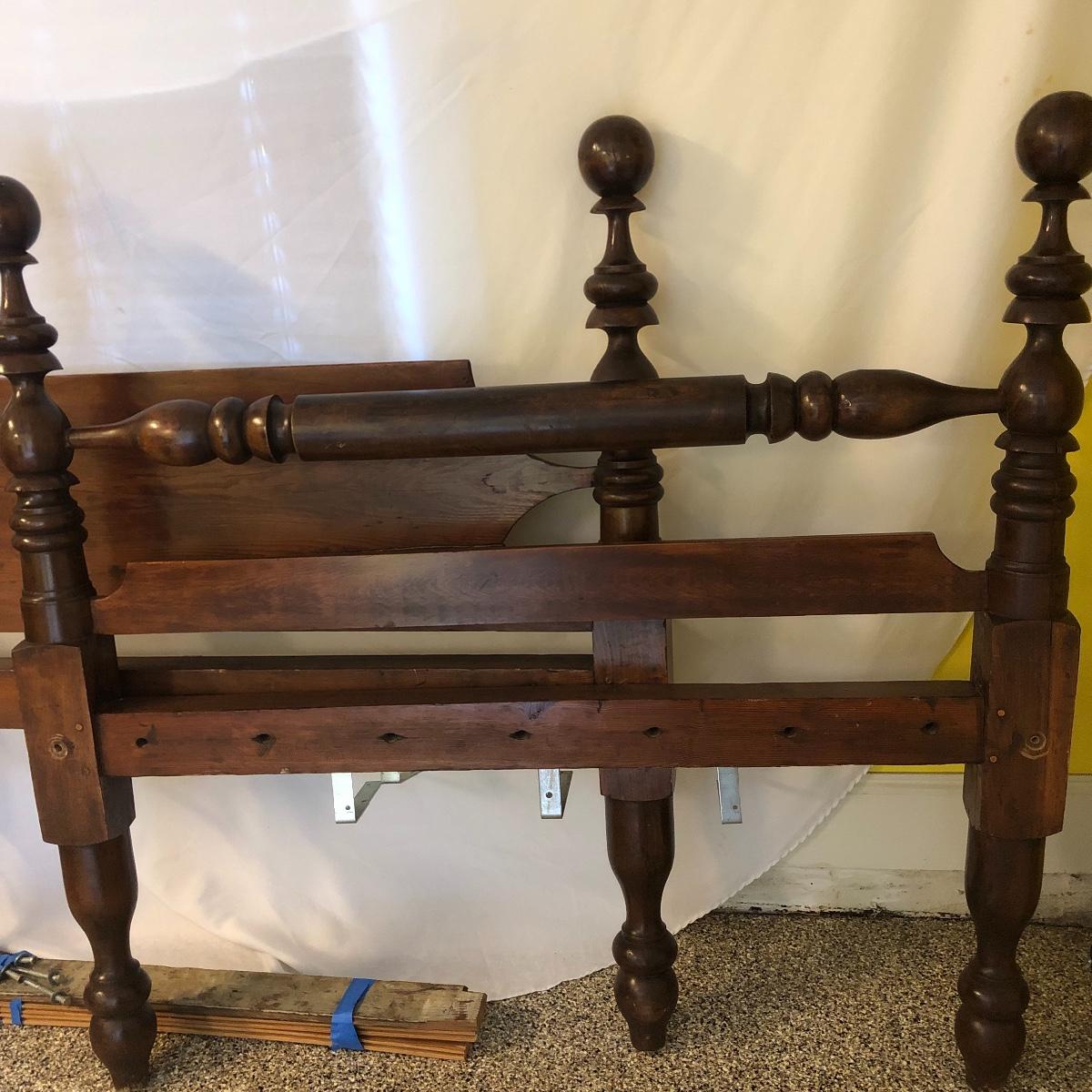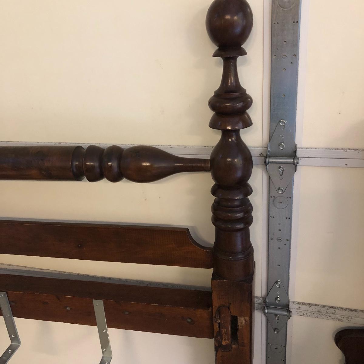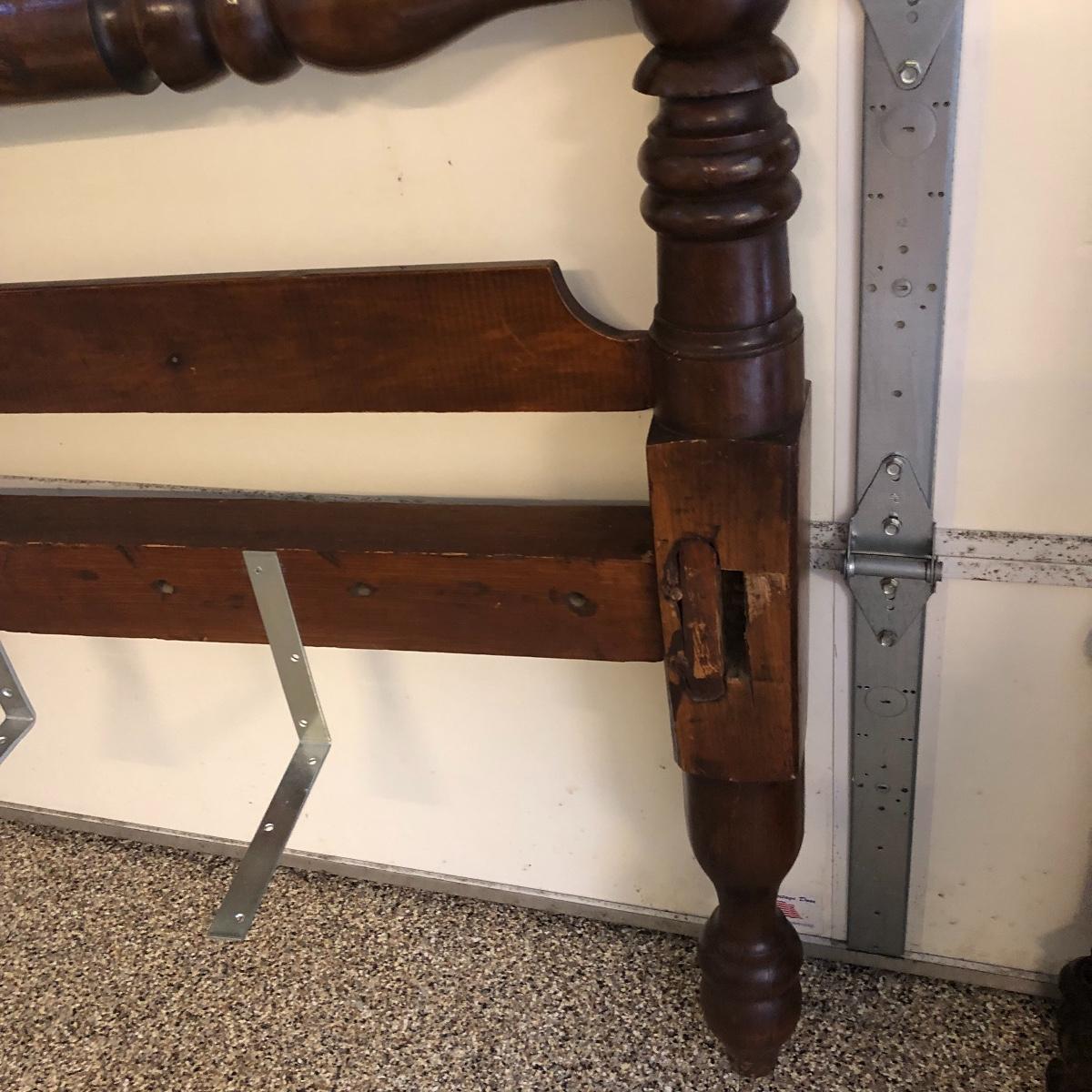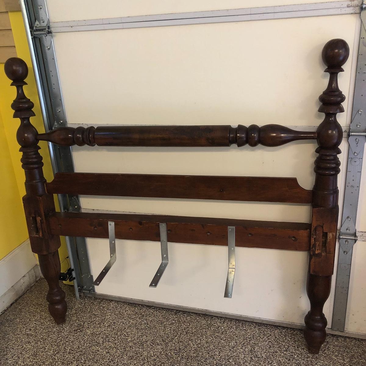 This lot includes a headboard and footboard with three slates and bolts. Dimensions are 56.5” wide (headboard) and 54” tall (top of cannonball). Footboard measures 56.5” and is 53.5” tall. Local pick up only.