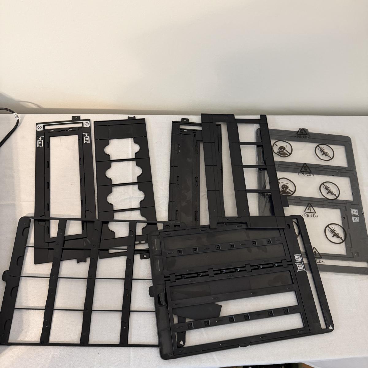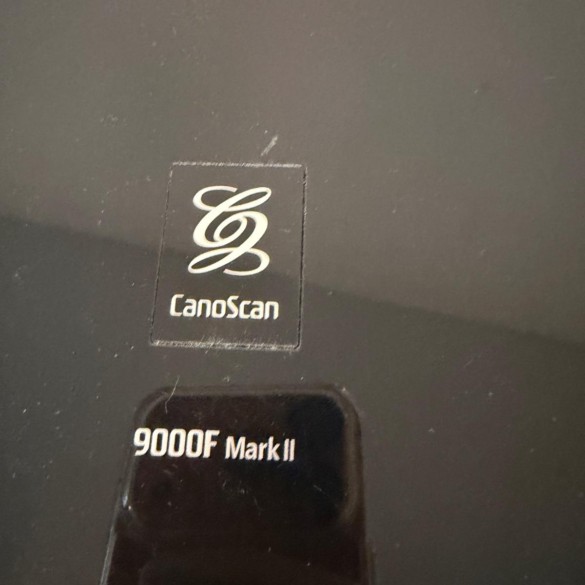 Lot includes a Canon 9000F Mark 11 scanner with film holders. Scanner powered on. Scanner measures 11” x 19” x 3”H.
