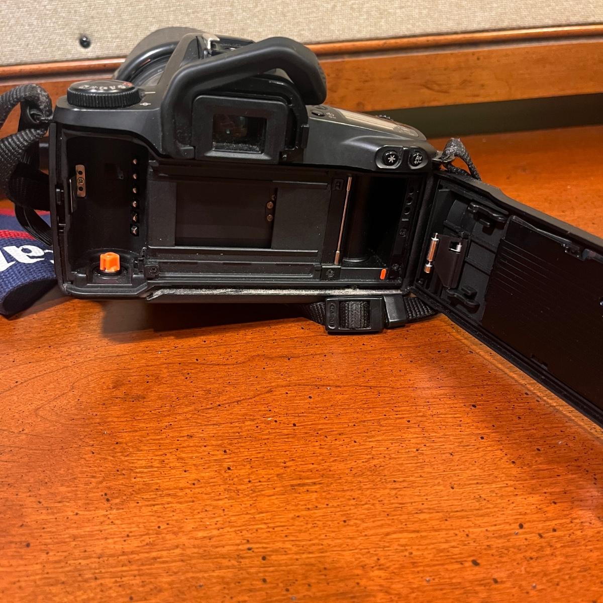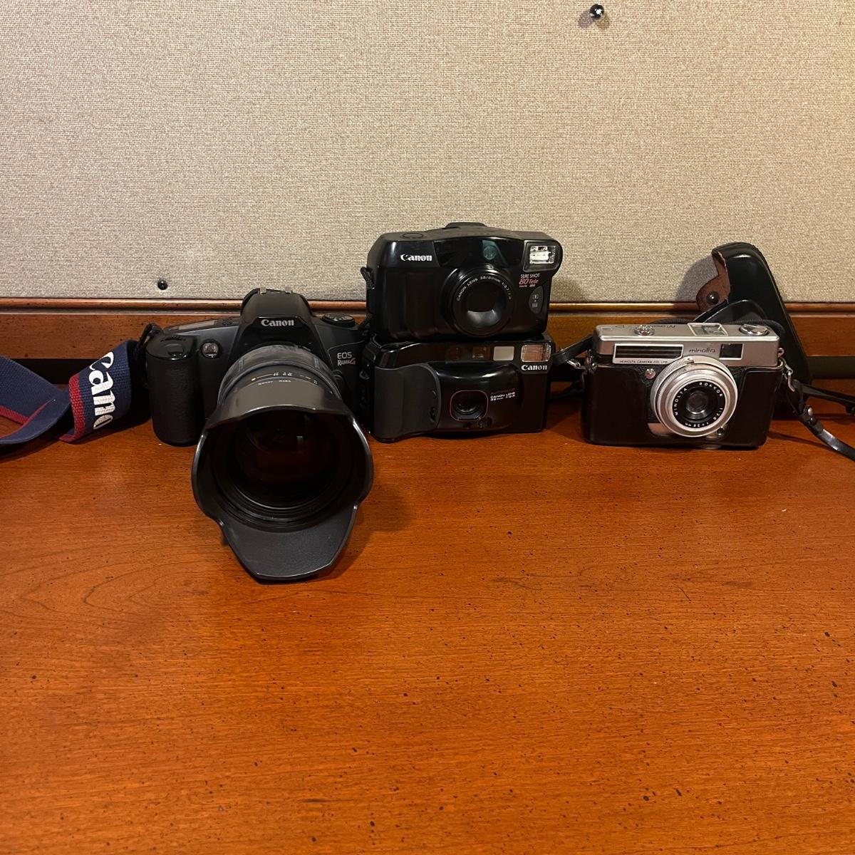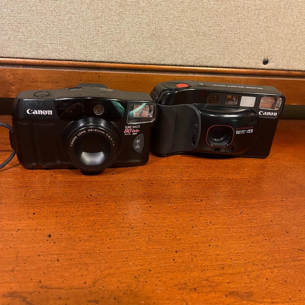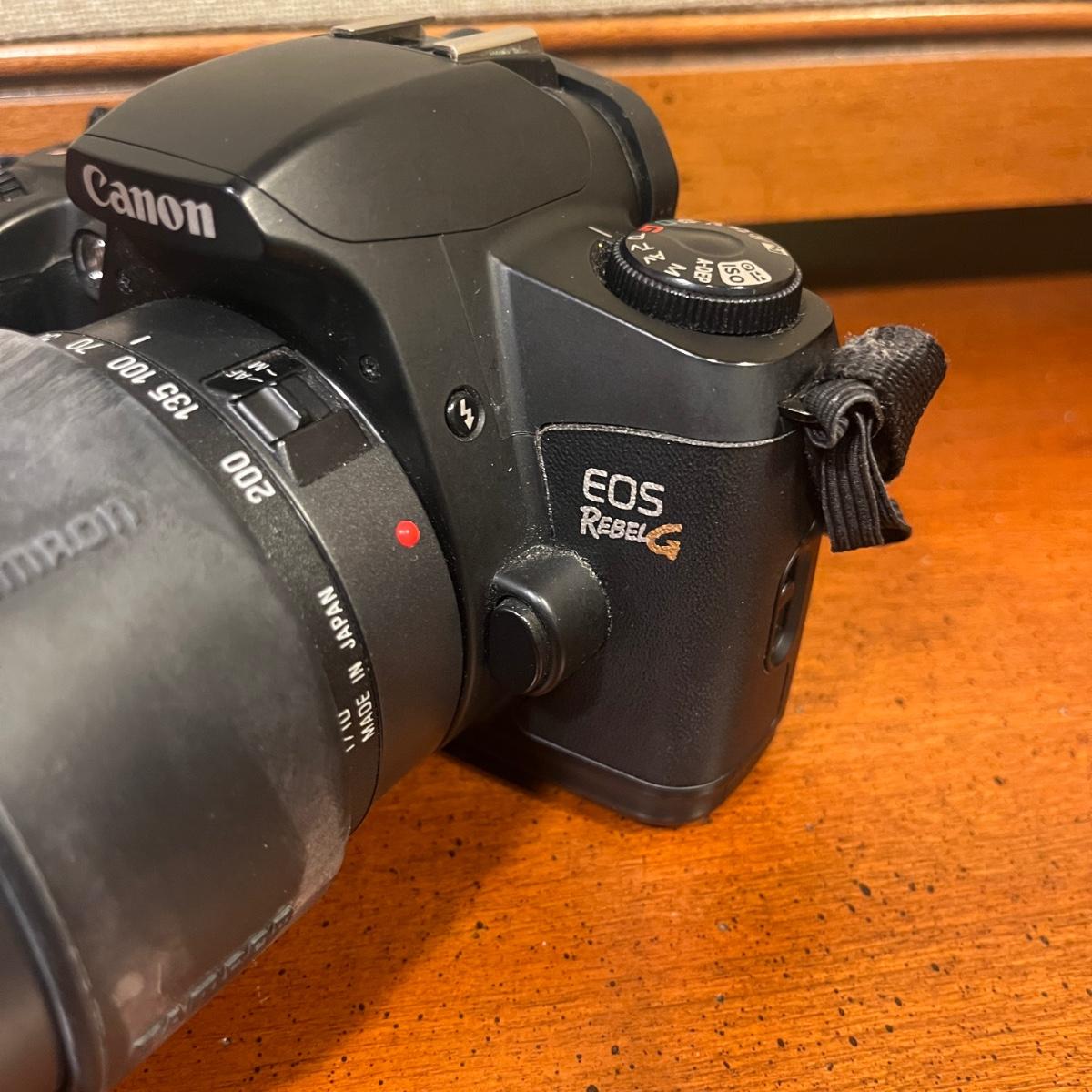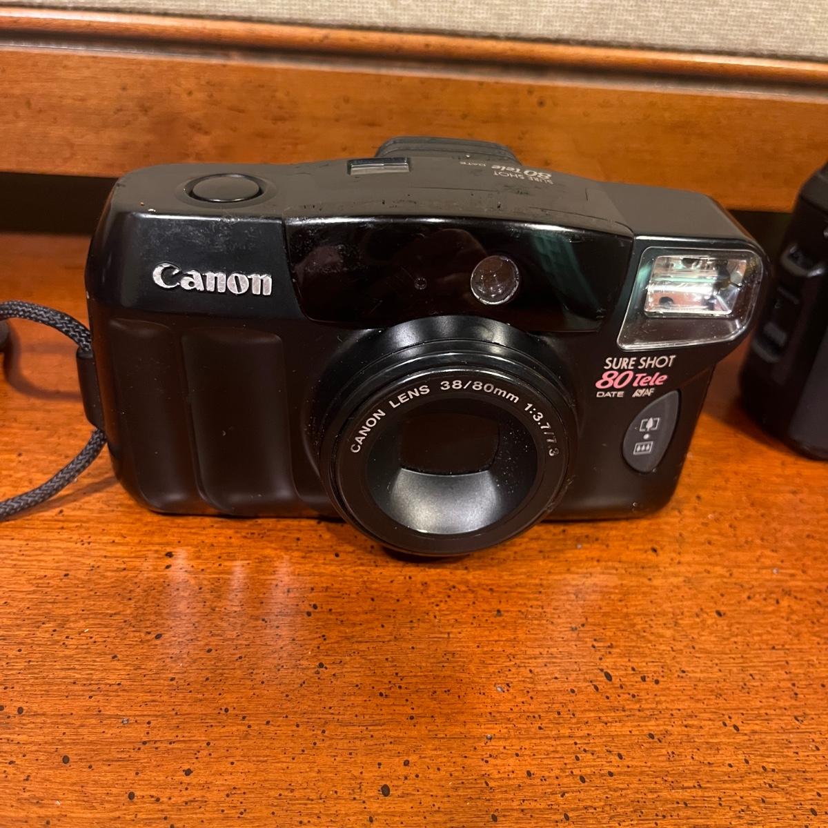 Lot includes a Canon EOS Rebel G 35MM Camera with Tamron 28-200 lense and case. Also includes two Canon Sure Shot 35MM cameras and a Vintage Minolta Minoltina-P 35MM camera. The rubber eye piece is coming up on one side. No cameras were tested.