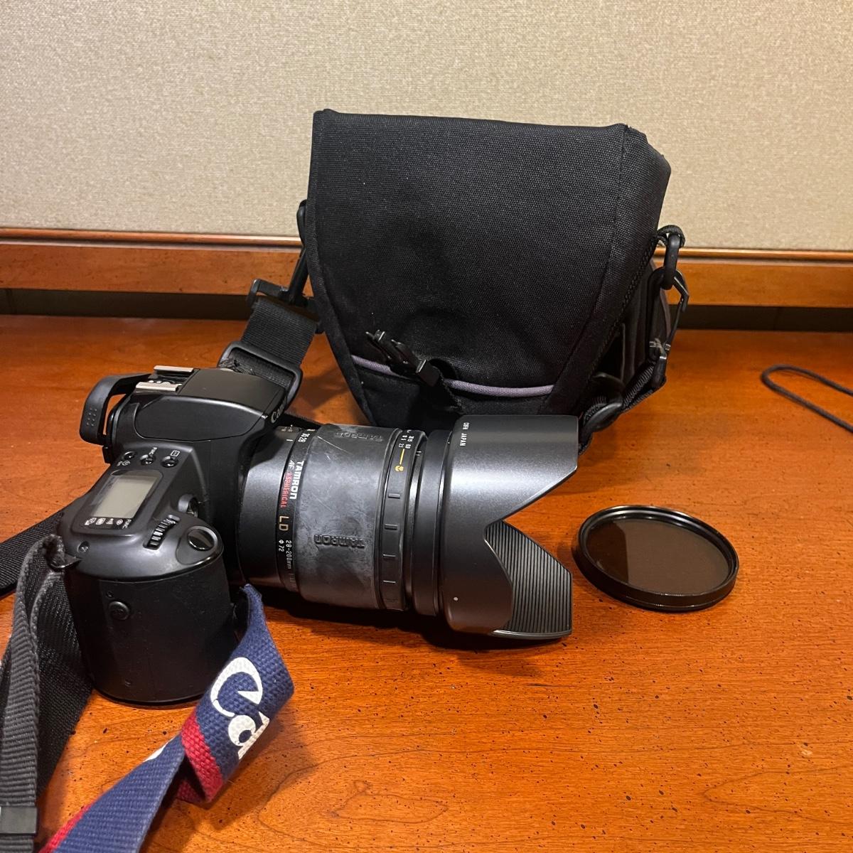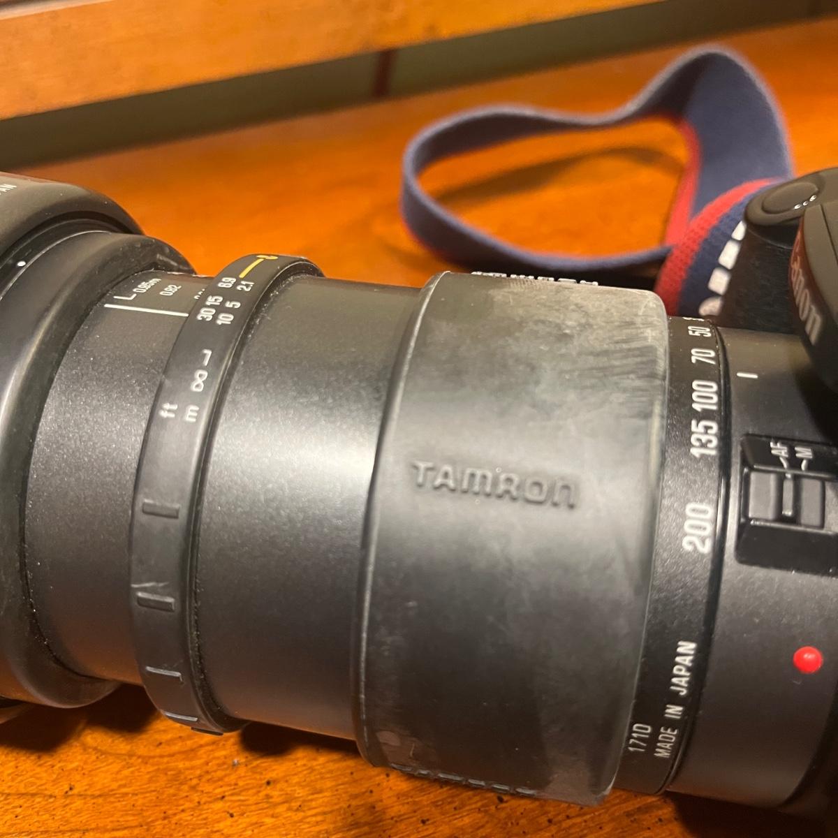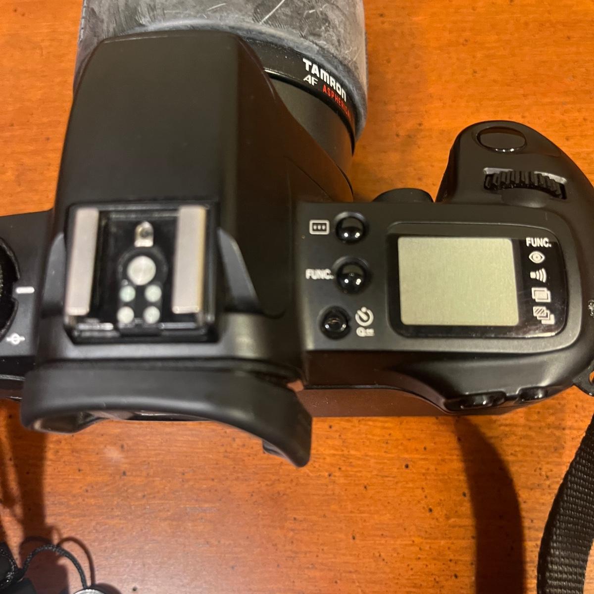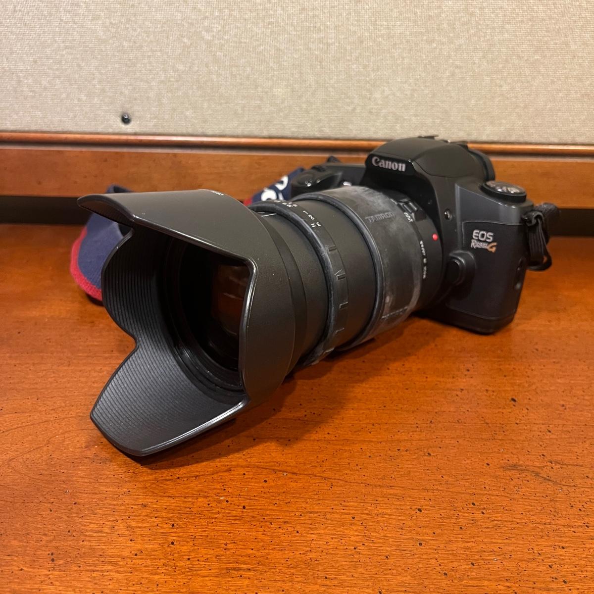 Lot includes a Canon EOS Rebel G 35MM Camera with Tamron 28-200 lense and case. Also includes two Canon Sure Shot 35MM cameras and a Vintage Minolta Minoltina-P 35MM camera. The rubber eye piece is coming up on one side. No cameras were tested.
