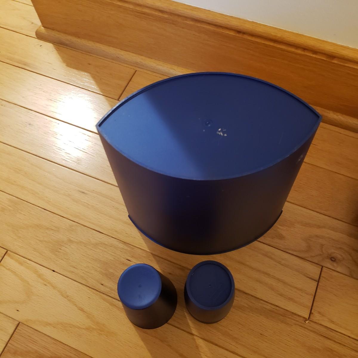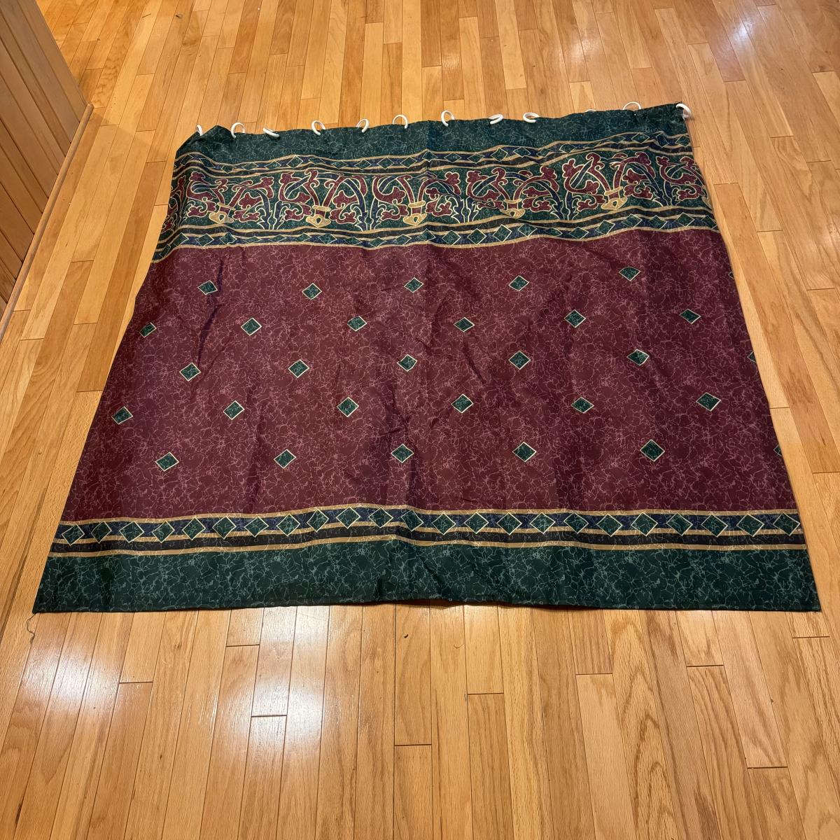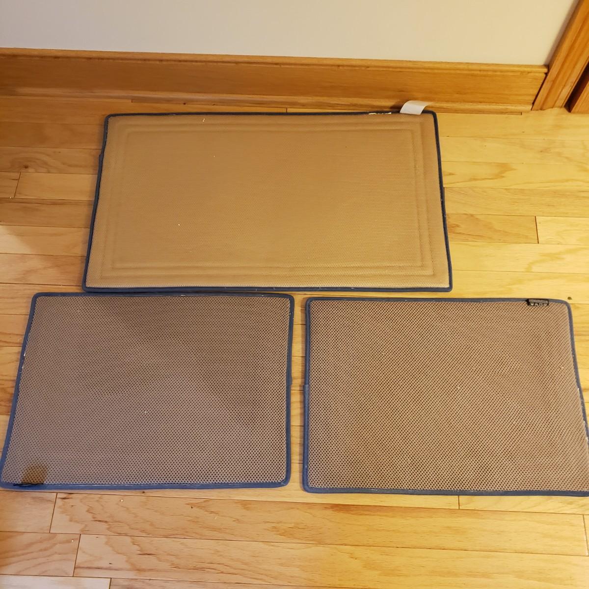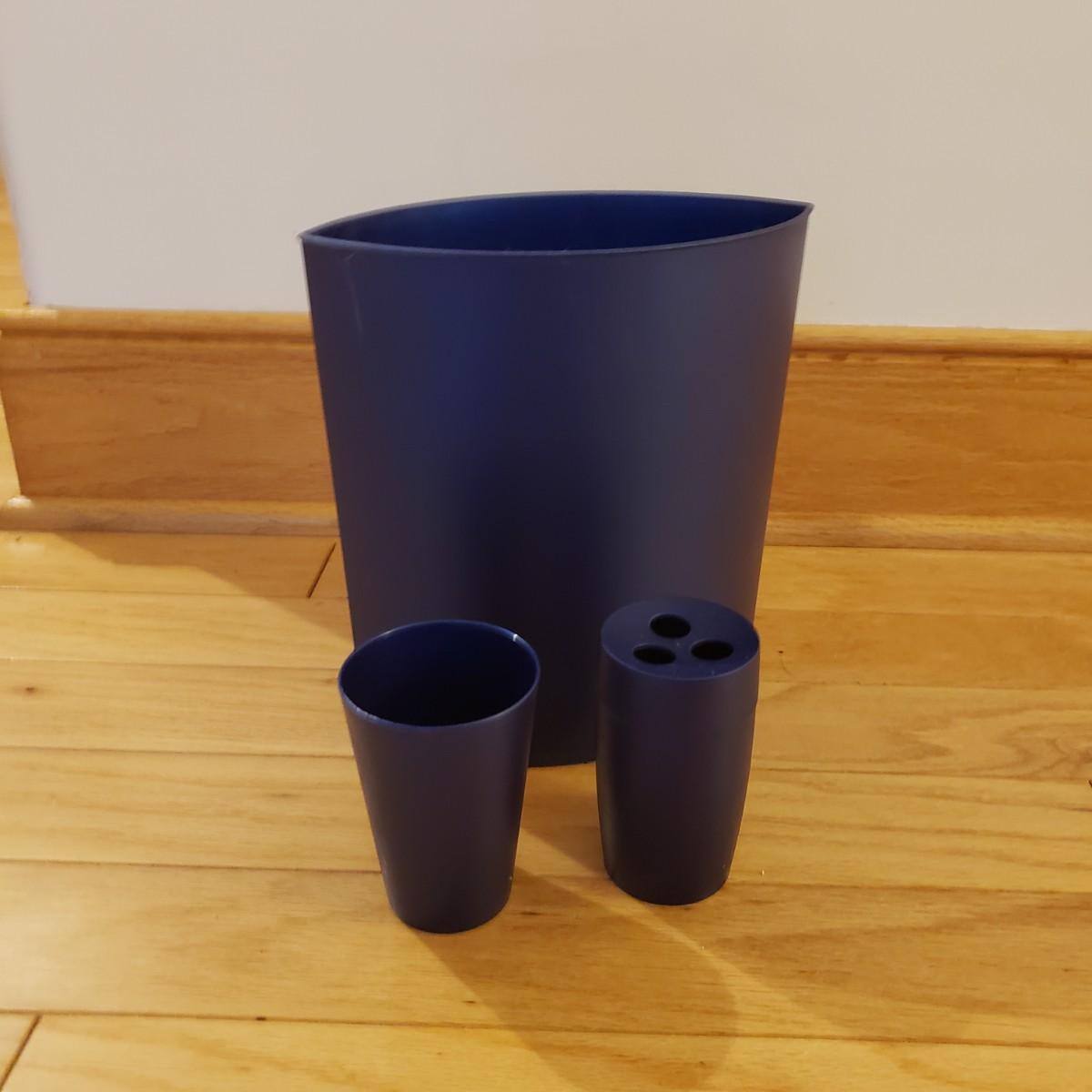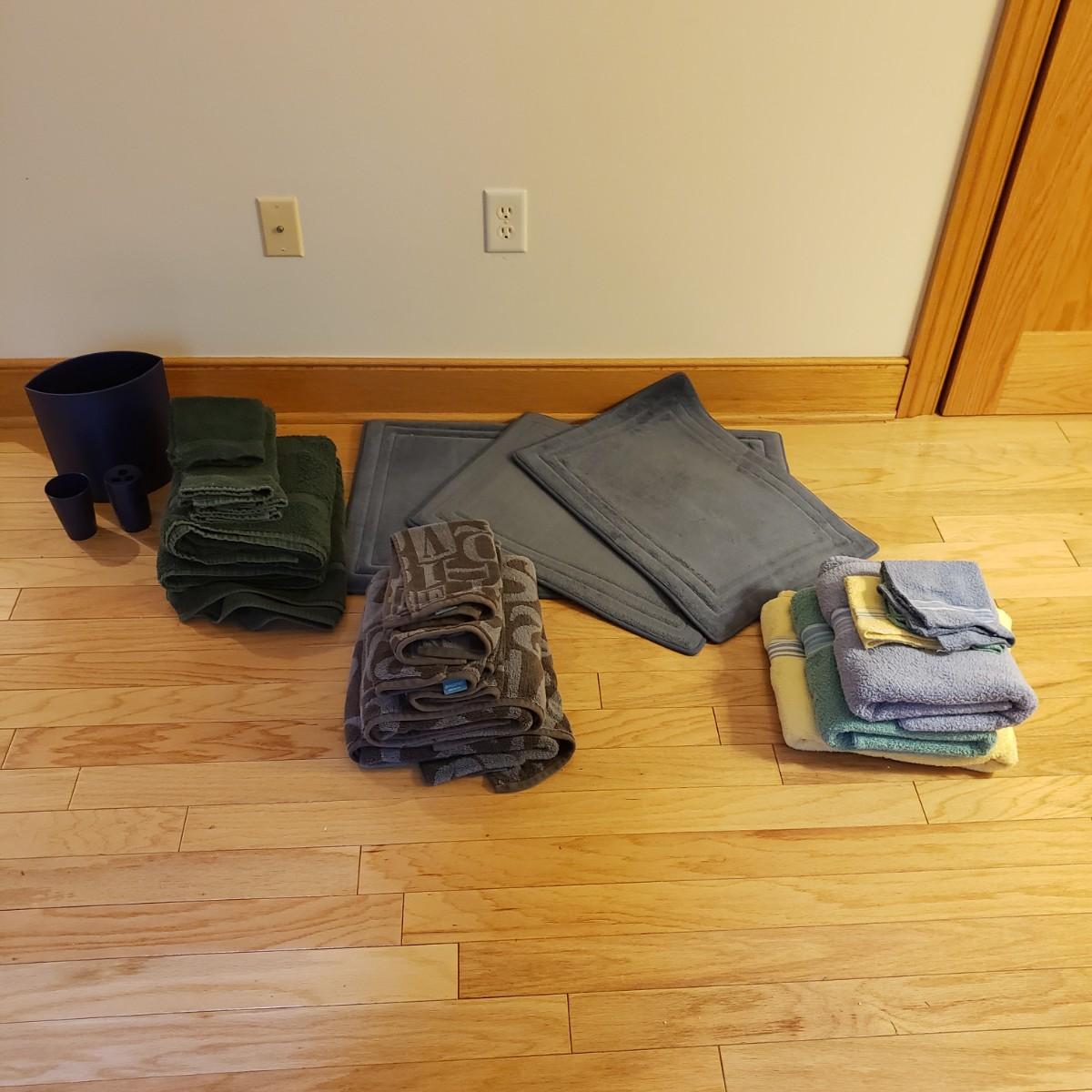 This lot has three sets of towels, three rubber bottomed bath mats, a matching trash can, cup and toothbrush holder and a polyester shower curtain with a thick liner. The set of Canon towels has three bath towels (47" x 28") and three wash cloths. The Target Home set has two bath towels, two hand towels and one wash cloth. The Fieldcrest comes with a bath mat, two bath towels, two hand towels and one wash cloth. The rubber bottomed bath mats are padded with a soft velour material. The largest mat measures 34" x 20". The Authentics brand trash can, cup and toothbrush holder are a matching navy blue.