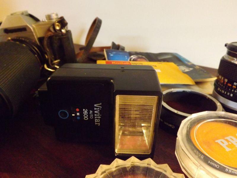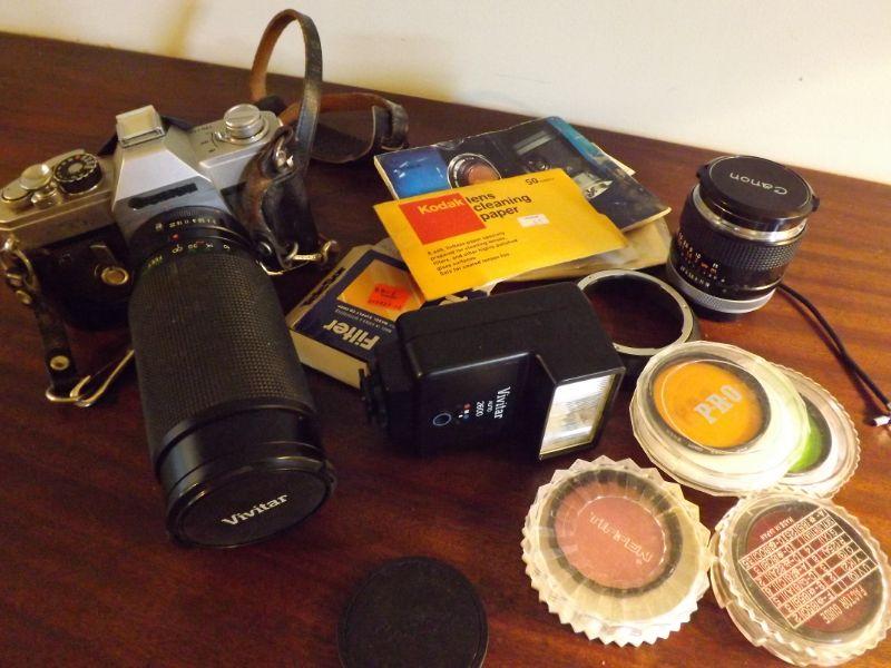 Canon FTb Single-lens Reflex 35mm camera from the early 70's. Comes with 2 lens, 4 filters, Vivitar flash, and a few other items. **Please read Terms and Conditions before placing a bid. Pick up is Sunday, September 1, 2019 from 10am to 4pm in Williamstown. All sales are final. All sales are as is, where is. Please review all photos. Any props included in photos are not included in listing. All measurements are approximate. From home with cats.