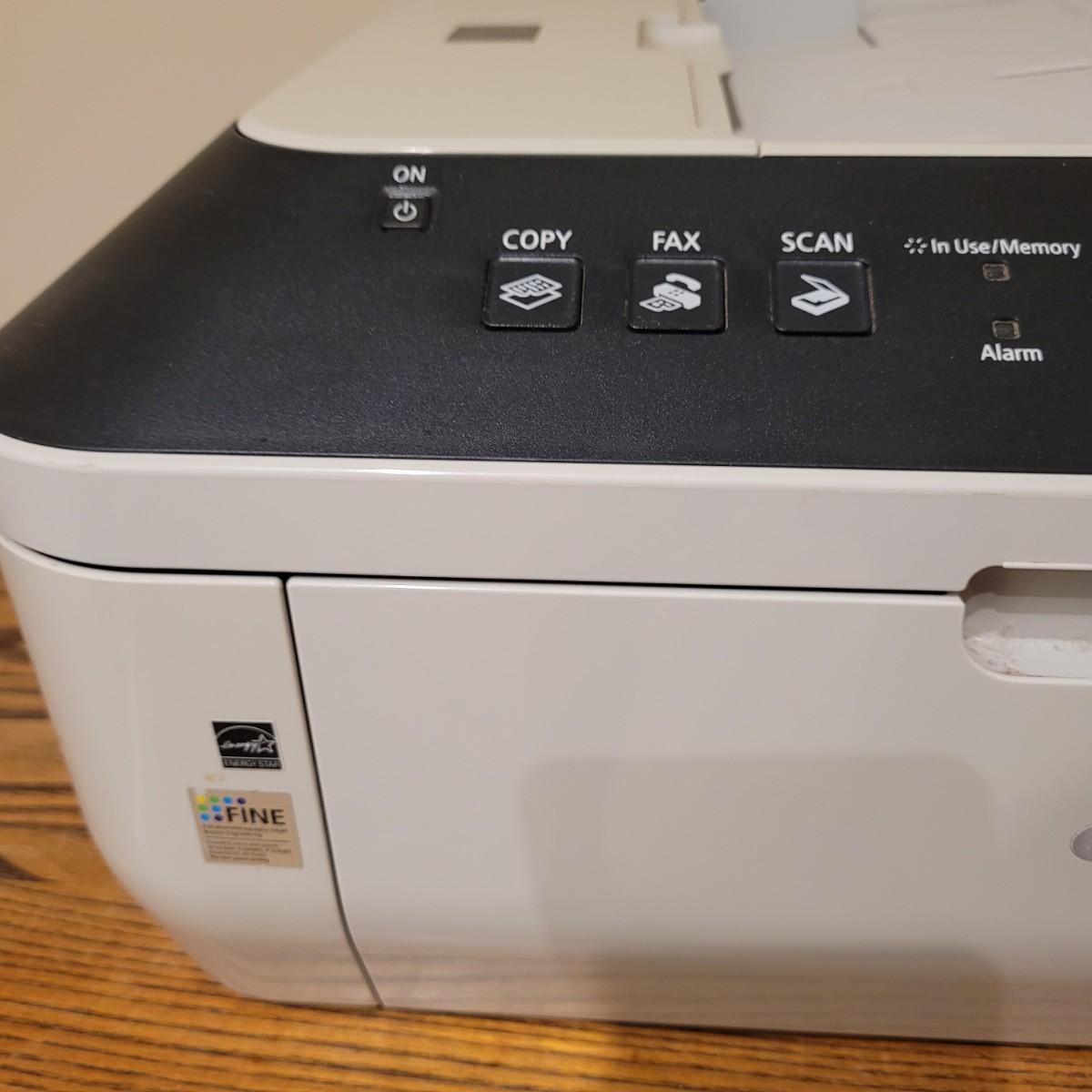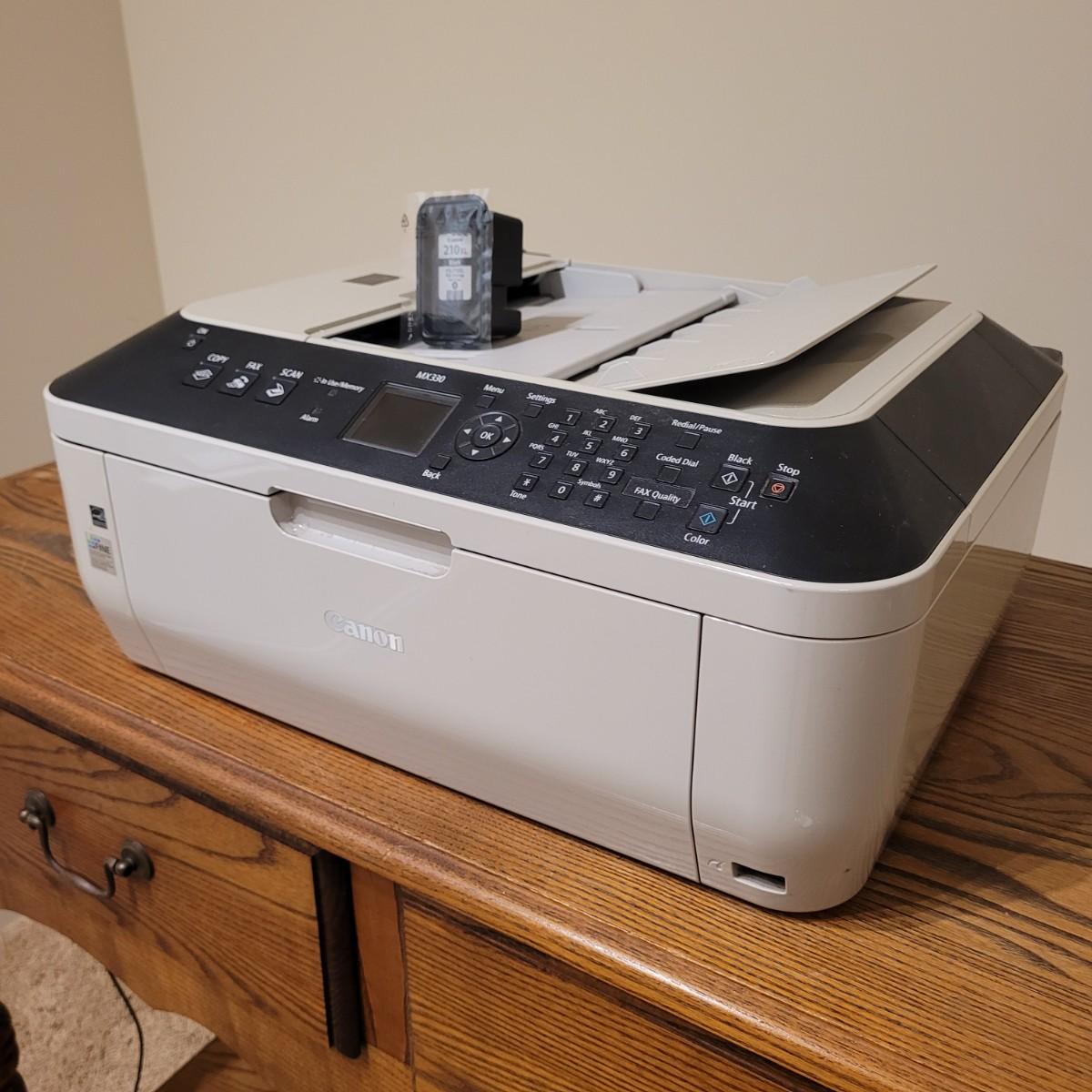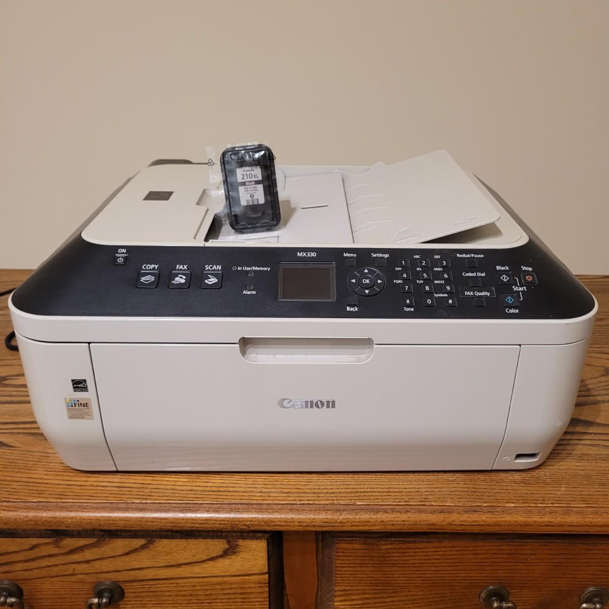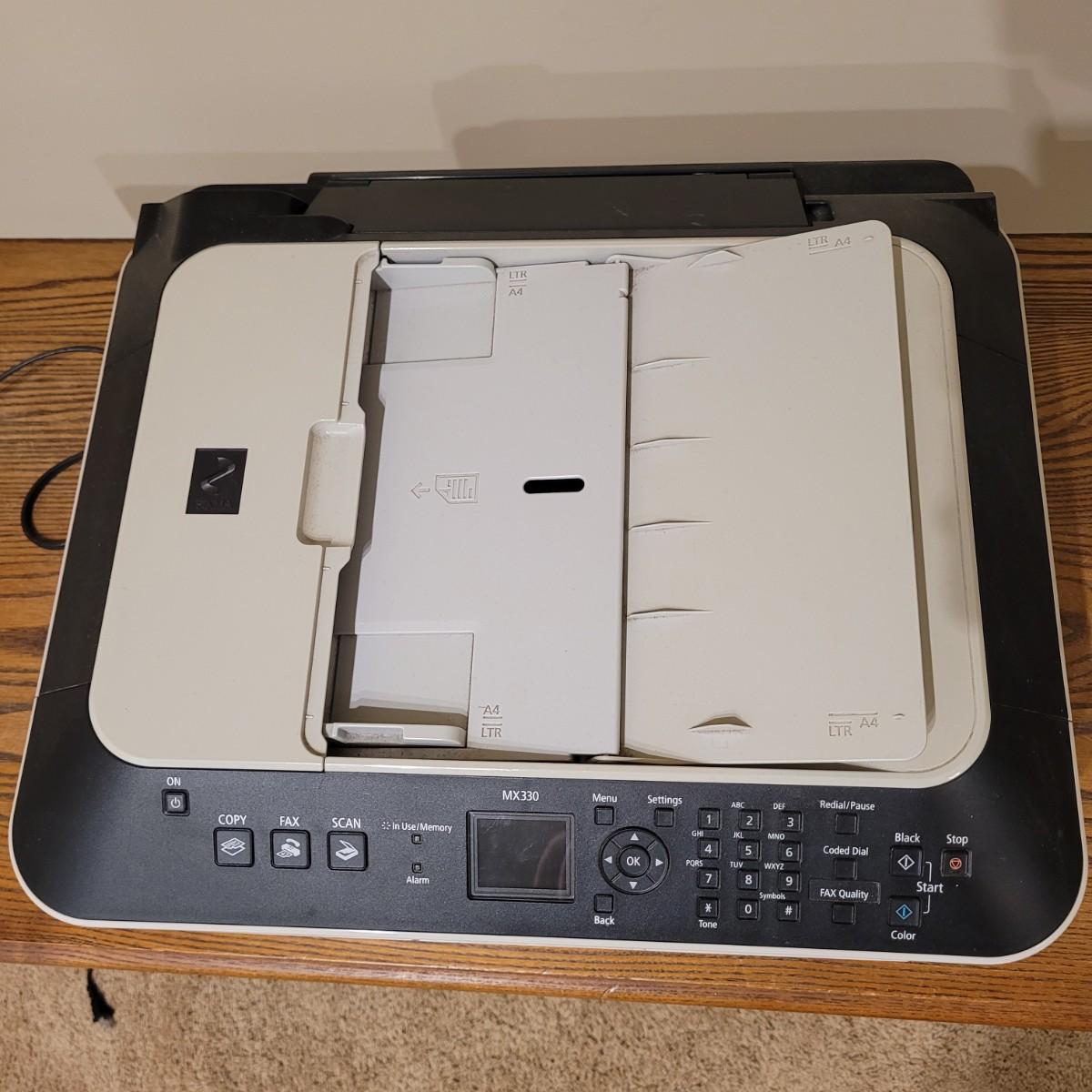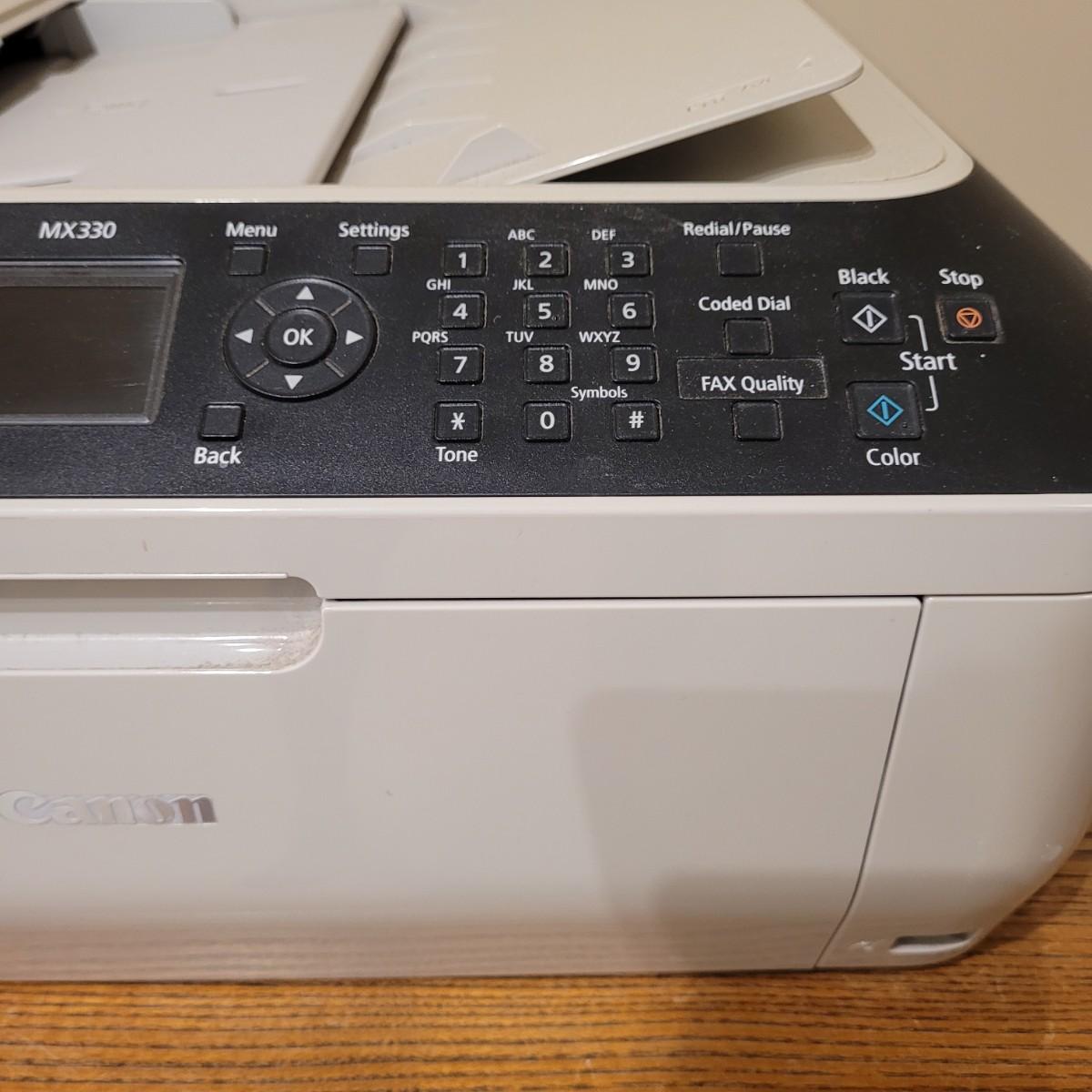 This lot includes on Canon MX330 all in one printer. The Canon PIXMA MX330 is an all-in-one inkjet printer, copier, scanner, and fax machine designed for home or small office use featuring a 1.8-inch LCD screen for computer-free operation, and PictBridge compatibility for direct camera printing. It lacks wireless capabilities but connects via USB. Power and USB cables are included. This item powered on when plugged in. The printer measures 18"x 17" x 9"H. It includes one package of new black ink. Background table is for sale in another lot.