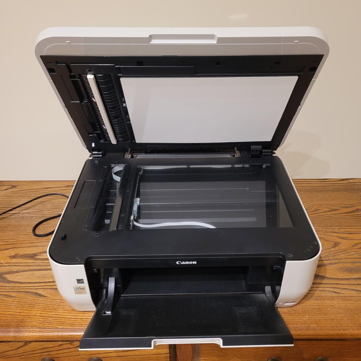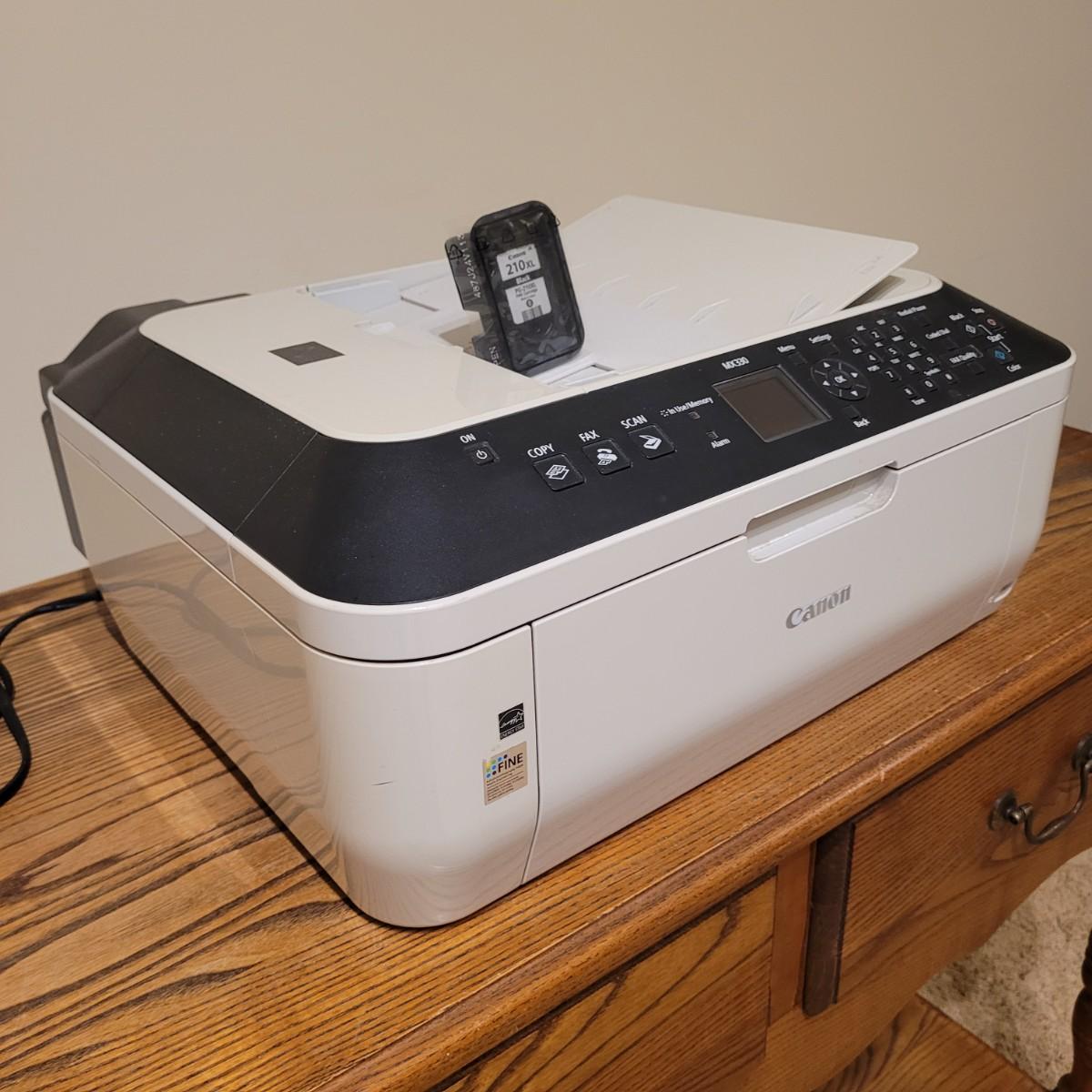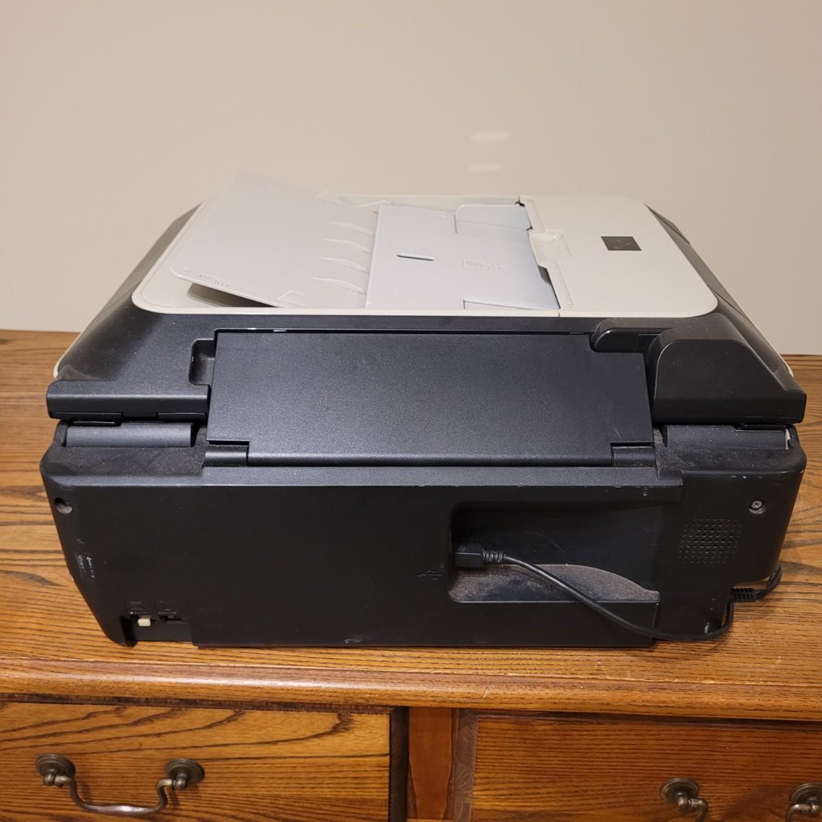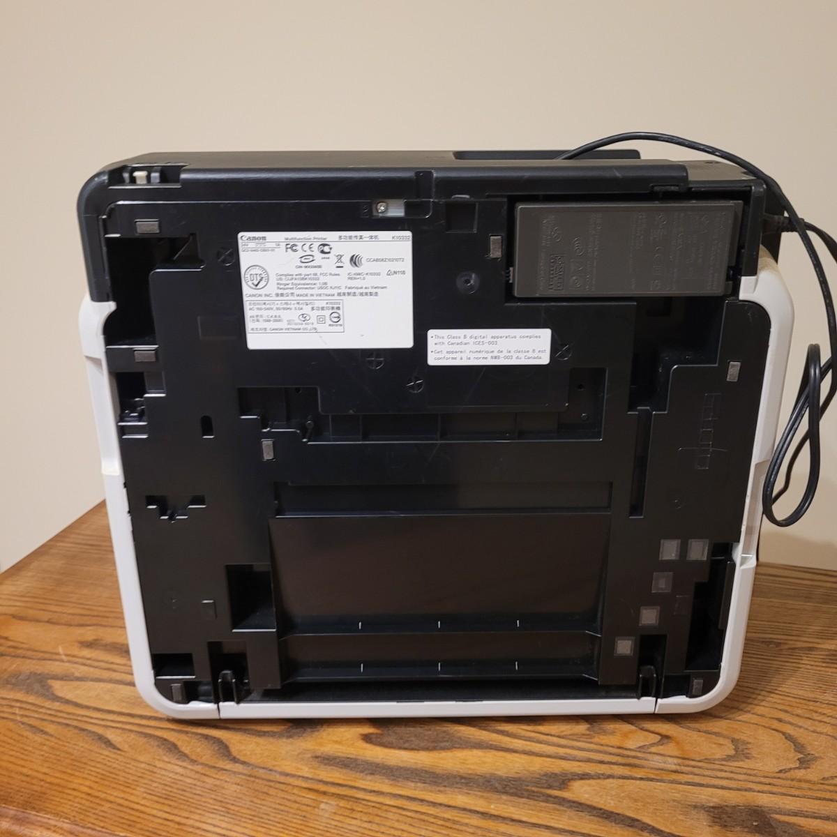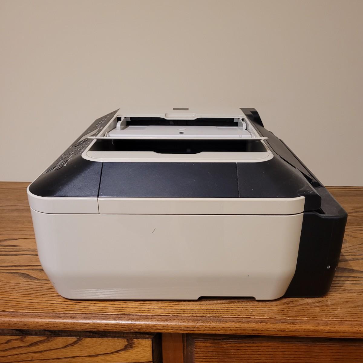 This lot includes on Canon MX330 all in one printer. The Canon PIXMA MX330 is an all-in-one inkjet printer, copier, scanner, and fax machine designed for home or small office use featuring a 1.8-inch LCD screen for computer-free operation, and PictBridge compatibility for direct camera printing. It lacks wireless capabilities but connects via USB. Power and USB cables are included. This item powered on when plugged in. The printer measures 18"x 17" x 9"H. It includes one package of new black ink. Background table is for sale in another lot.