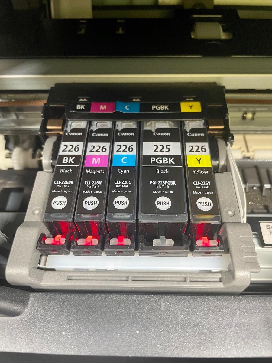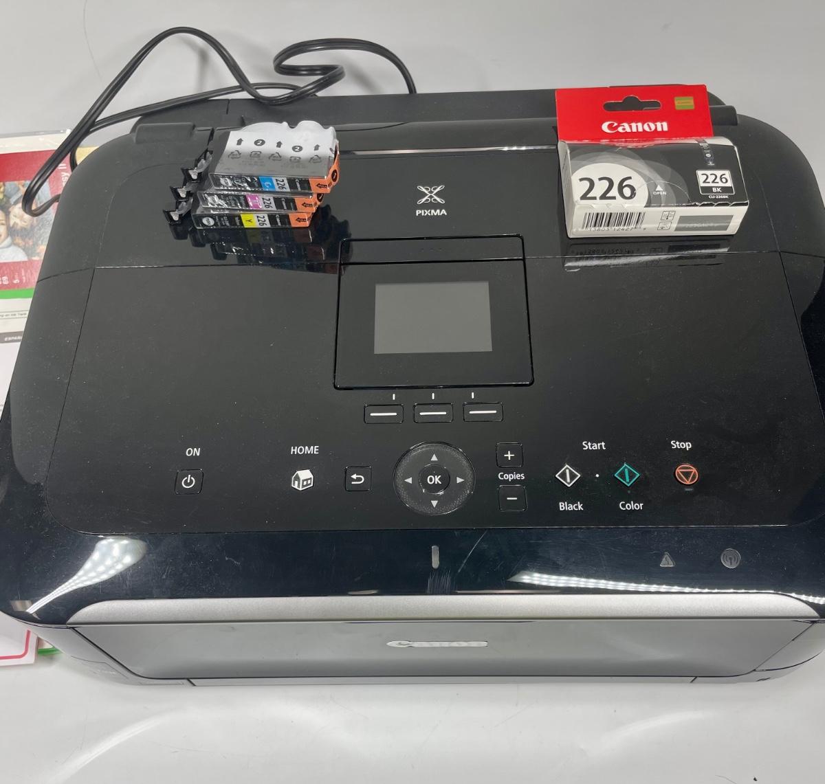 Canon PIXMA MG5320 Wireless Inkjet Photo All-In-One Printer. Near new condition. Includes power cord, printer cable, 5 installed ink cartridges (Canon 226 Black, Magenta, Cyan, Yellow, and 225 Page Black), and 4 new, unopened 226 Black, Yellow, Magenta, and Cyan cartridges. Powered on, Home Screen shows status of printer.