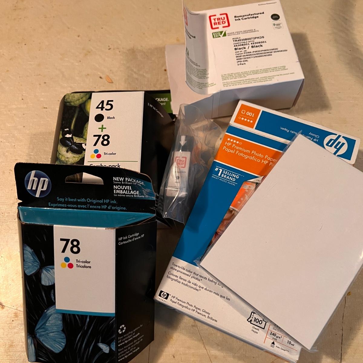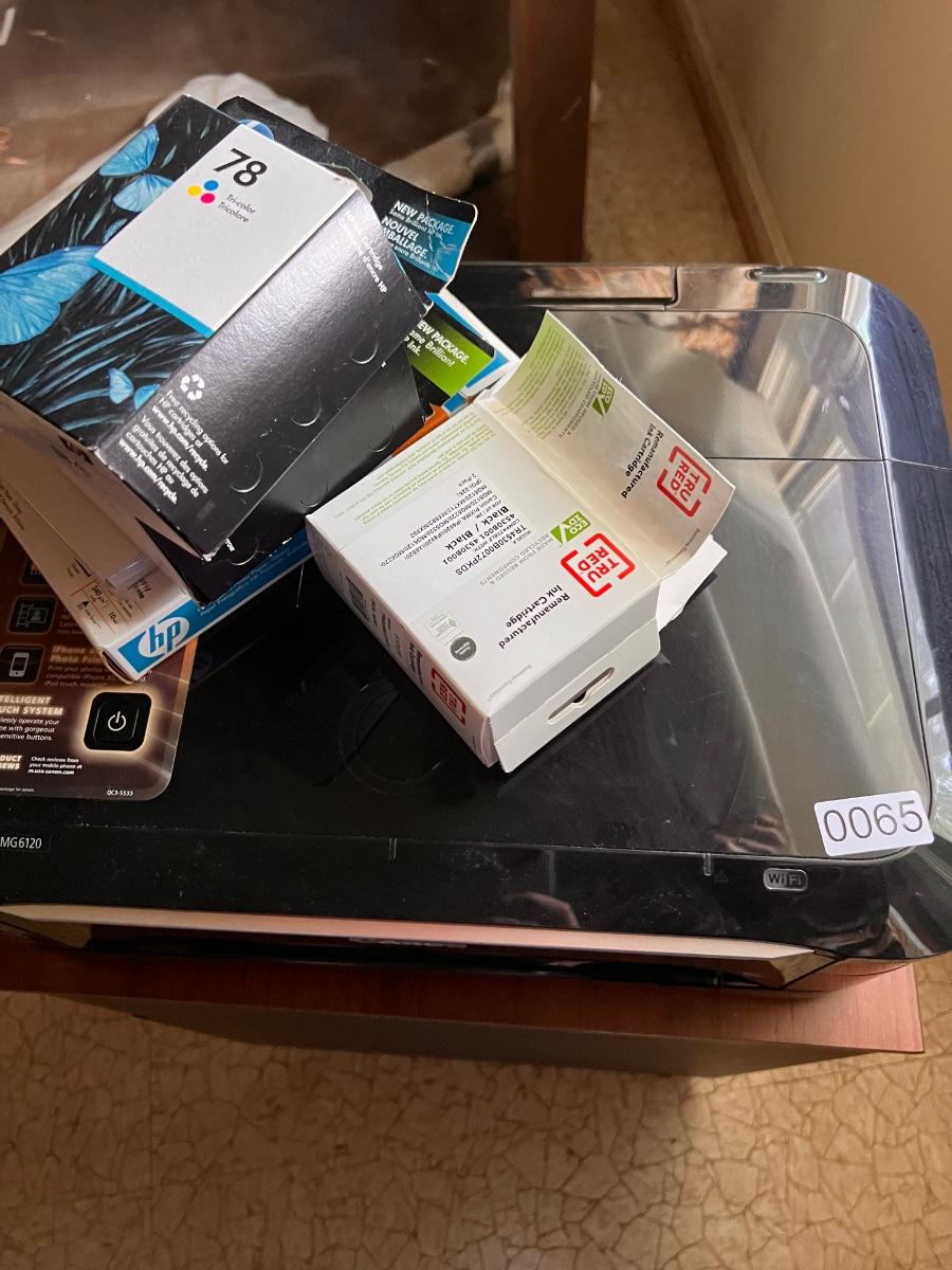 In good used condition. Tested power works. Includes HP ink and photo paper.