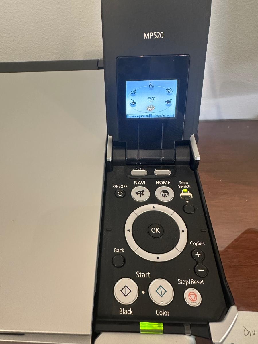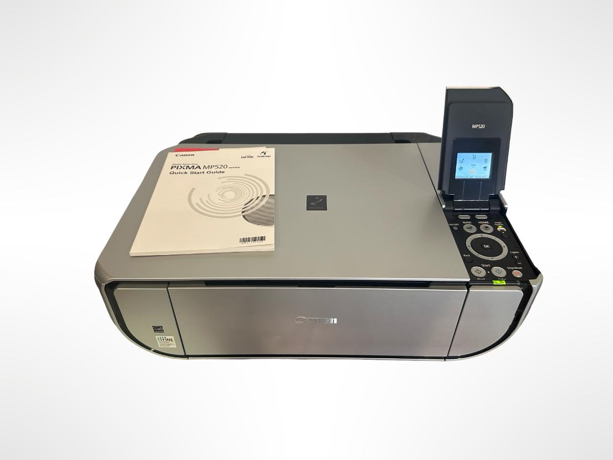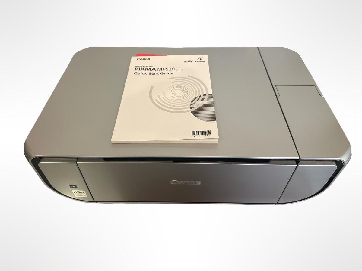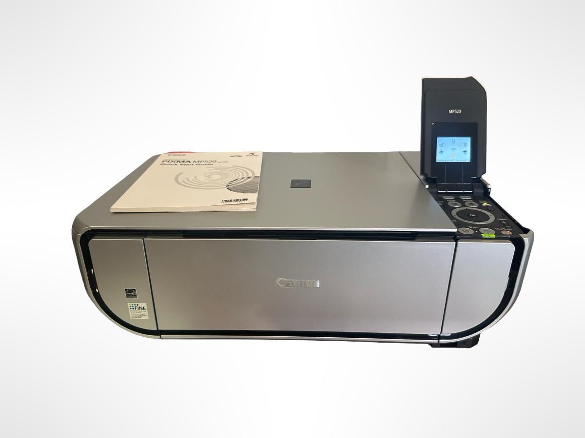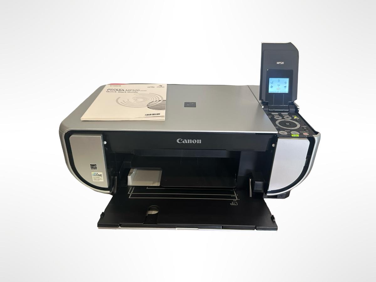 Canon PIXMA MP520 all-in-one printer with flatbed scanner and copy function. Powers on and display lights up (see photos). Includes power cord and manuals. Ink levels/printing not fully tested. Sold as-is.