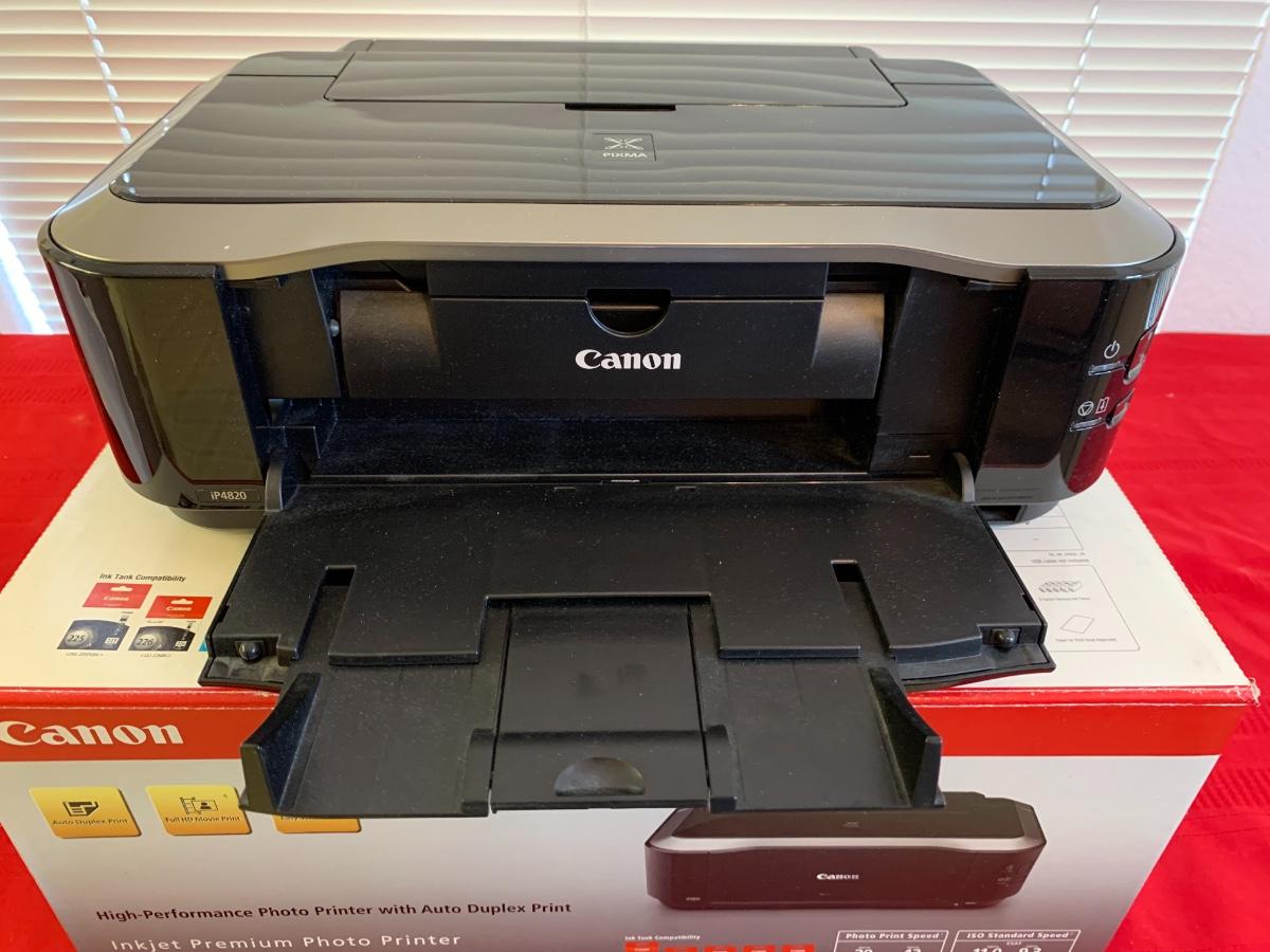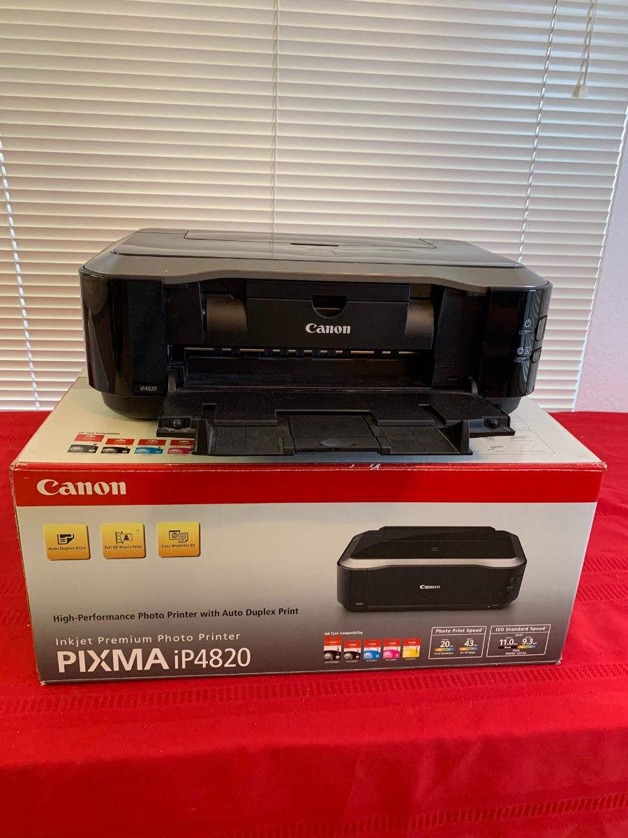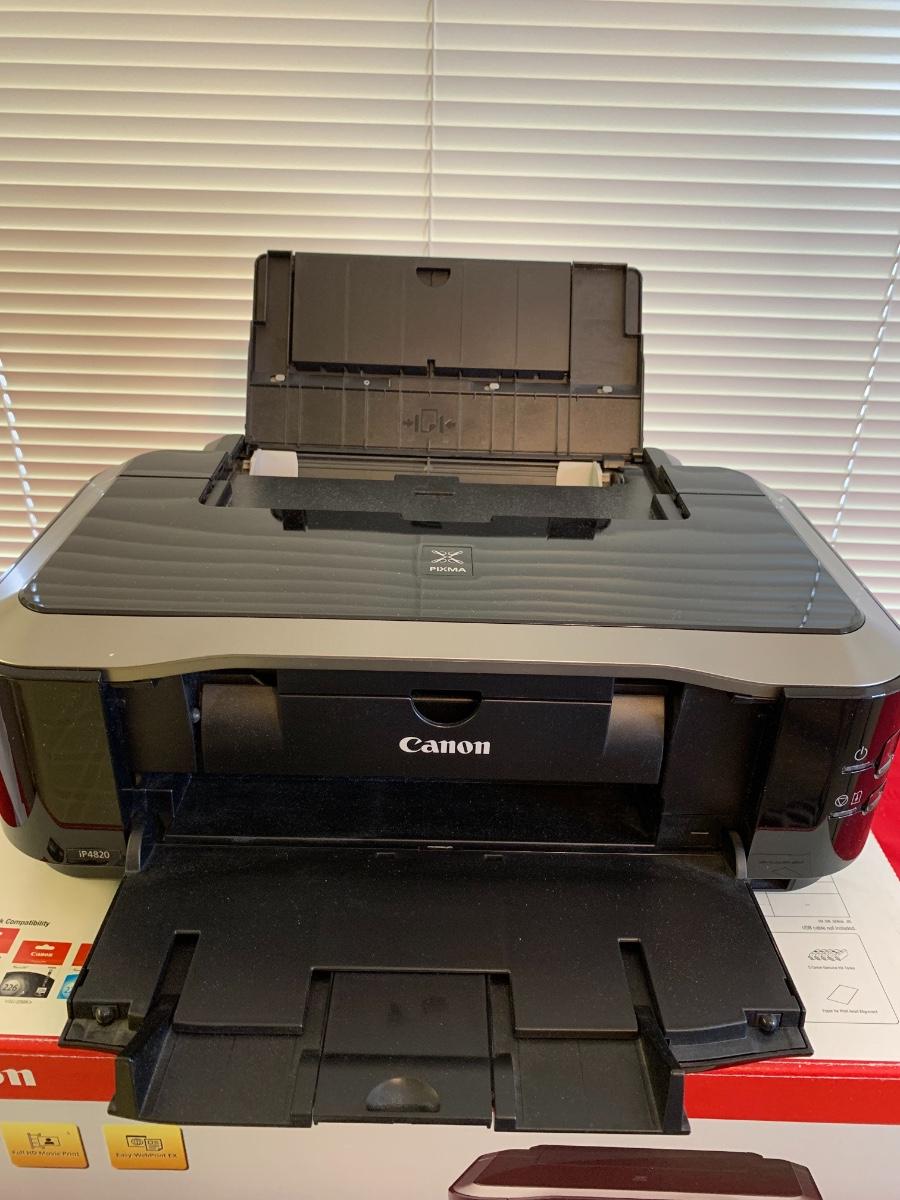 Canon Pixma iP4820 printer in original box. Item appears used, possibly missing bottom piece? Untested, has power cord and printer driver disc.