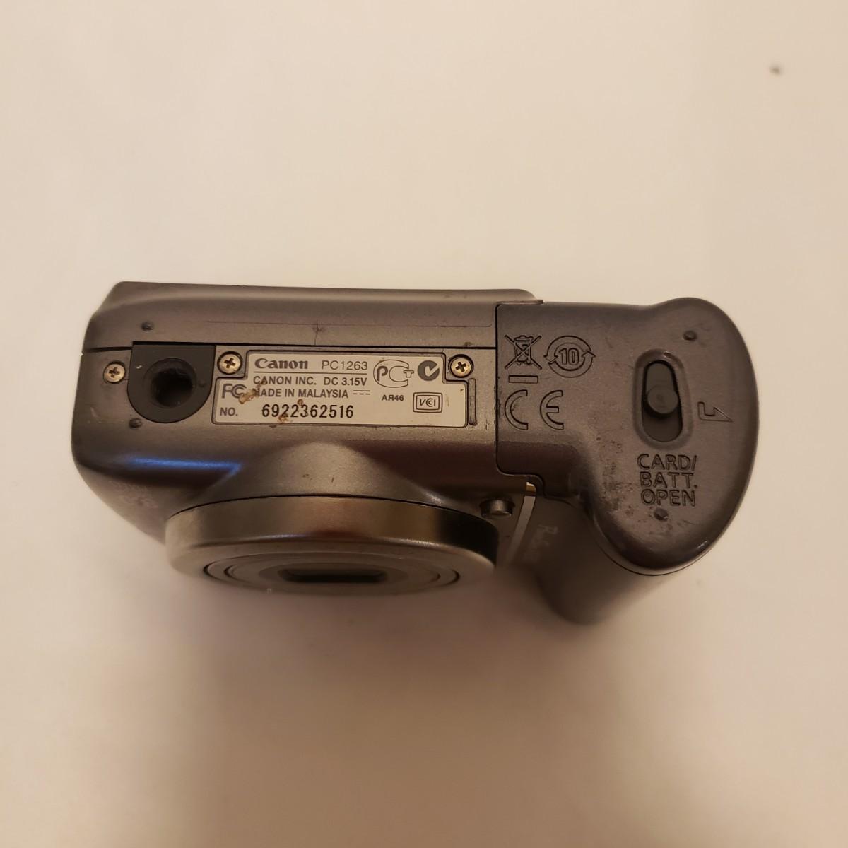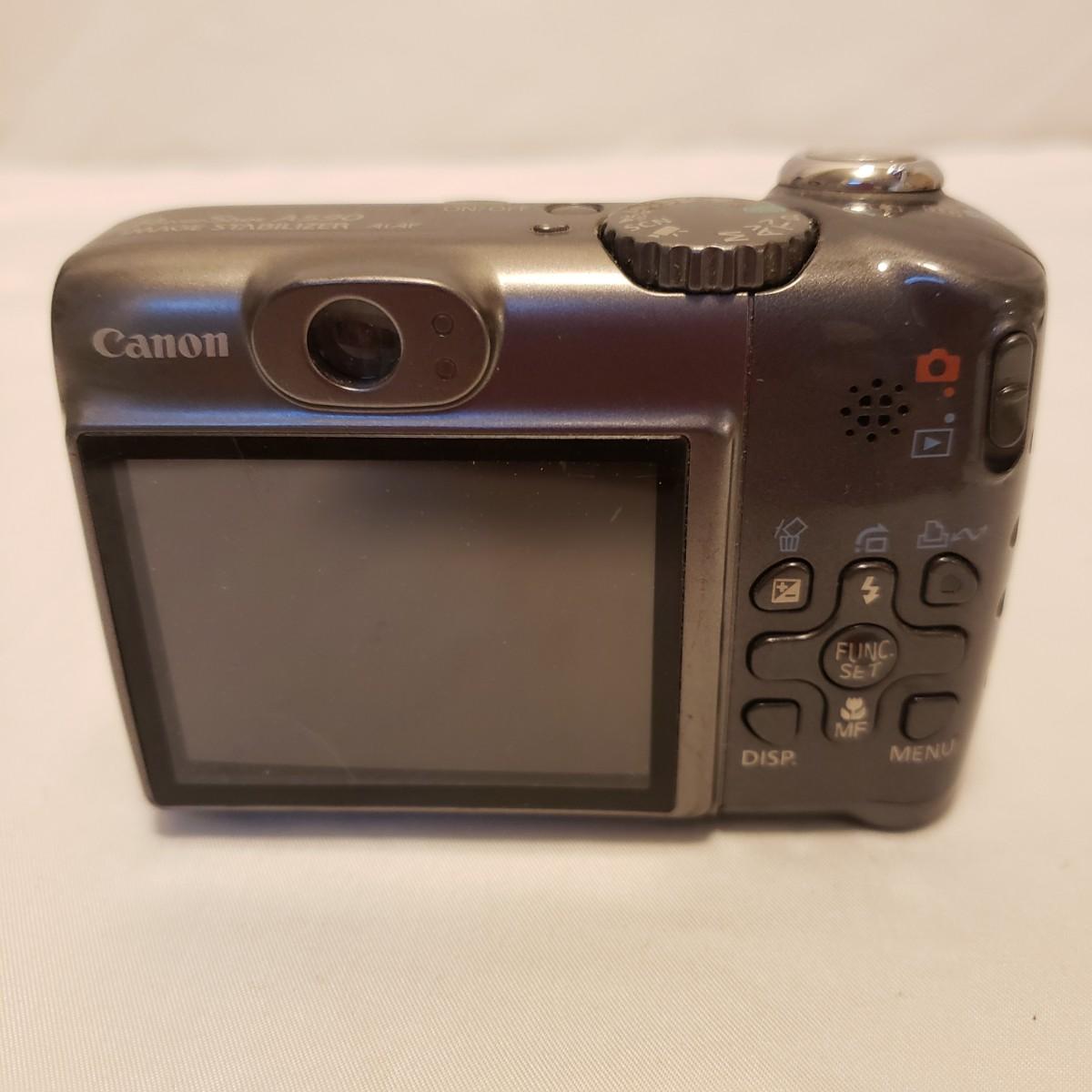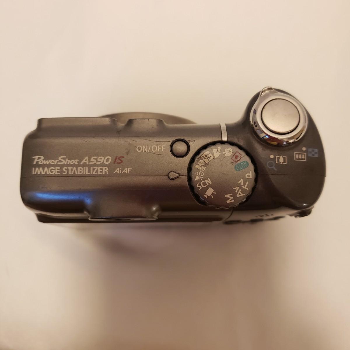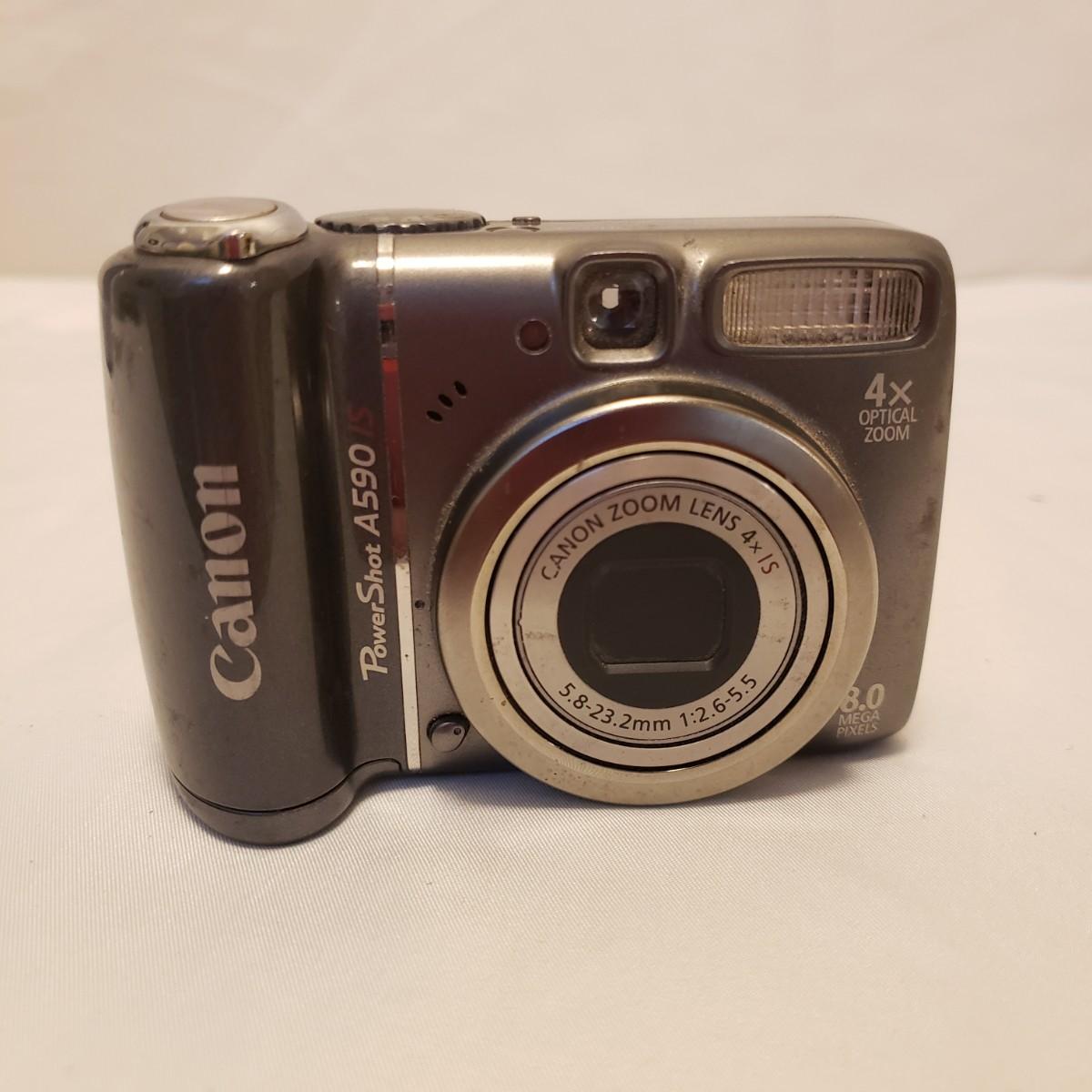 This lot contains two digital cameras. One is a Canon Powershot A590, with a zoom lens 4x15, eight megapixels and a 14 optical zoom. The model number is PC1263. It takes two AA batteries. This camera does not come with an owners manual.