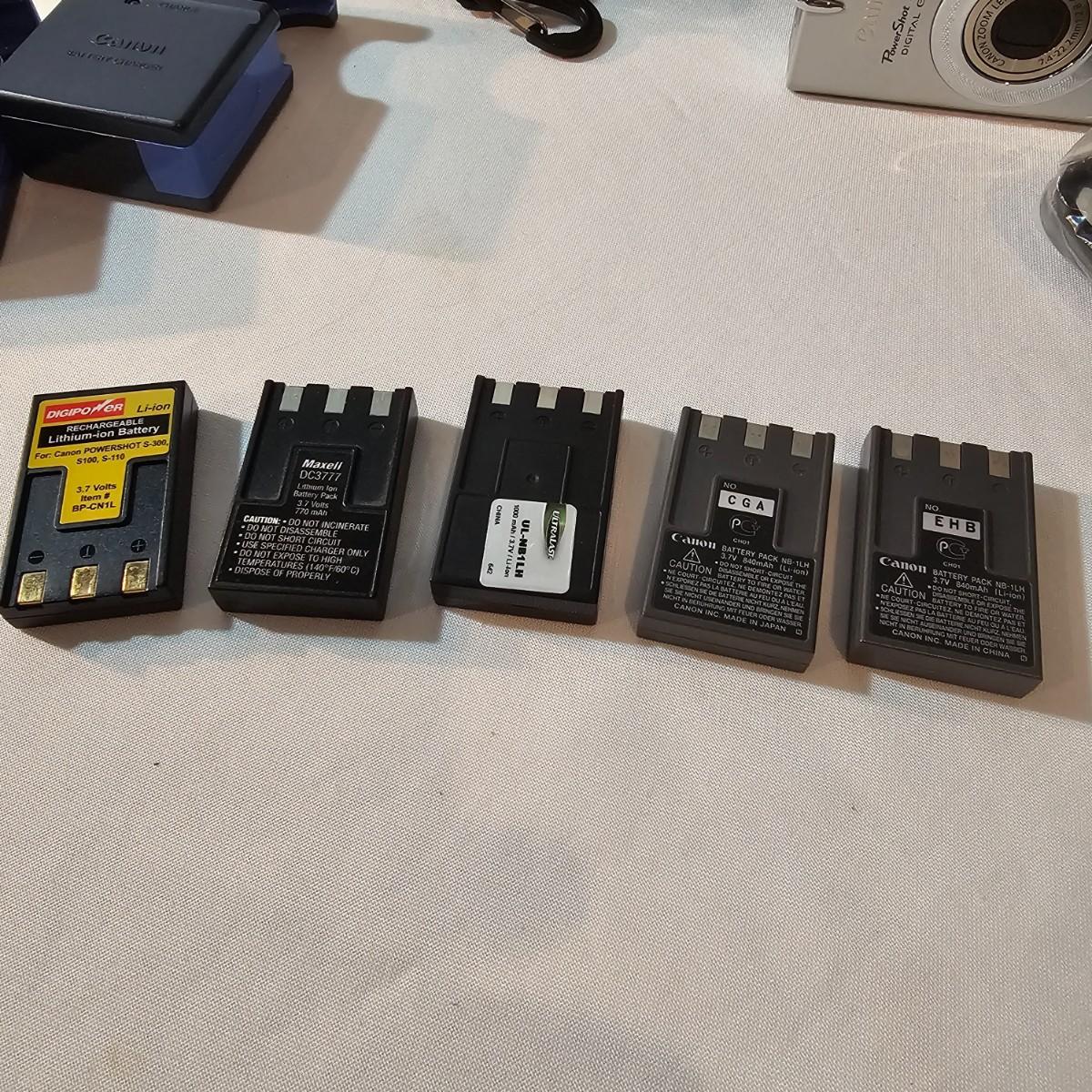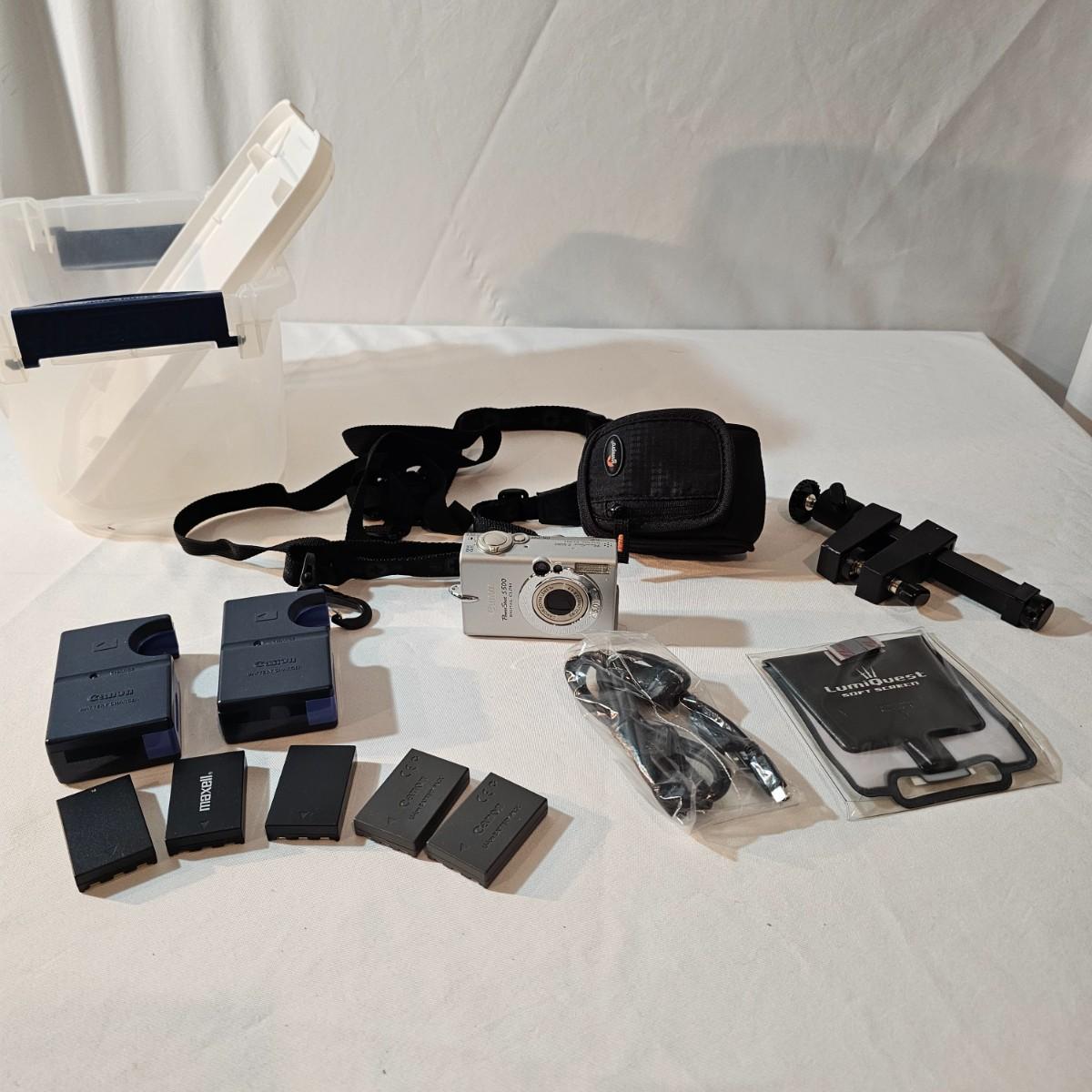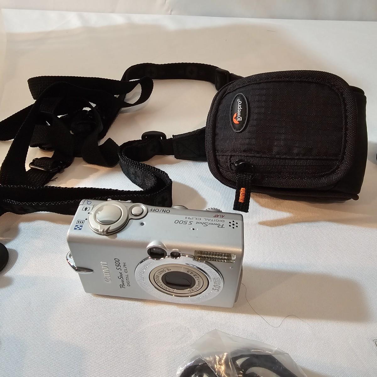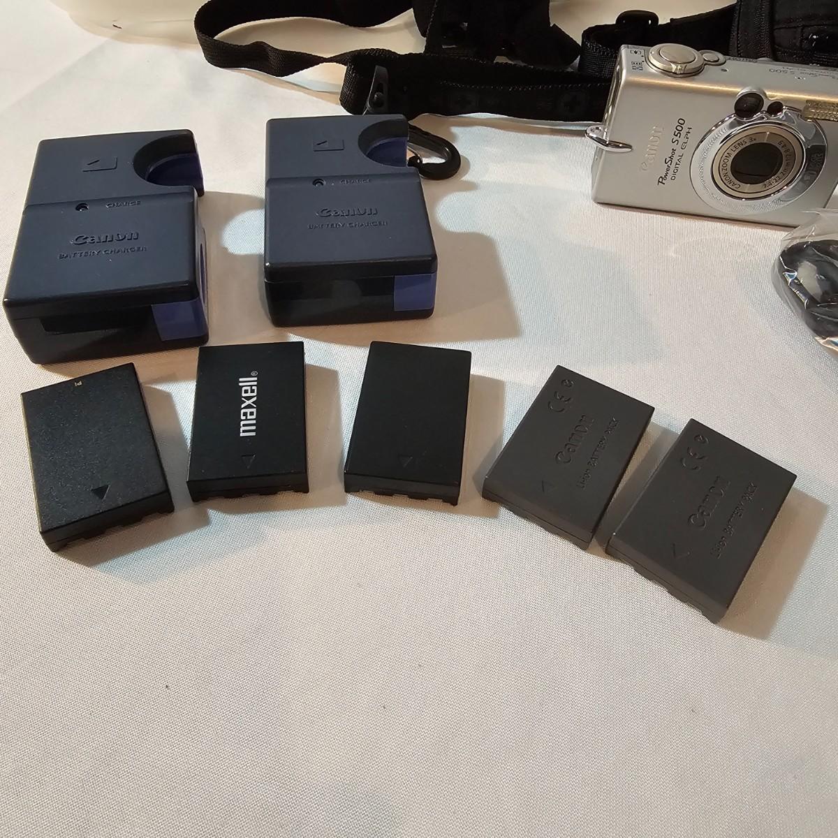 One Canon digital camera, model PowerShot S500. 5.0 mega pixels resolution. Includes case, two battery chargers, five batteries, AV cords, straps, mini tripod, more. Has one 1 GB memory card. Camera powered on when turned on. Includes storage bin. See photos for details. Shipping available.