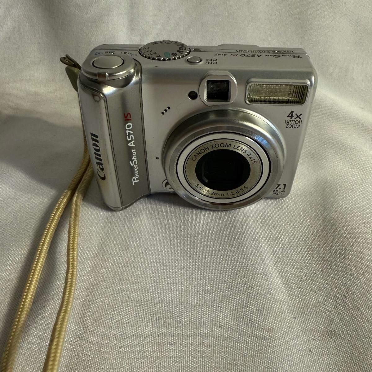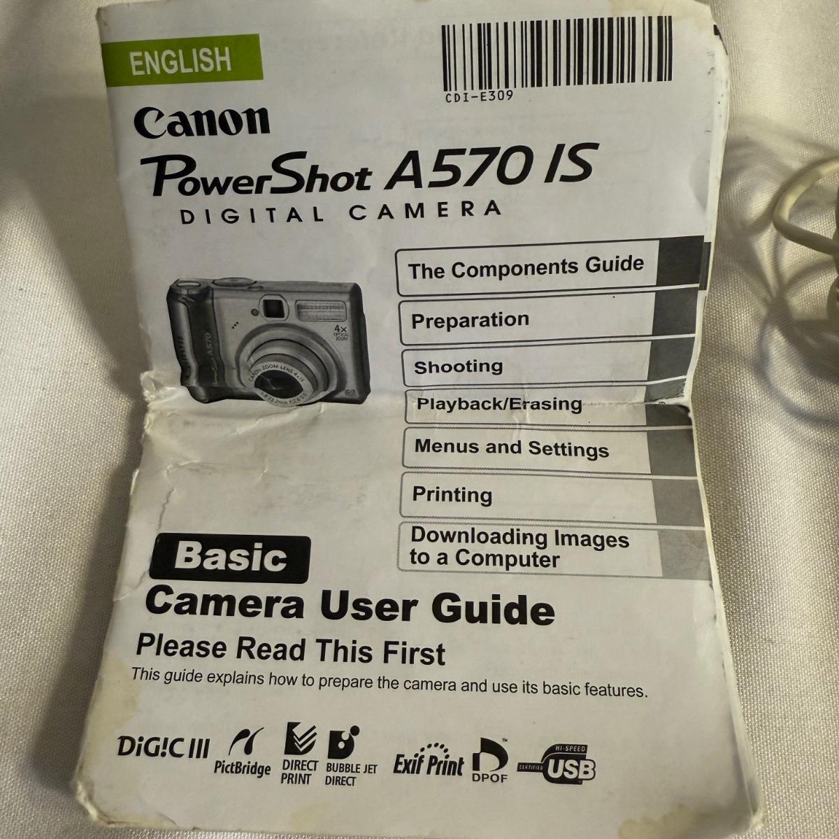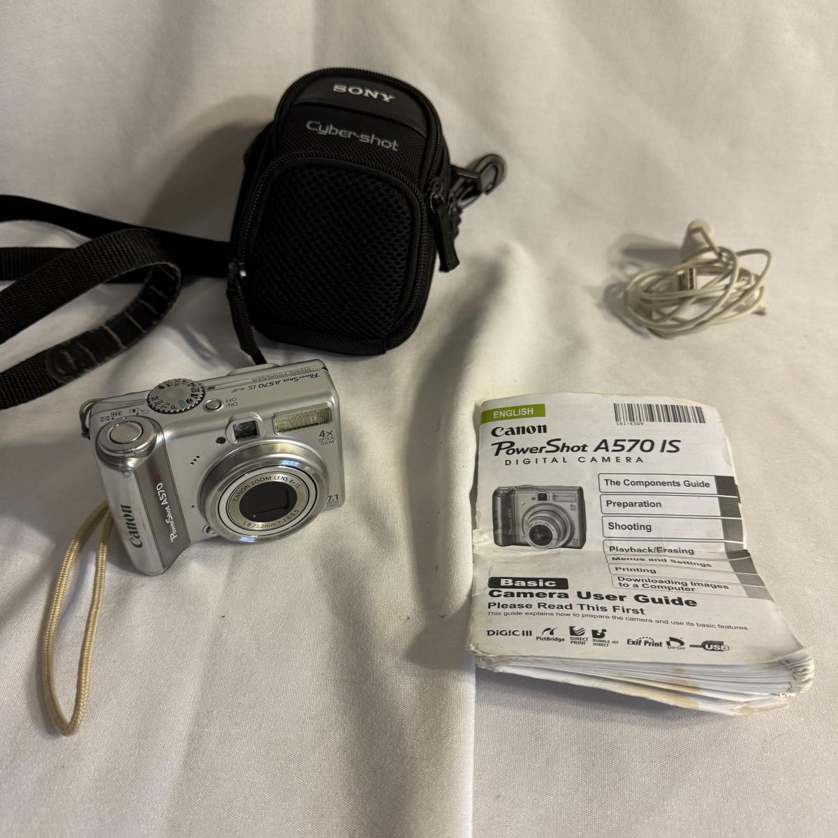 This lot contains a Canon Powershot A570 IS compact digital camera. This camera has several settings and can record videos or take pictures. It has a 2.5” screen display. This item does power on and comes with a case, a USB power cord, and the owners manual. This item measures 3.5” x 2.5” x 1.5”. Shipping available.