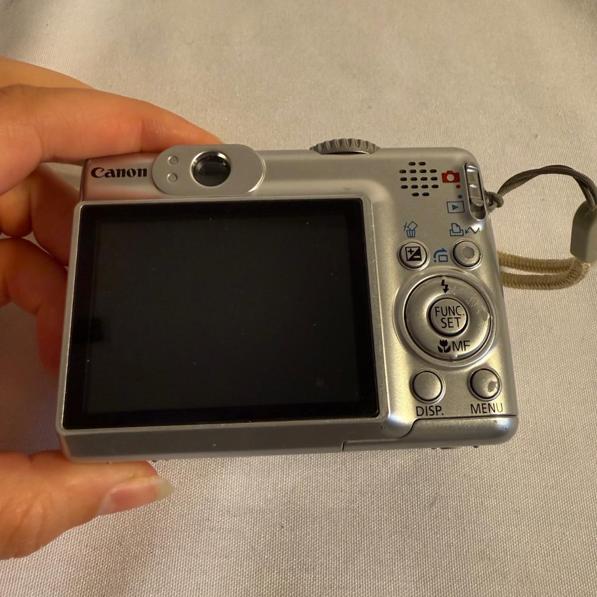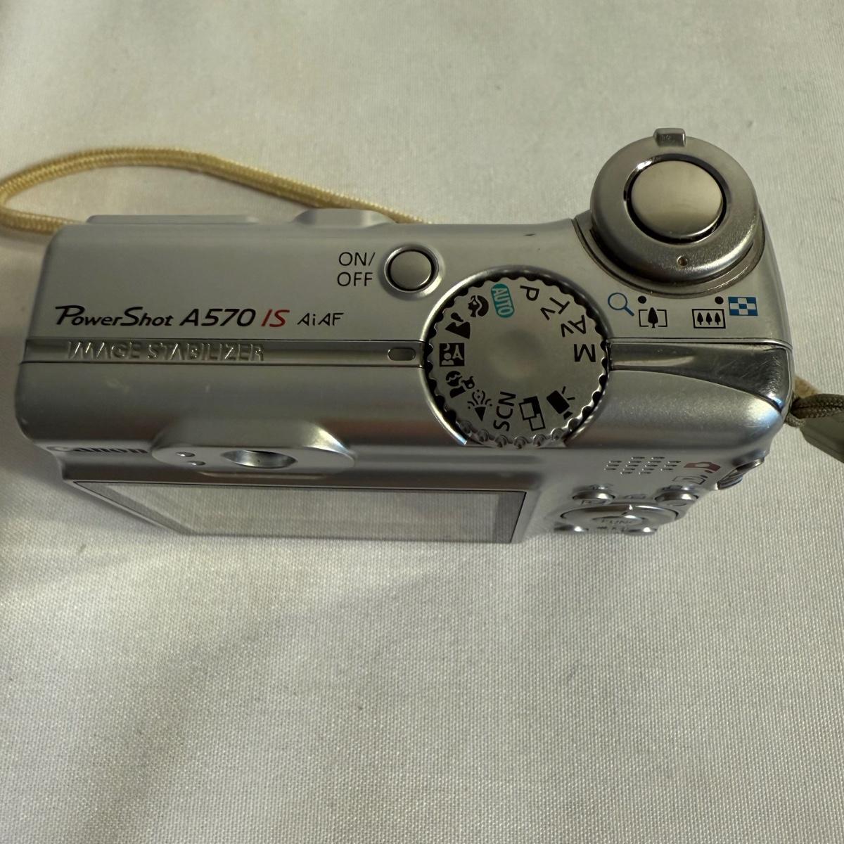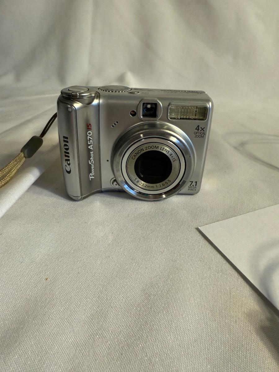 This lot contains a Canon Powershot A570 IS compact digital camera. This camera has several settings and can record videos or take pictures. It has a 2.5” screen display. This item does power on and comes with a case, a USB power cord, and the owners manual. This item measures 3.5” x 2.5” x 1.5”. Shipping available.