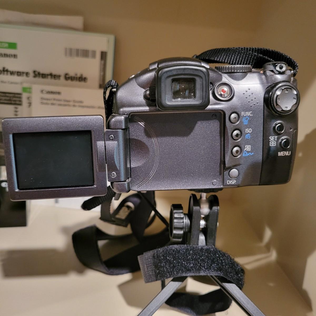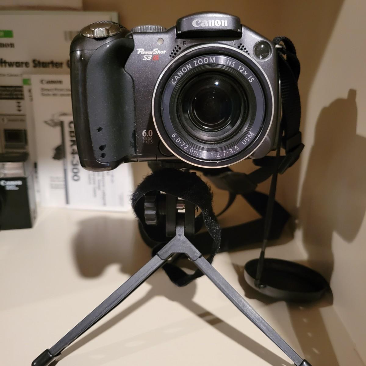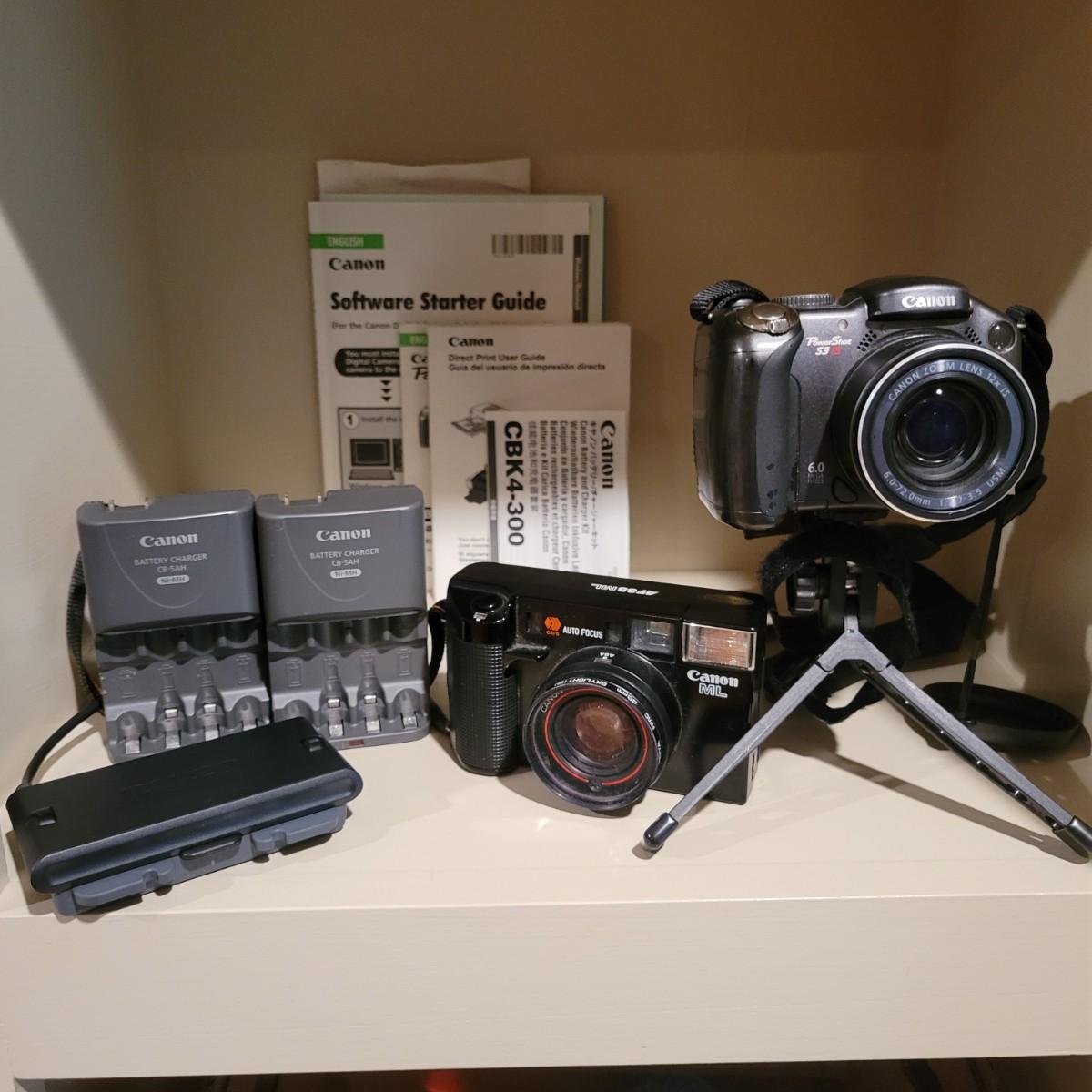 A pair of Canon cameras and additional accessories. One camera os a PowerShotS3IS digital camera that could not be tested due to needing rechargeable batteries. Includes all the original manuals. This lot also includes an AF35ML film camera that powered on. Also includes a small portable tripod and multiple chargers. Shipping available