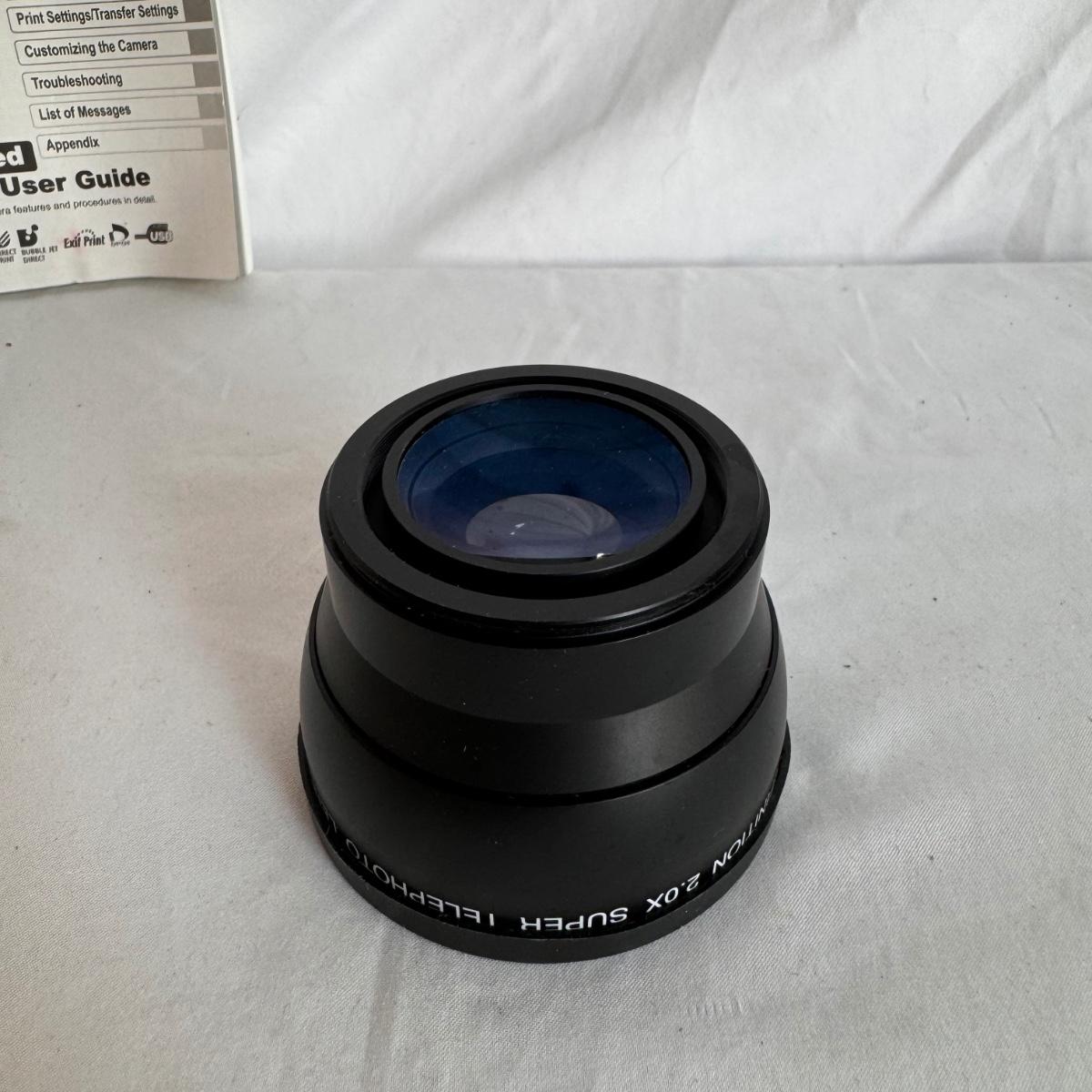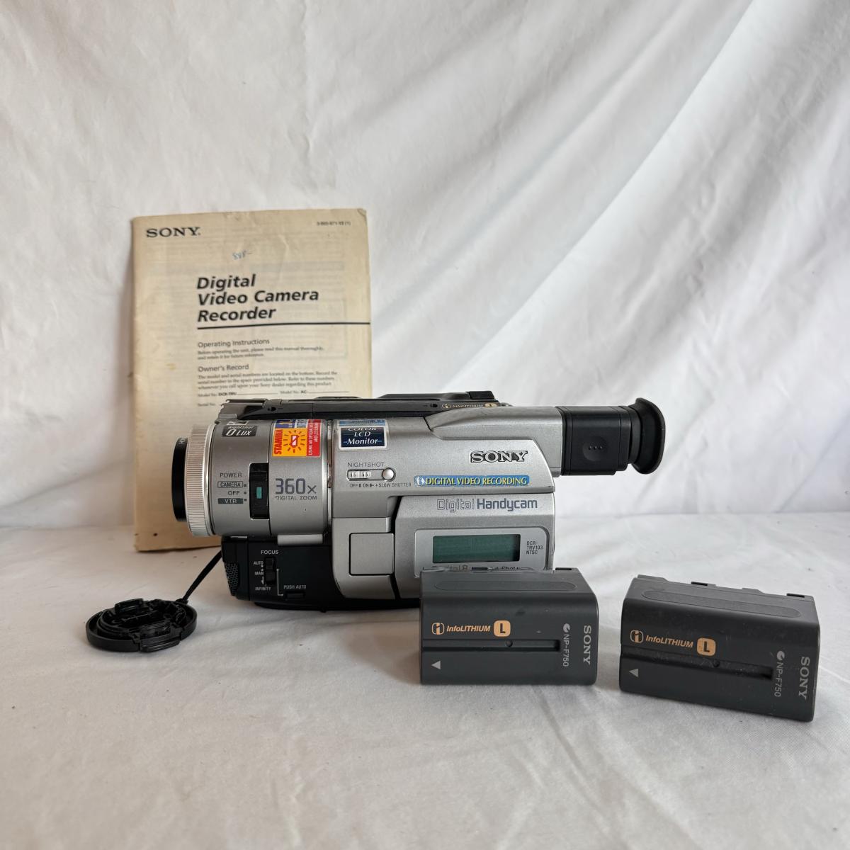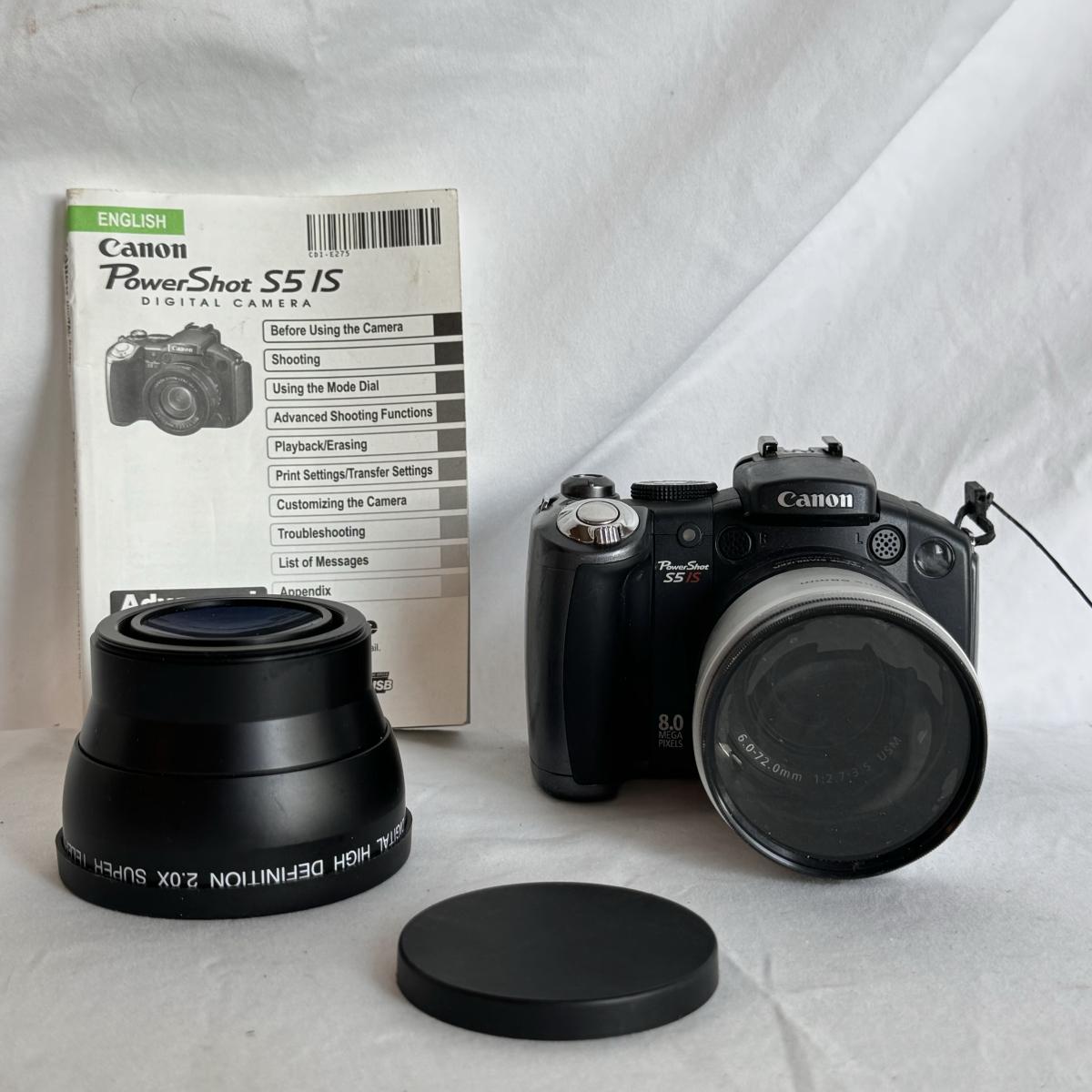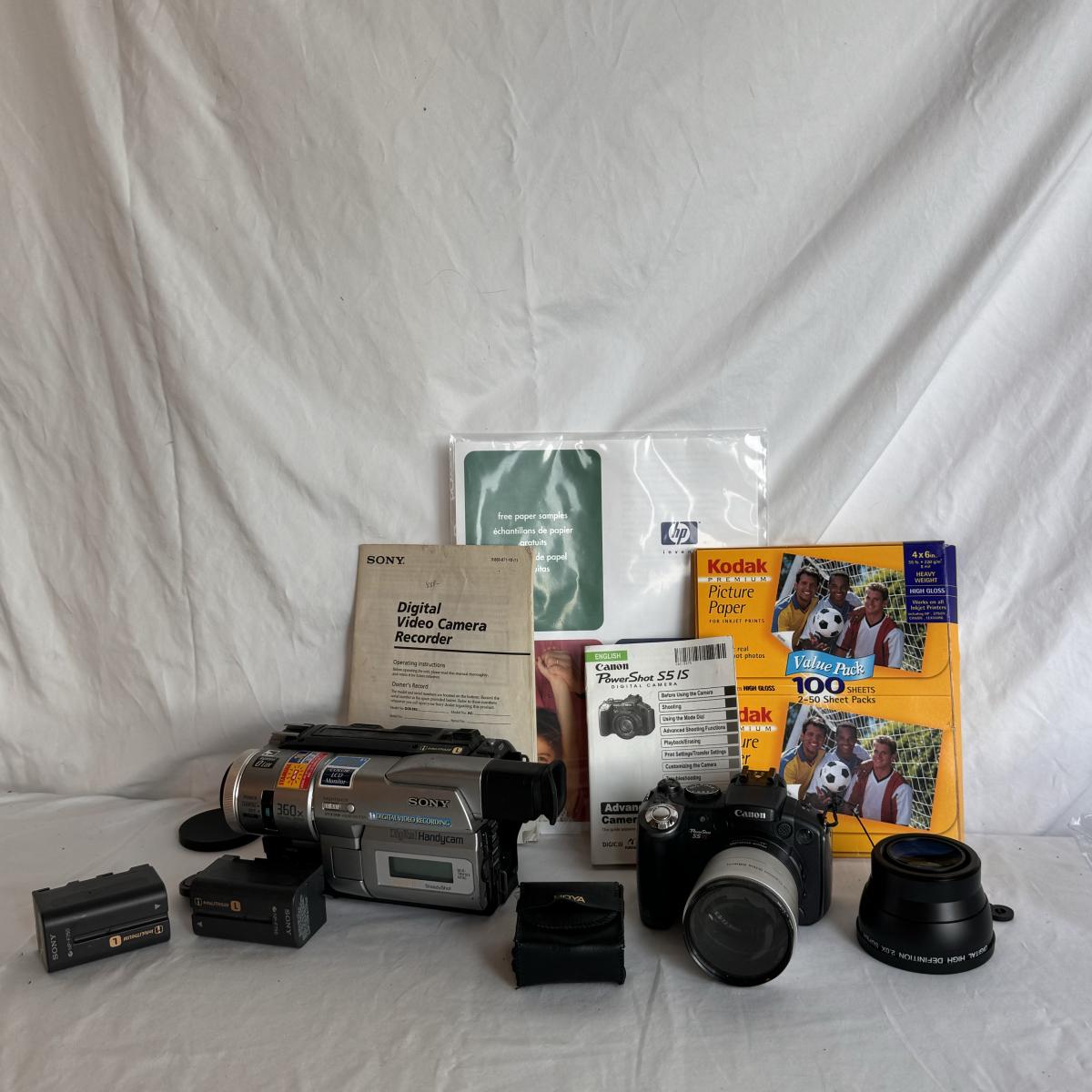 This lot includes one Canon PowerShot S5IS digital camera and one Sony Digital video camera recorder. There are a few accessories to go with these two items, including some lenses, instruction manuals, two batteries for the Sony recorder, and photo printing paper. The Canon’s screen has several scratch marks on it - see picture included. Cameras were not tested to check for power.