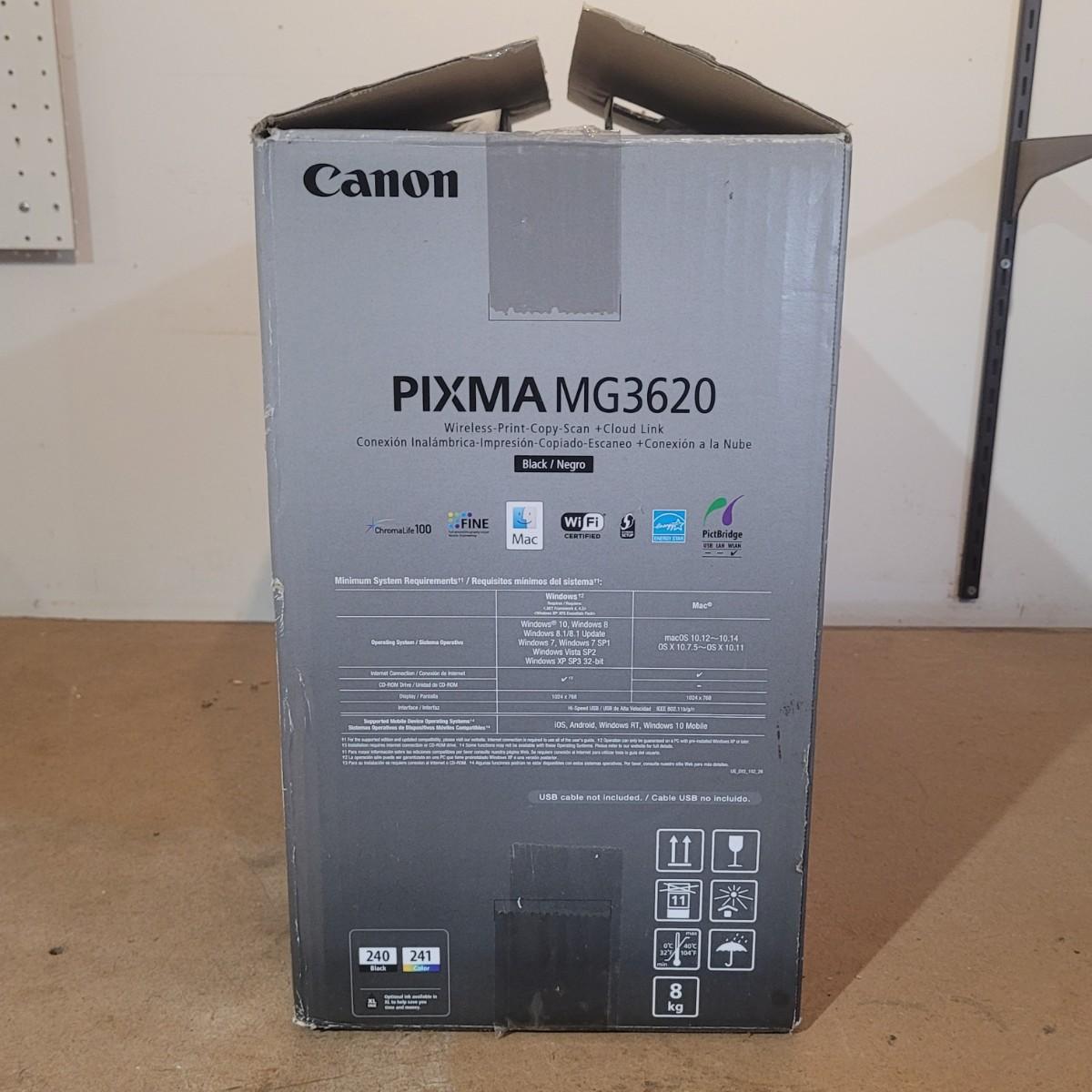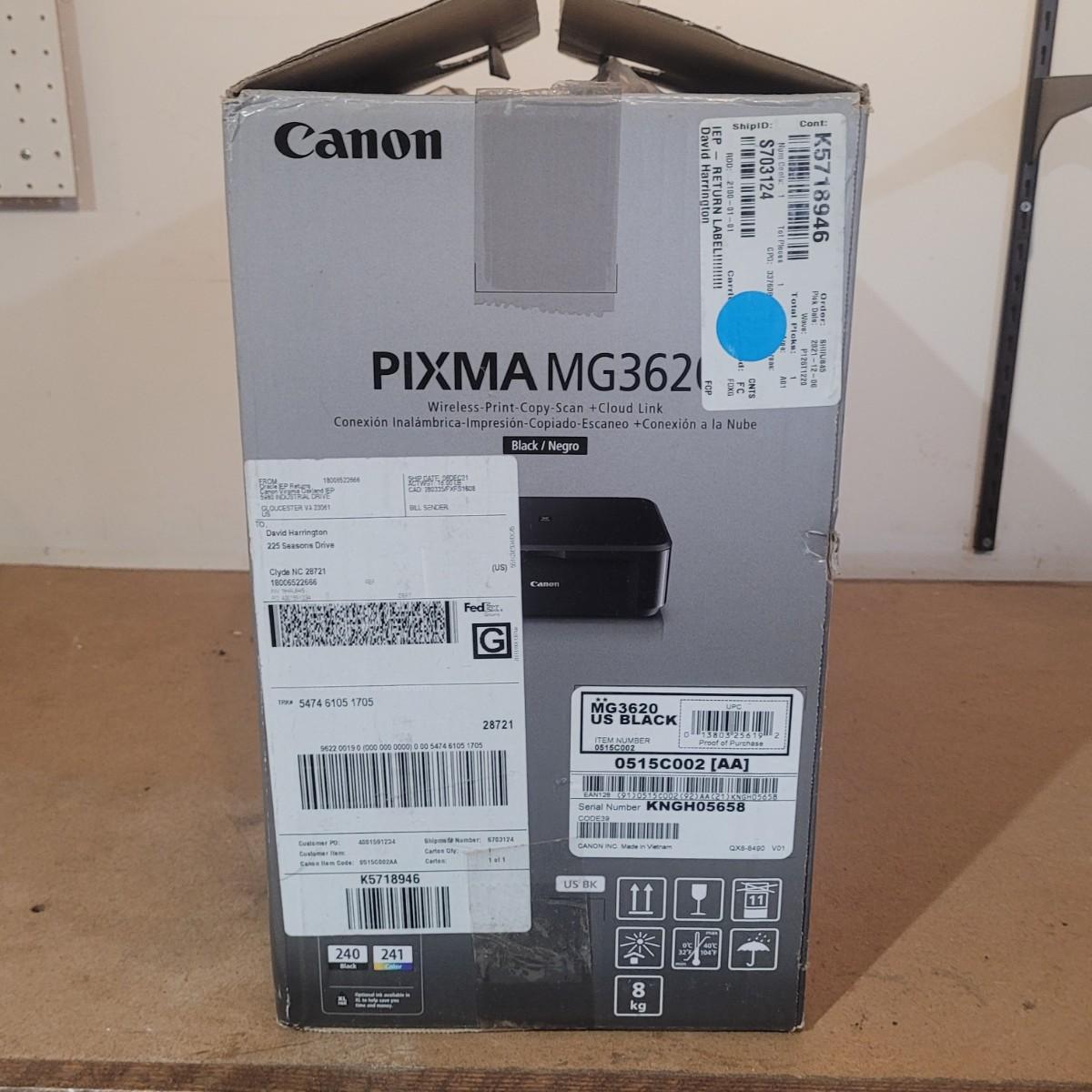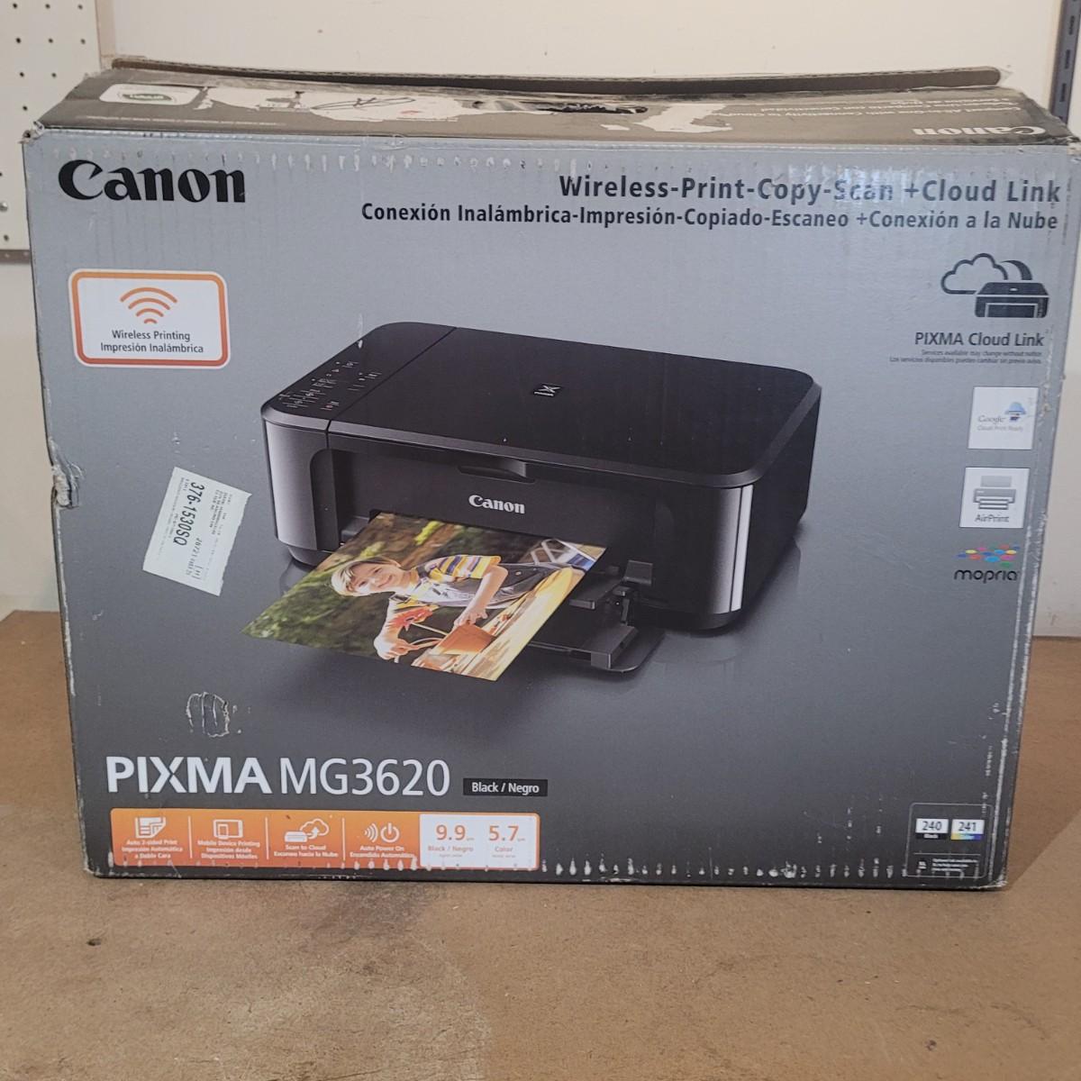 Canon brand Pixma MG3620 wireless printer, scanner, copier. Powers on when plugged in. Includes original box, power cord, instruction manual, and software. Wireless printing capabilities. Does not include ink. Box measures 19.5" x 6" x 15"H. Seller states that it has never been used.