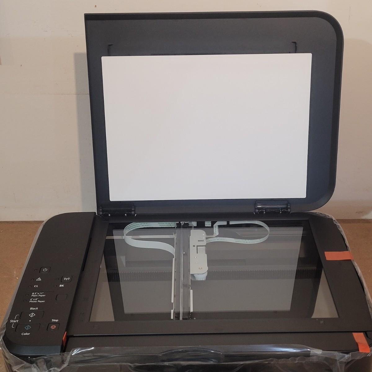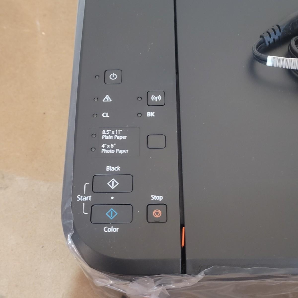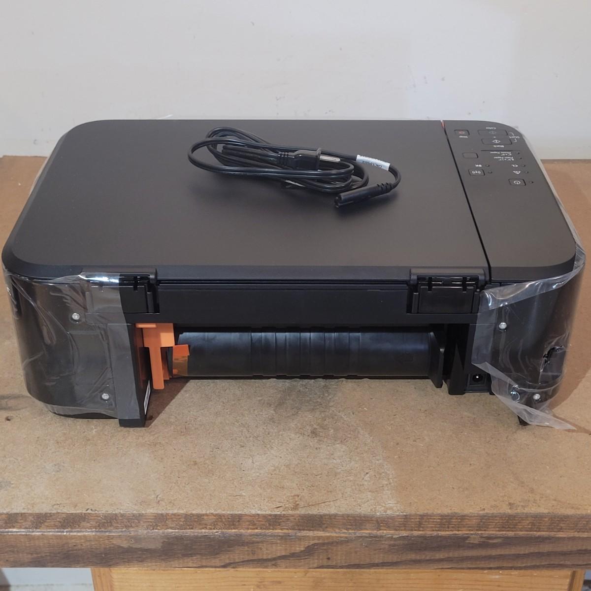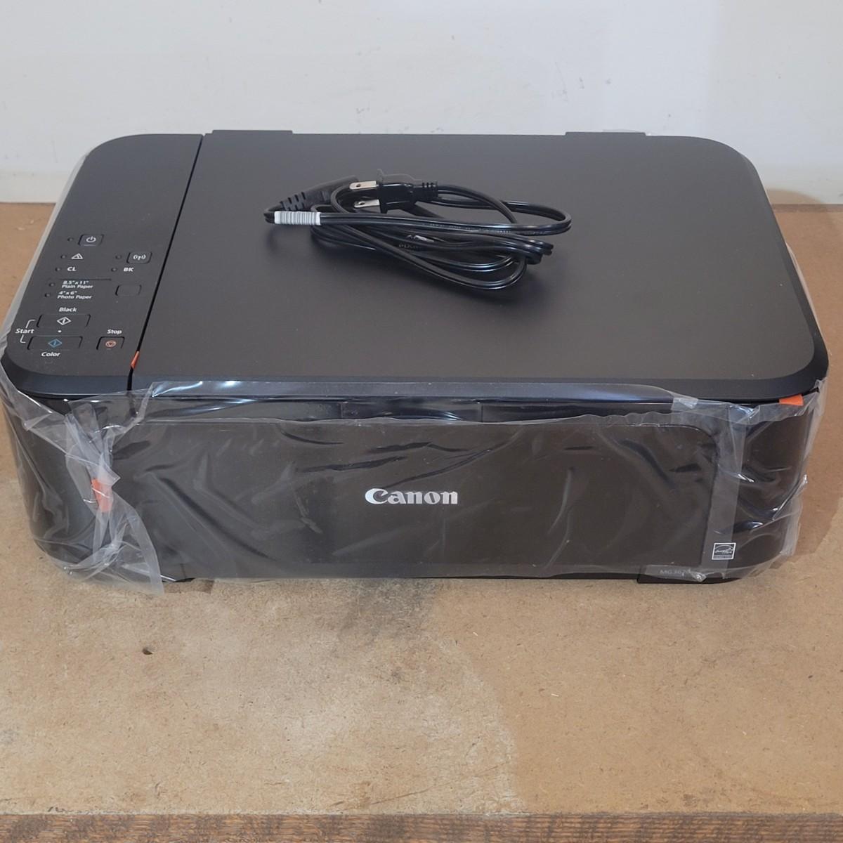 Canon brand Pixma MG3620 wireless printer, scanner, copier. Powers on when plugged in. Includes original box, power cord, instruction manual, and software. Wireless printing capabilities. Does not include ink. Box measures 19.5" x 6" x 15"H. Seller states that it has never been used.