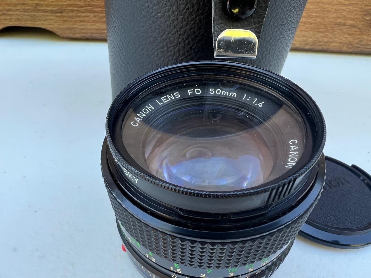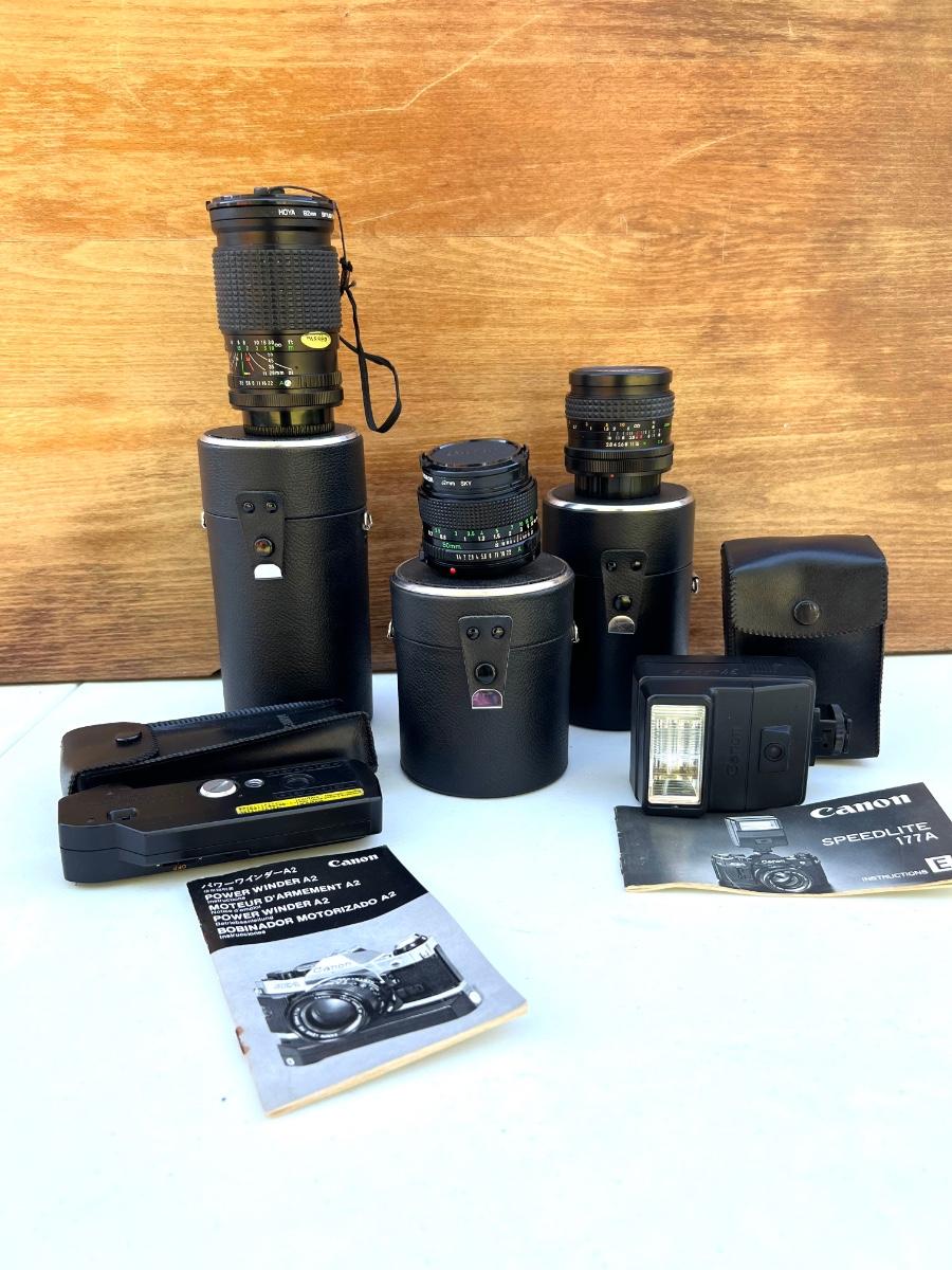 Camelot Canon lens FD 50mm 1:1.4. TAMRON. STARBLITZ MACRO 1:3.5-5.5 Hoya. Super ALBINAR 1:2.8 Sears skylight. Canon speedlite 177A. Canon Power Winder A2