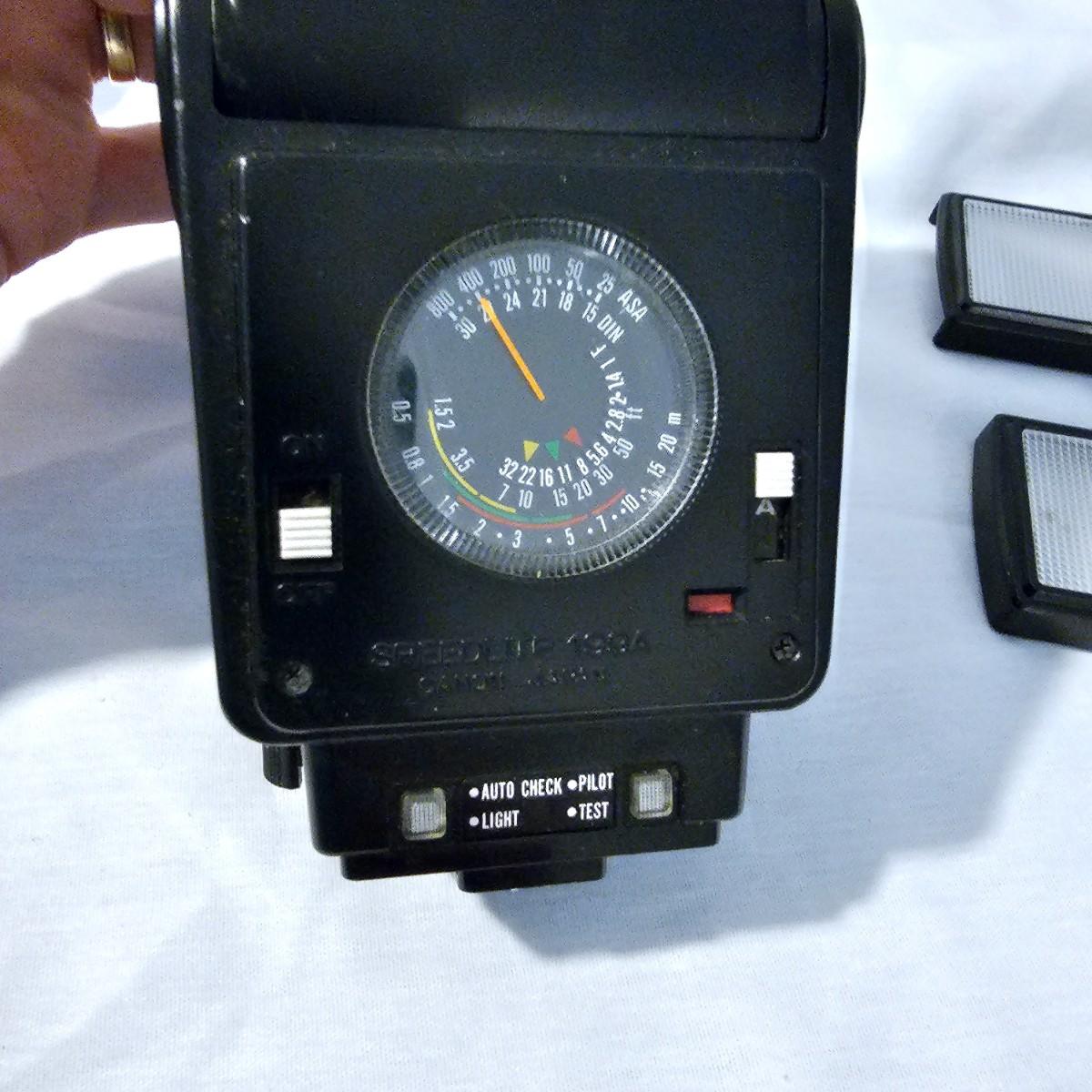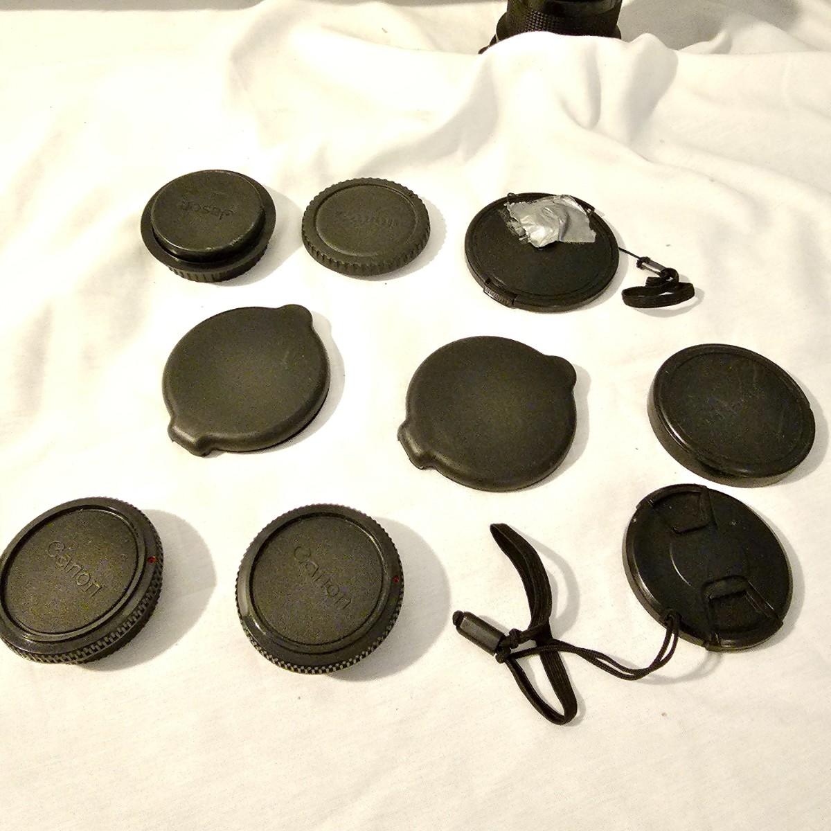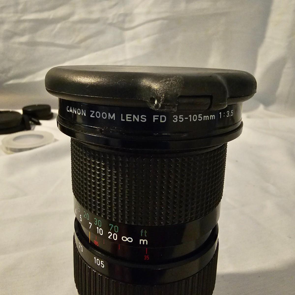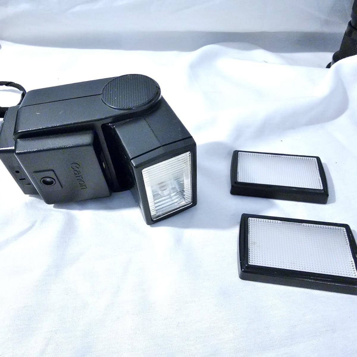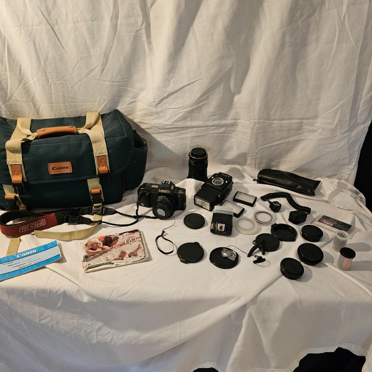 One Canon T-70 35mm body and many accessories. One 50mm FD f1:1.8 lens with Skylight 1A filter. One Canon Zoom Lens FD 35-105mm f1:3.5. Two Canon Speedlite flash units, one 270EX and a 199A unit with two diffuser lenses. Also includes one offshoe side cord w/pouch, several extra lens covers, two extra skylight filters and a large carry bag for all the gear. Bag measures 22"x 12" x 10"H. Could not test items. One battery stuck in camera. See photos for details. Shipping available.