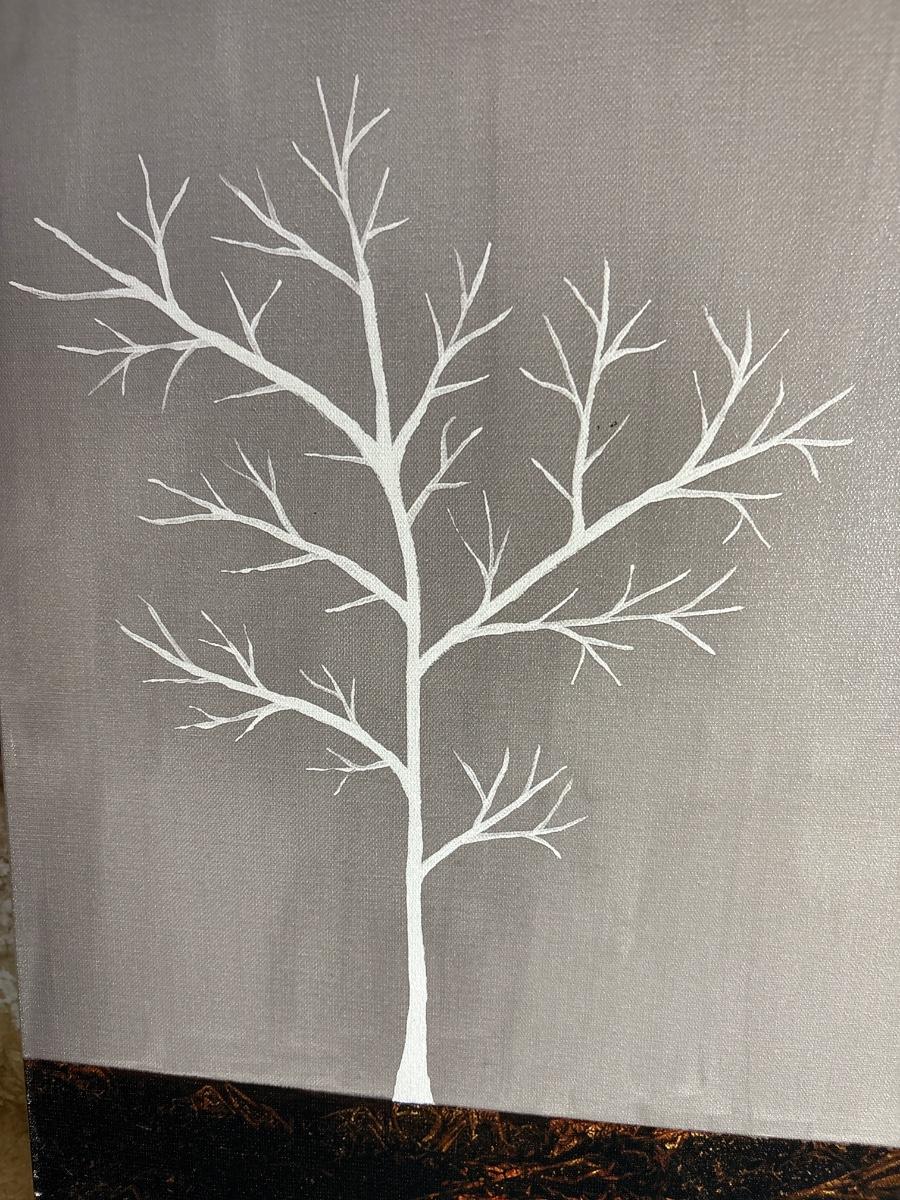 Canvas art display a single tree leafless and underground roots. Piece measures 18” x 24”