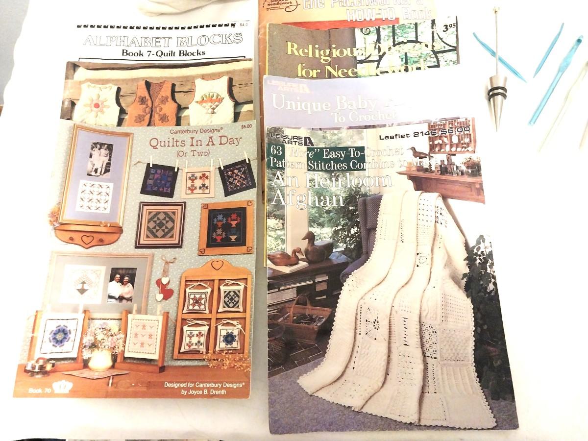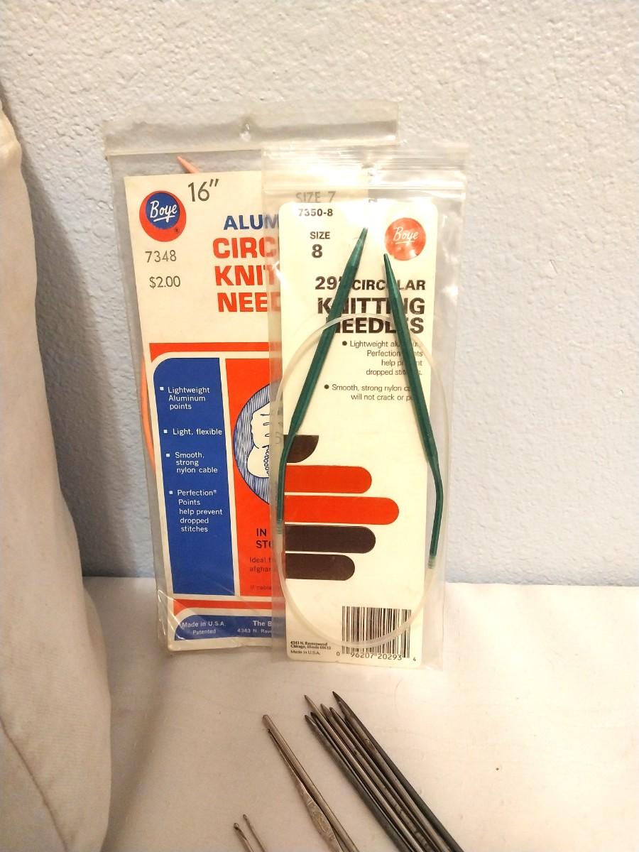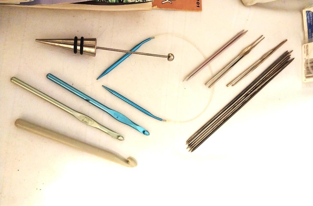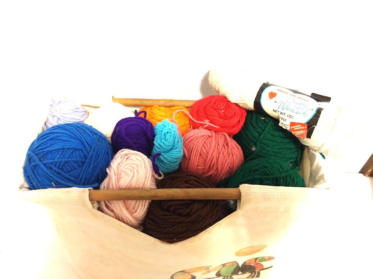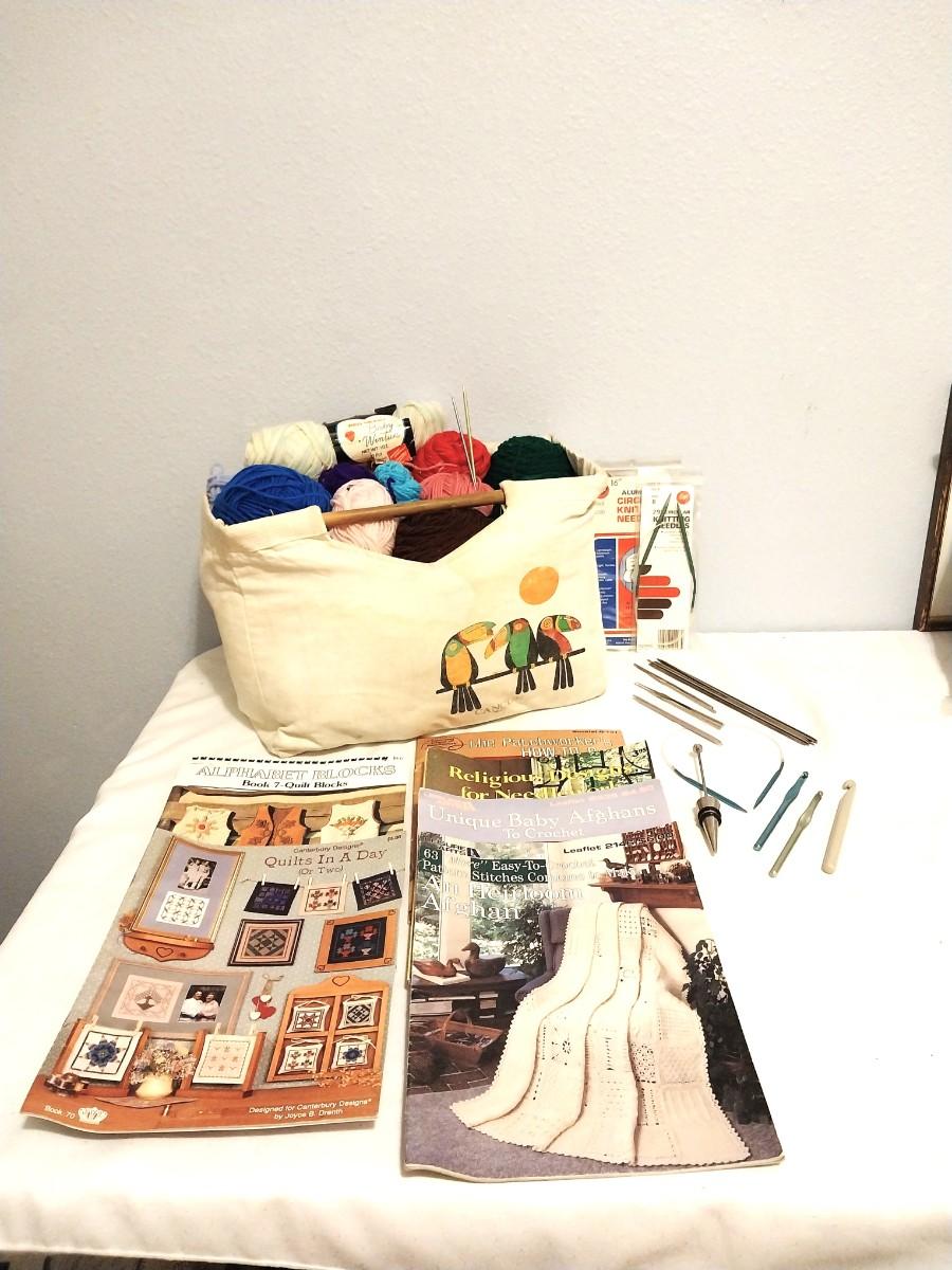 .CANVAS BAG FULL OF YARN=KNITTING NEEDLES AND PROJECT BOOKLETS