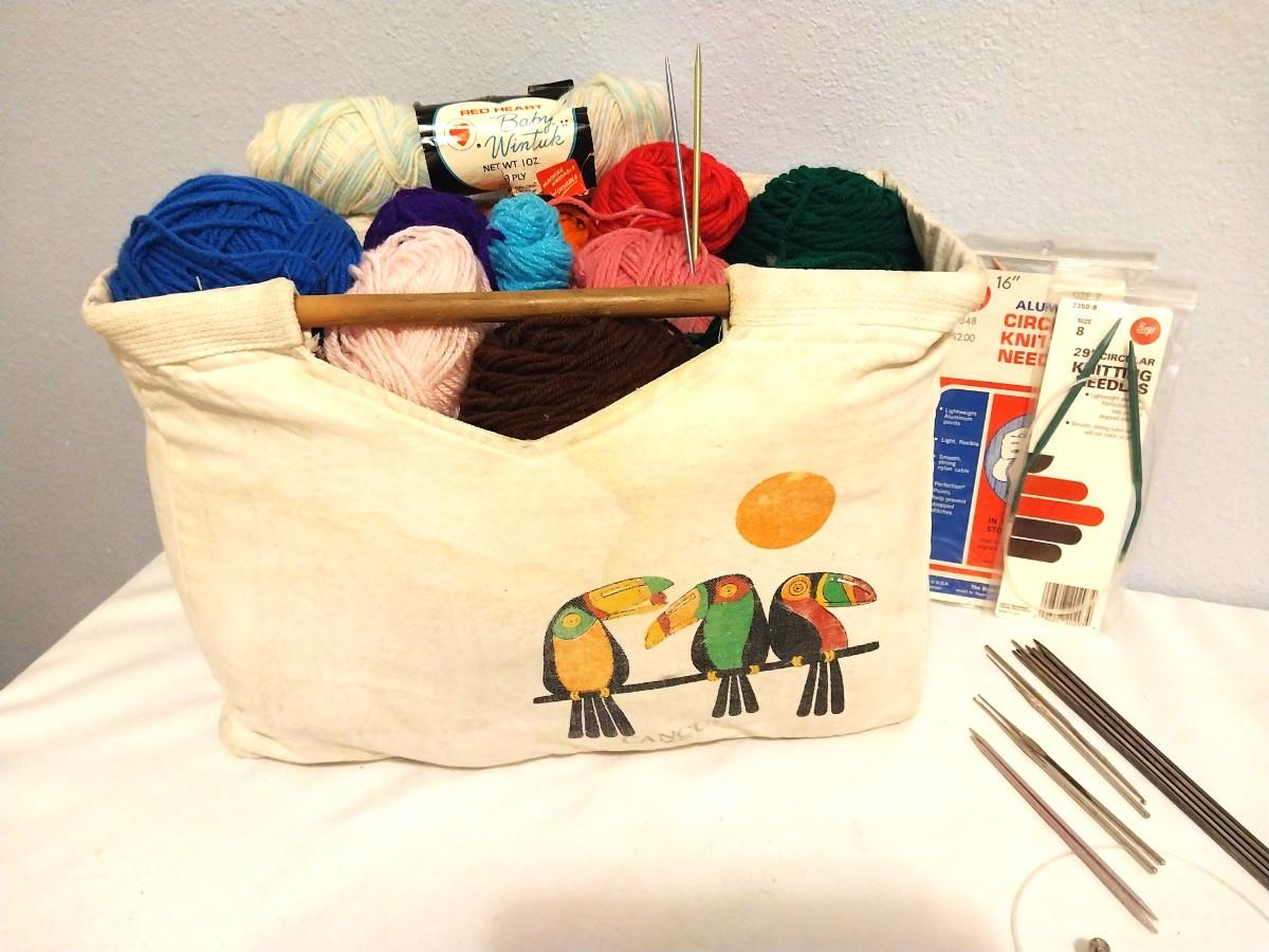 CANVAS BAG FULL OF YARN=KNITTING NEEDLES AND PROJECT BOOKLETS