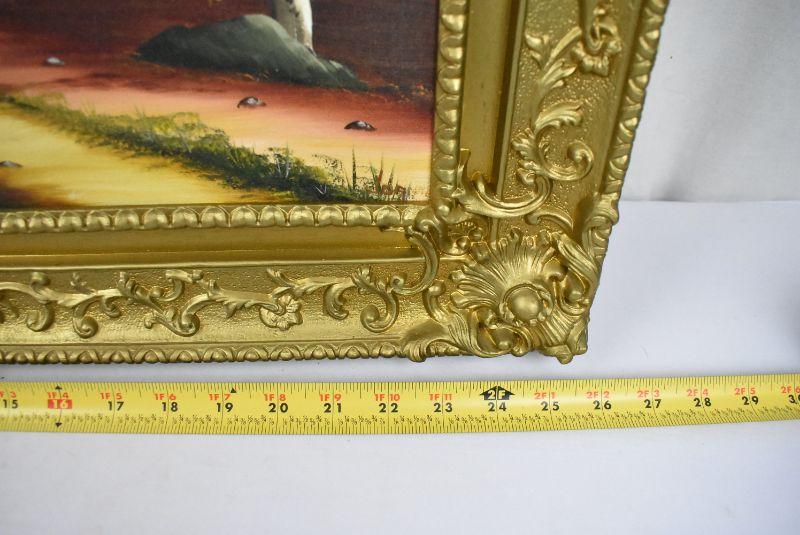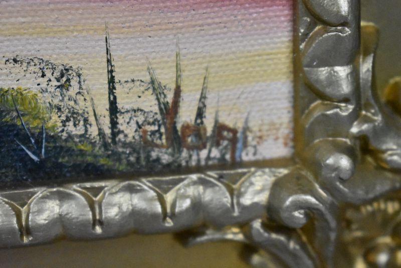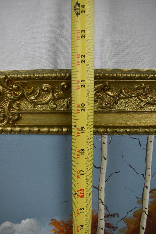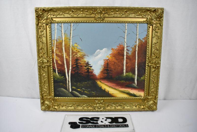Canvas Fall Trees Painting in Gold Toned Frame (plastic). Sign Joanne
