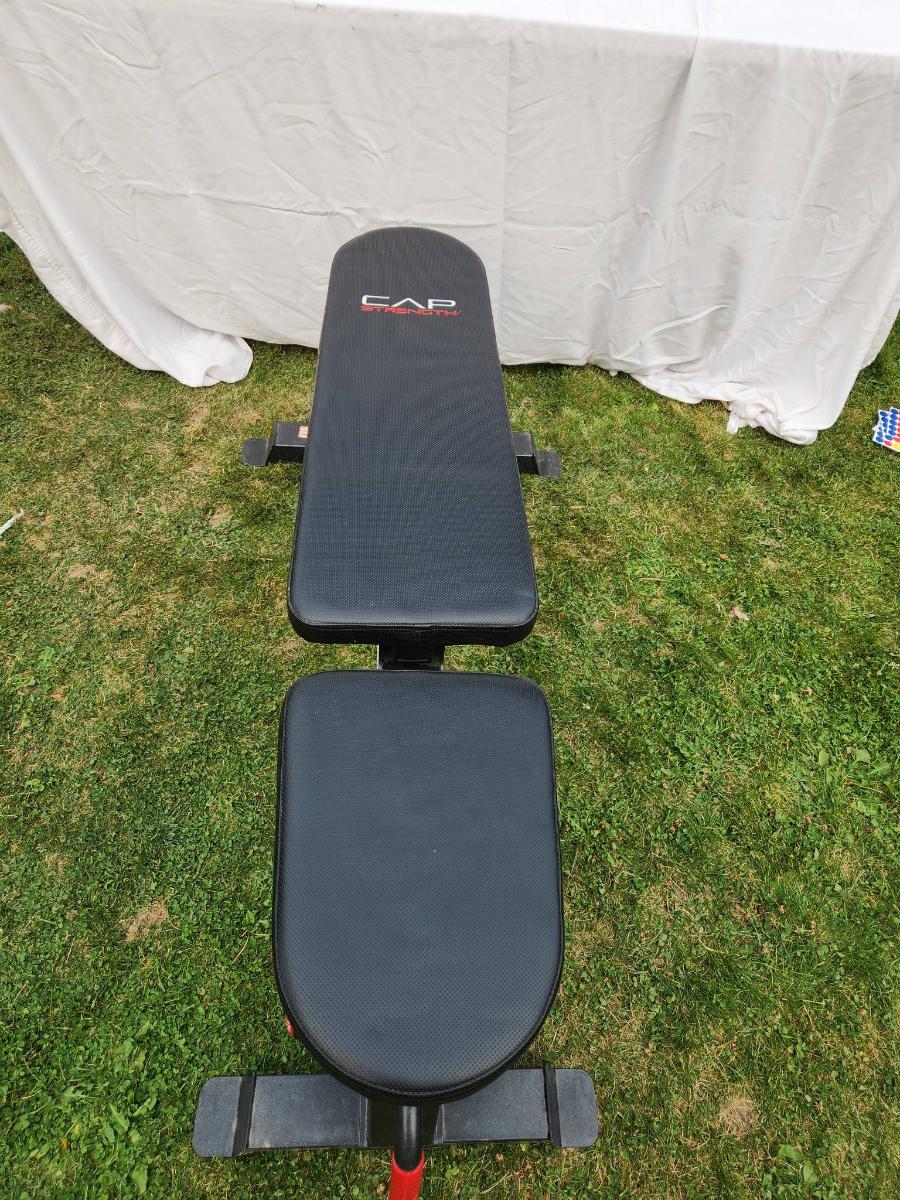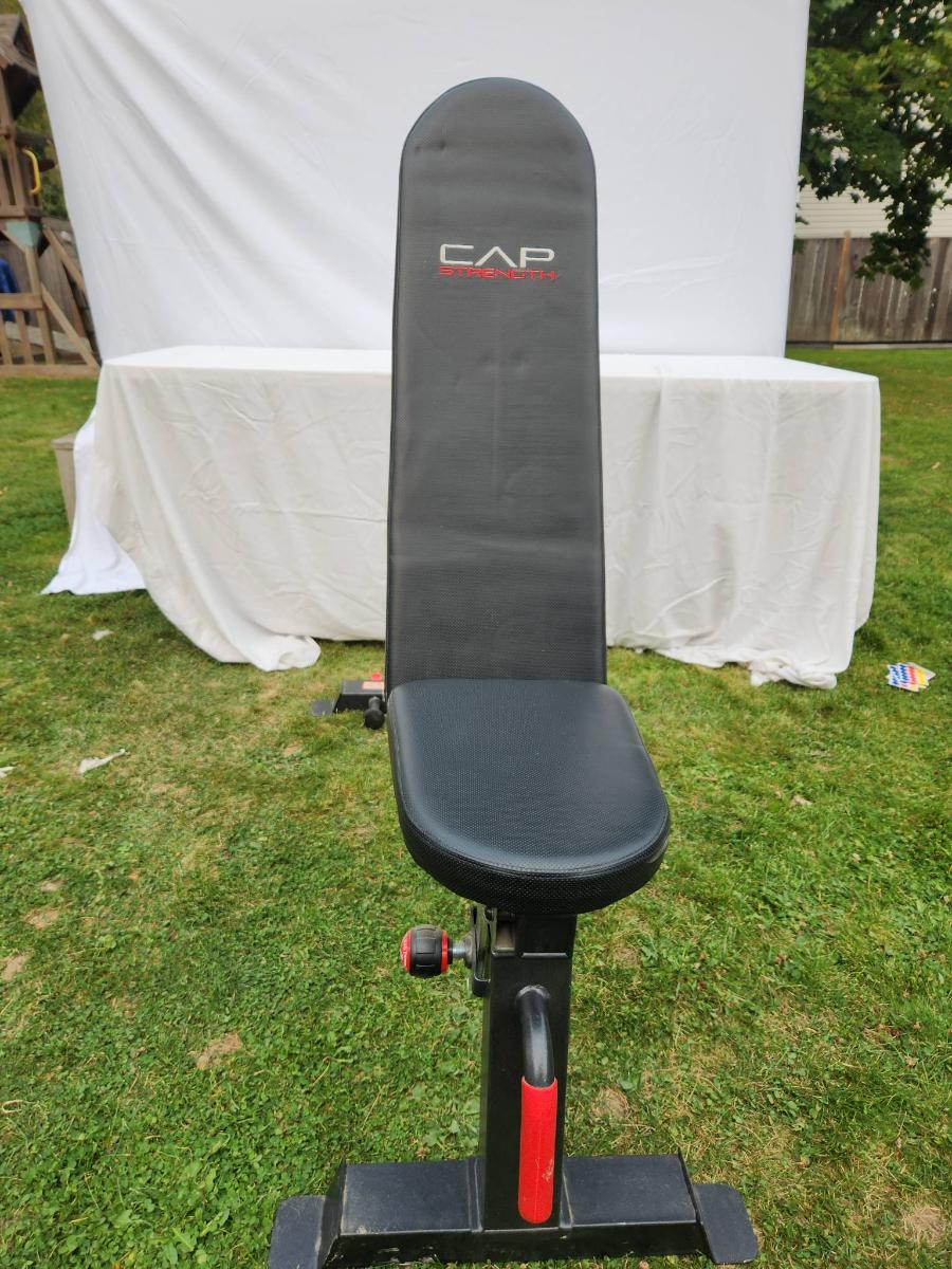 CAP Strength adjustable weight bench with a durable padded seat and backrest for comfortable support during workouts. Features a sturdy steel frame with a black finish, red accents, and non-slip foot caps for stability. Designed for various incline, flat, and decline positions. Suitable for strength training and compatible with other fitness equipment.