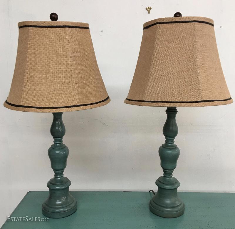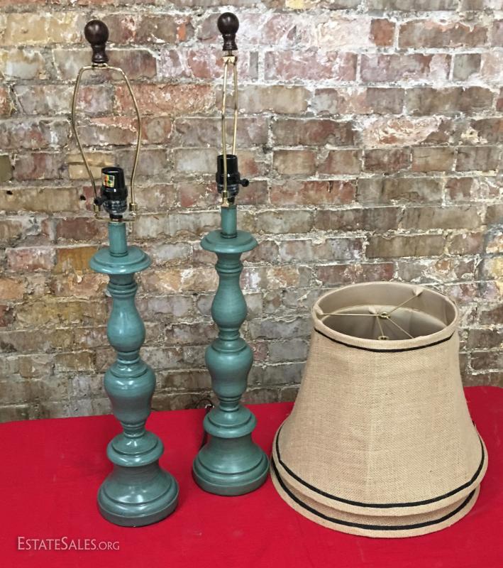 Pair of lamps with shades, 32" tall, one is cracked on the base see photos.