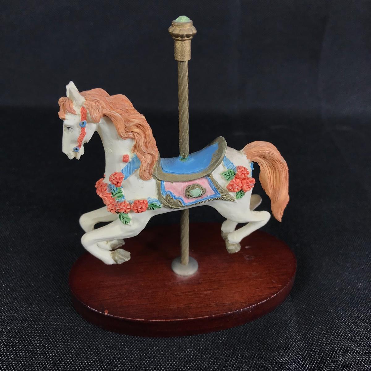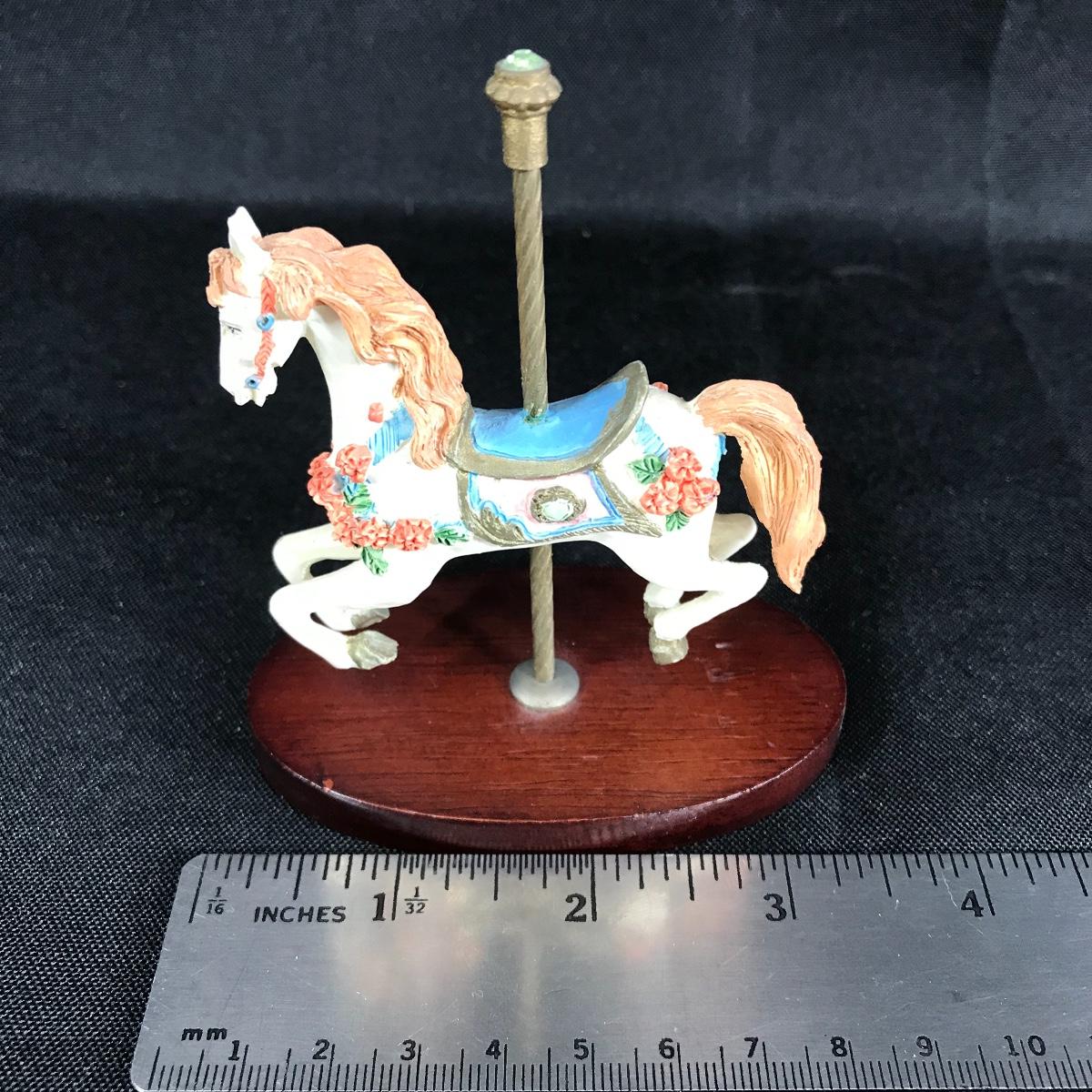 Up for auction is a carousel horse figurine. Resin on wooden base. Stands approximately 4 inches tall; see pictures.